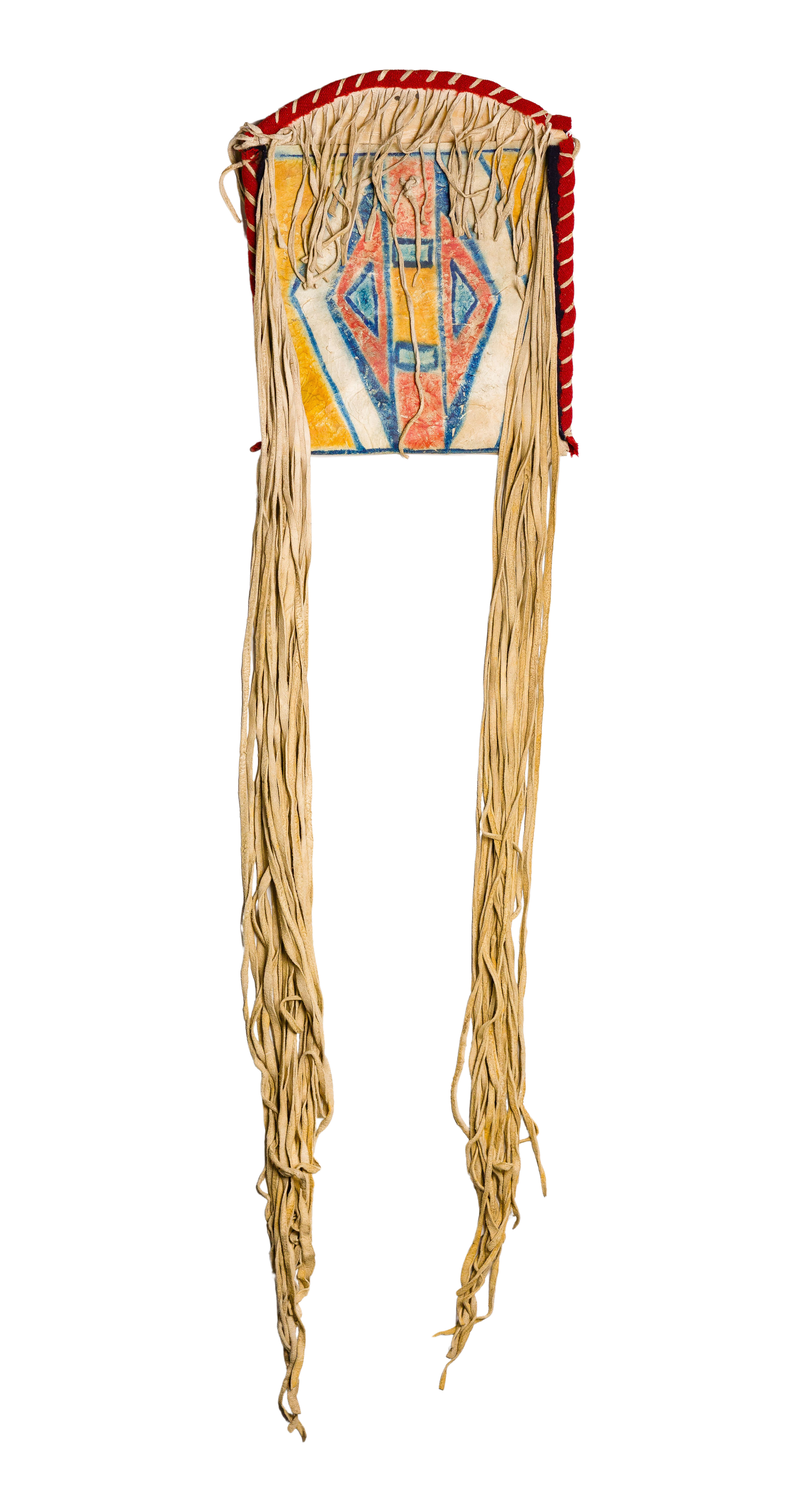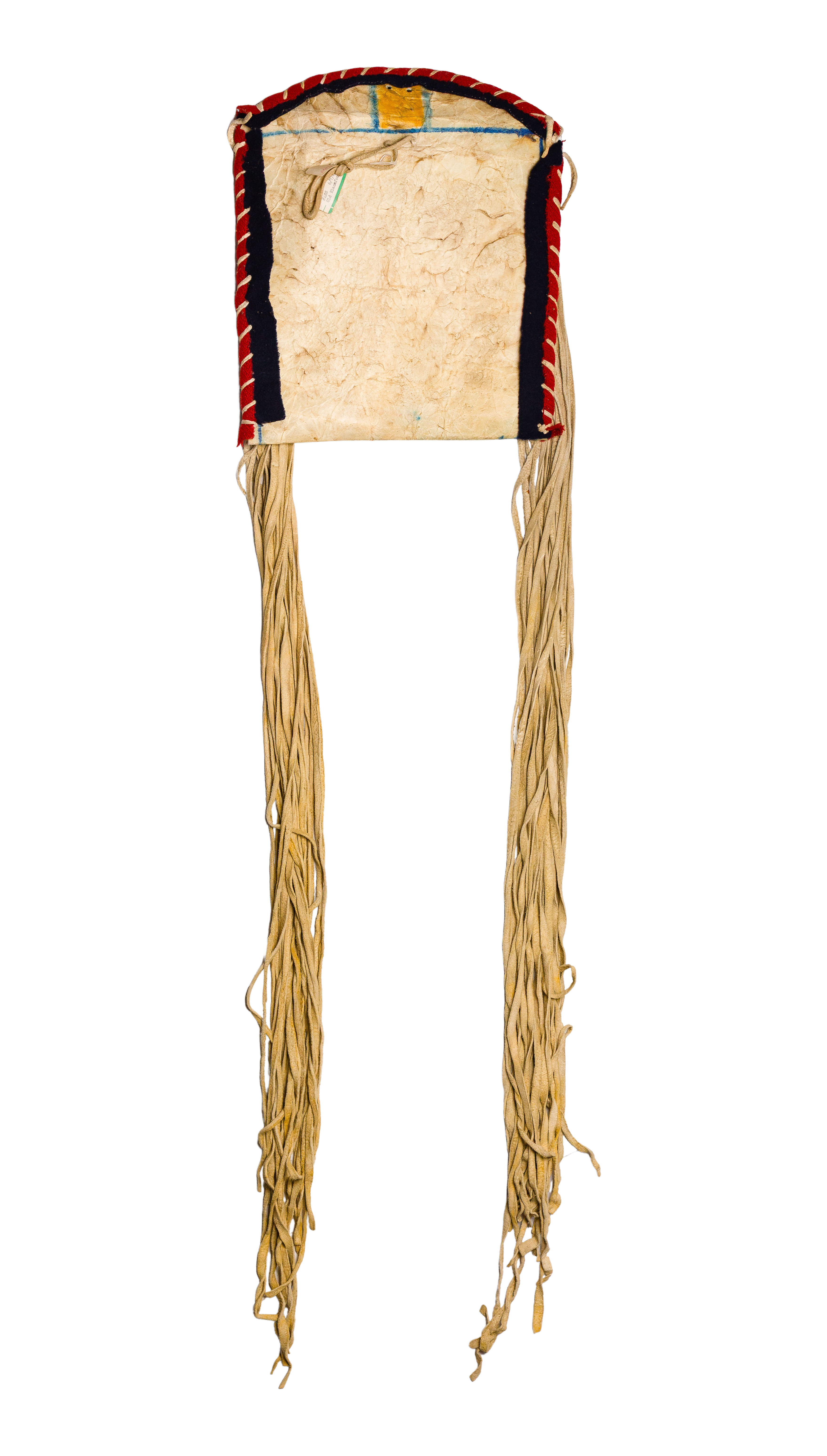 Single pocket pigment painted rawhide having blanket strip bound edges, long buckskin fringe and hanging loop on back, retaining a hang tag giving Blackfoot attribution
