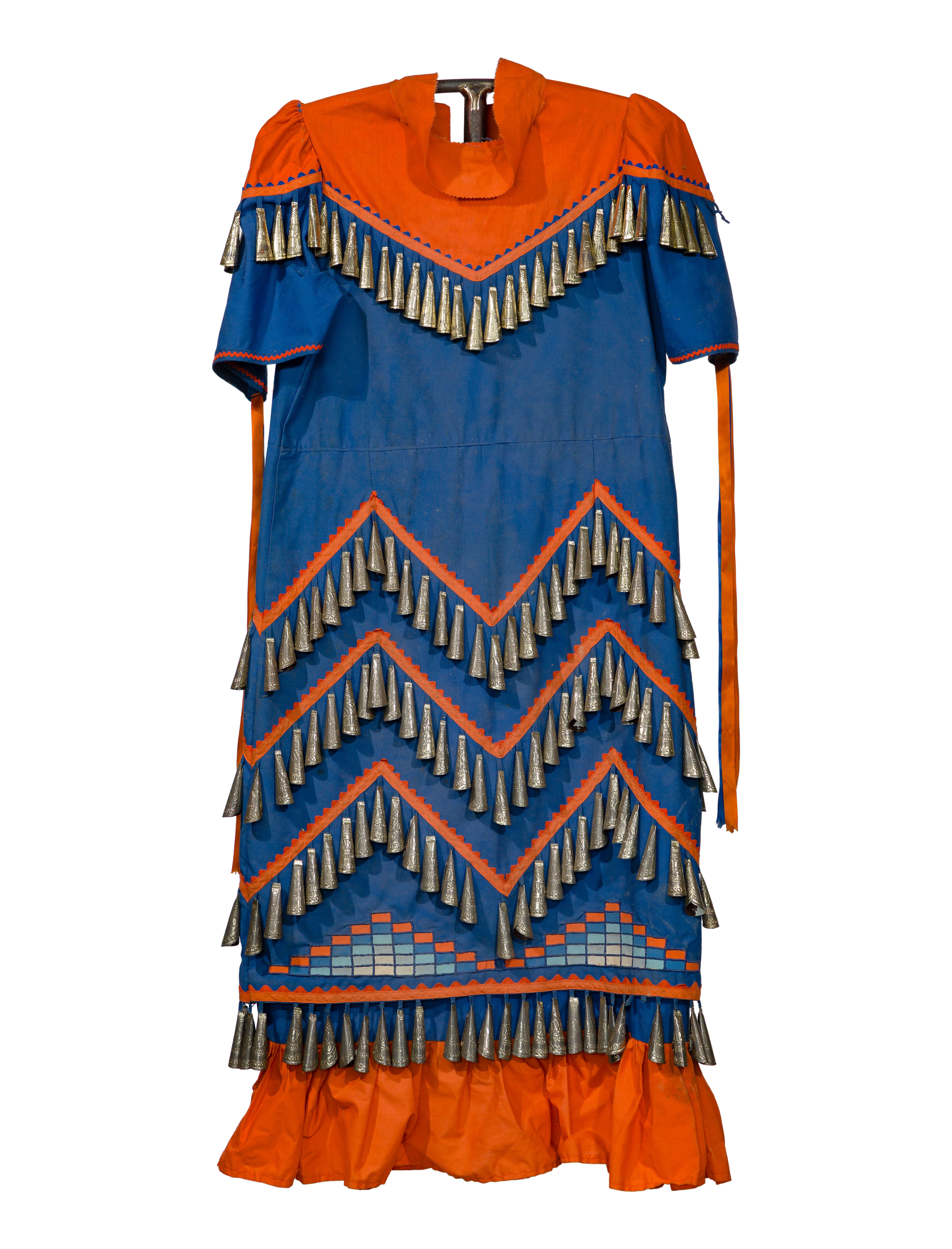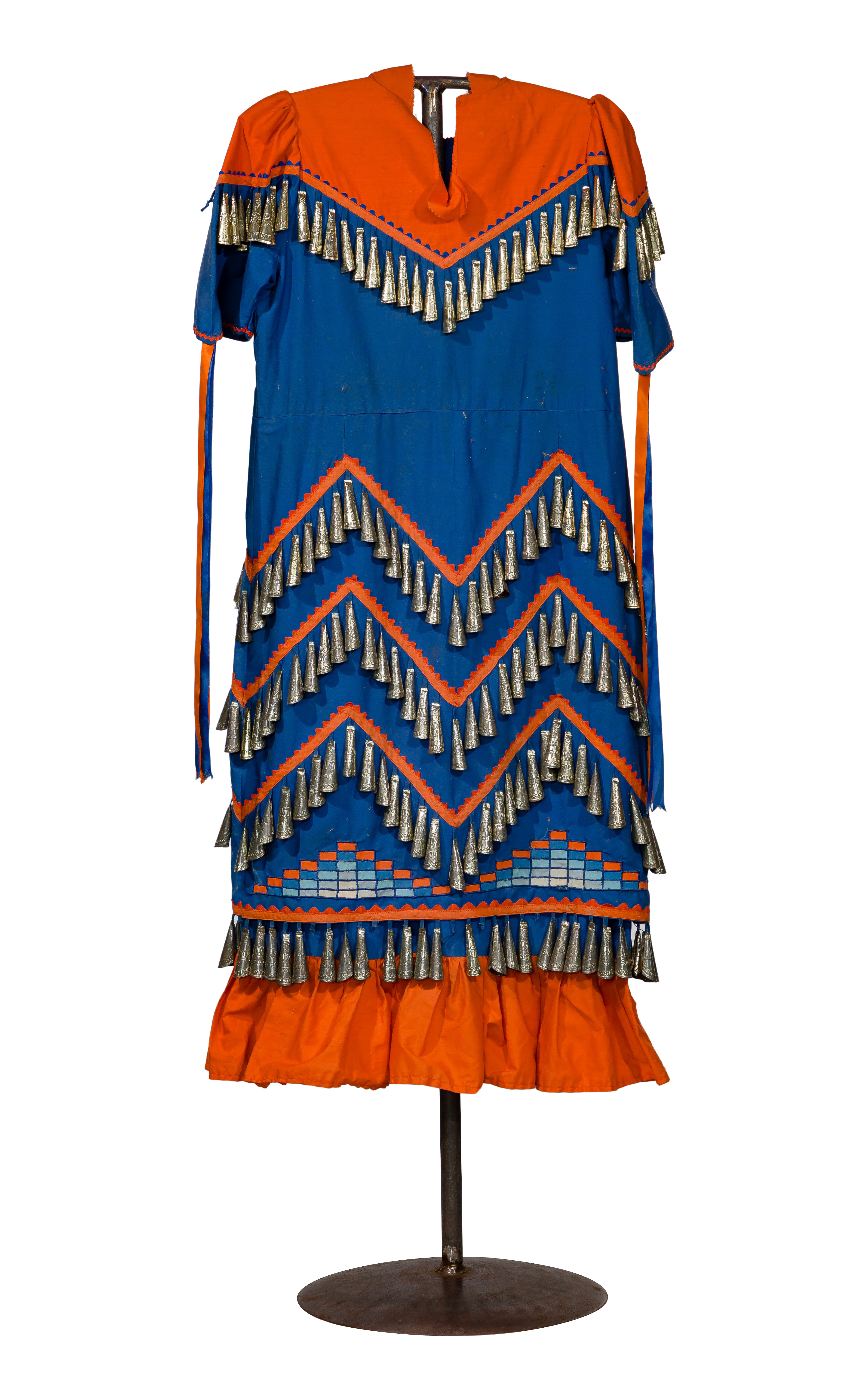 A traditional Ojibwe or Sioux dress adorned with rows of metal tobacco cones that create a tinkling / jingling sound as the wearer dances, including metal stand