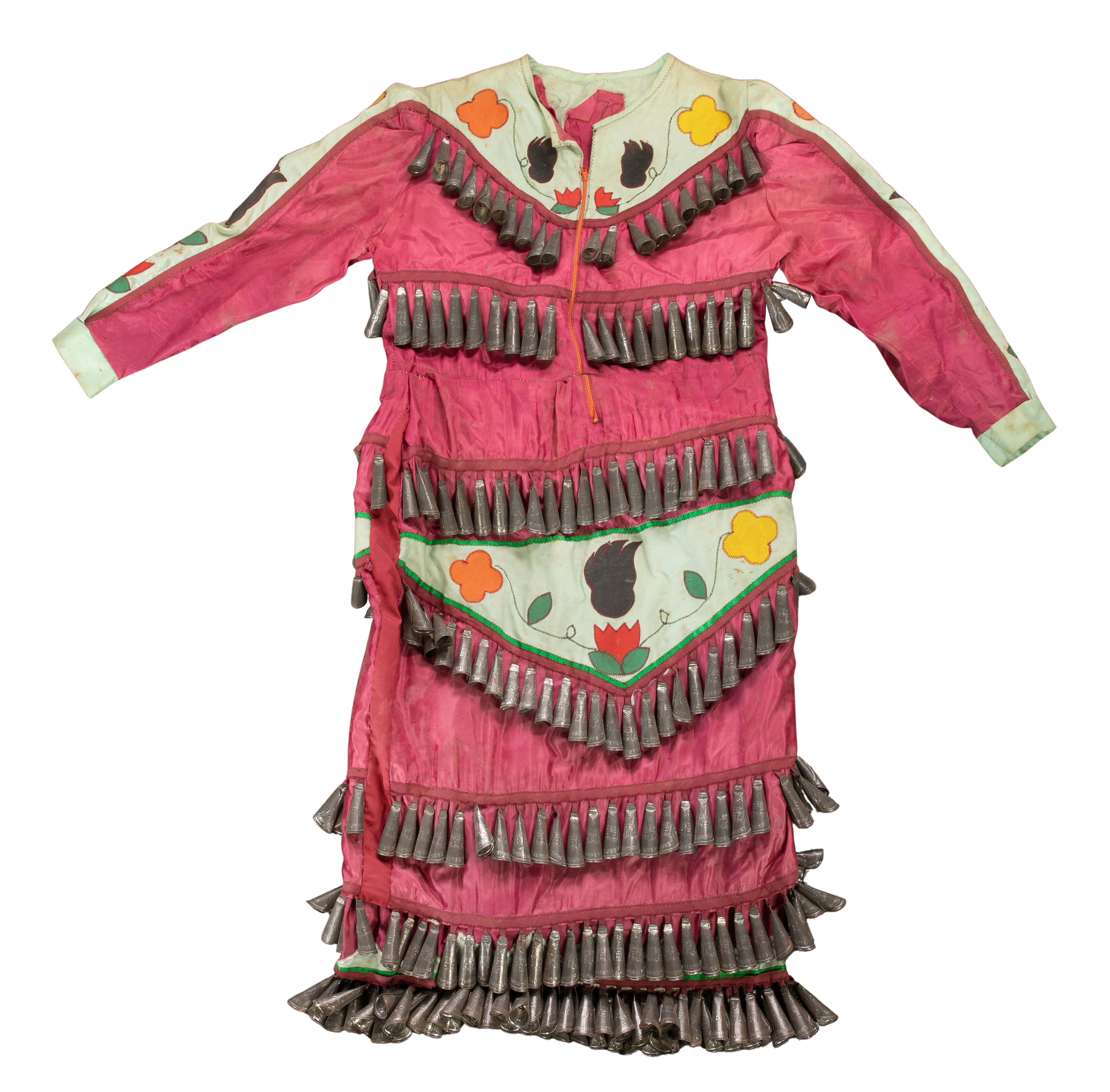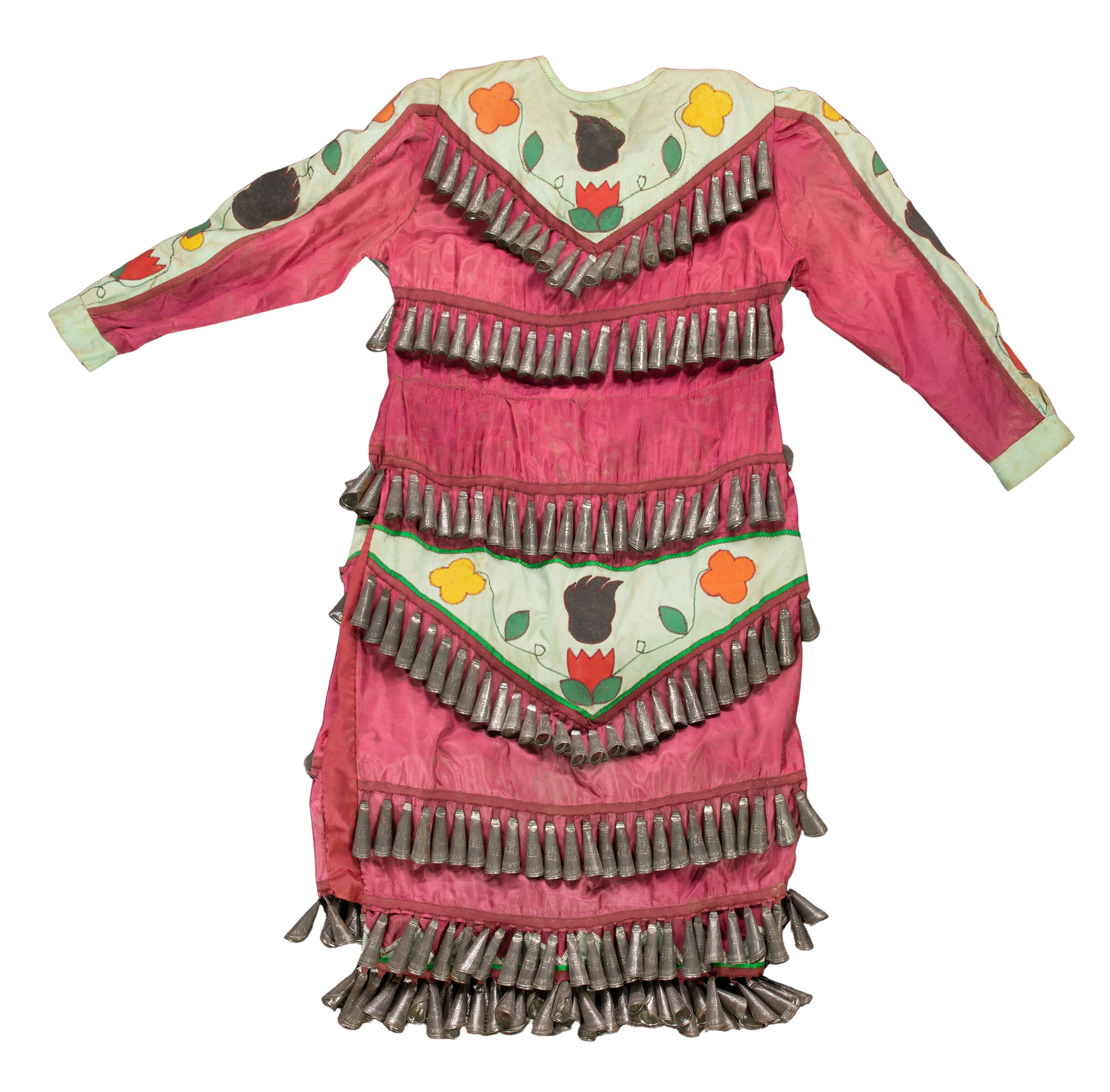 A traditional Ojibwe or Sioux dress adorned with rows of metal tobacco cones that create a tinkling / jingling sound as the wearer dances