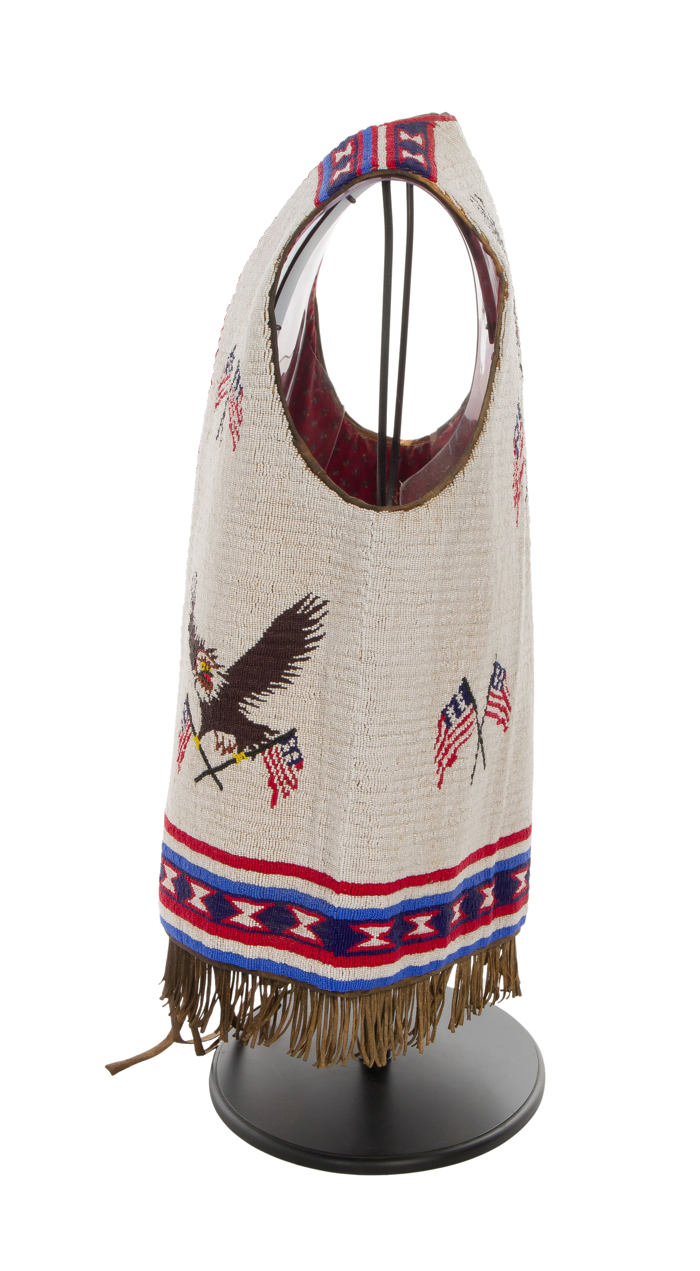 Having an eagle and American flag motif throughout, on brown hide with hanging fringe, cloth lined interior, including stand