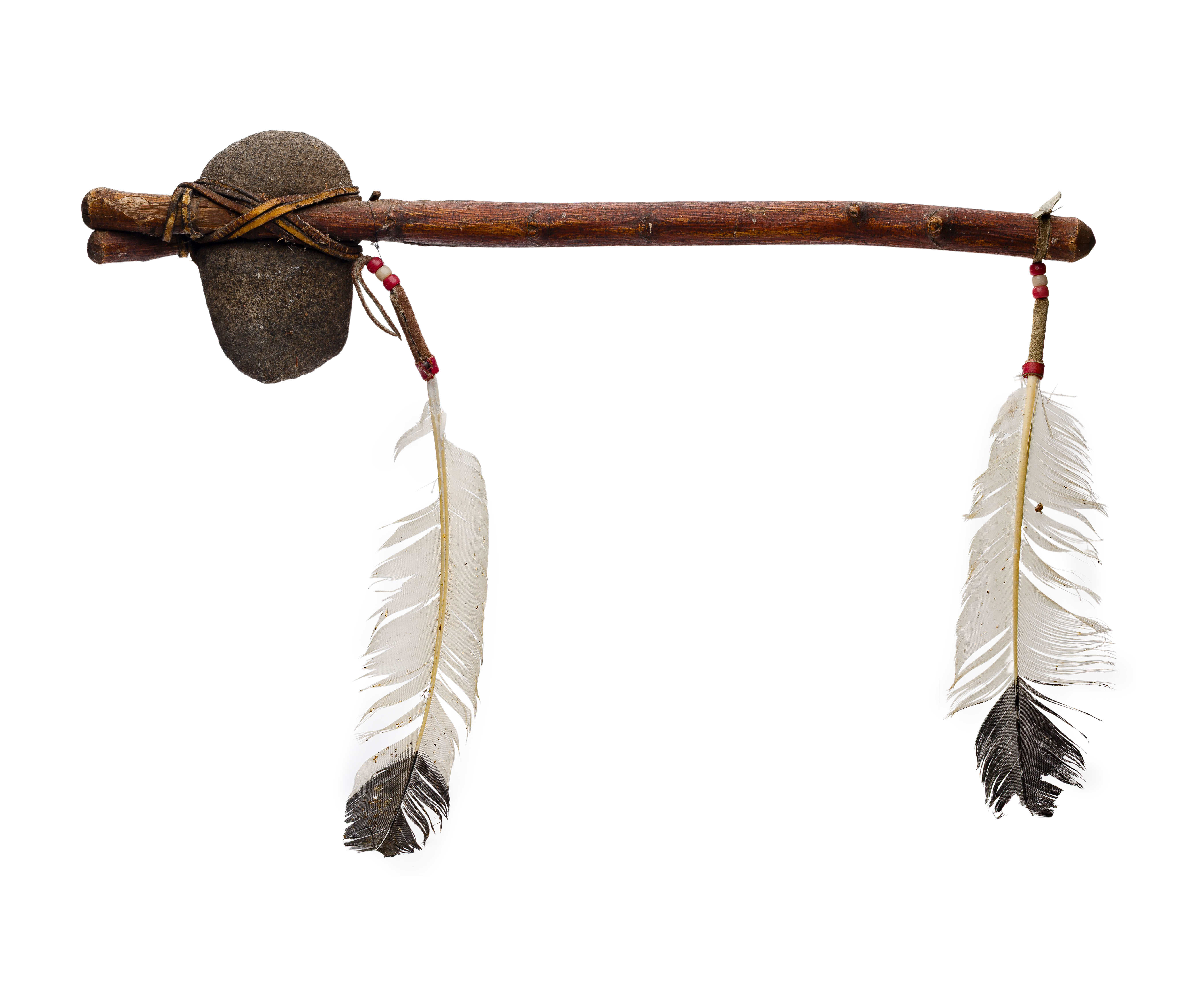 A Woodland Indian full-groove axe head fitted into a recent forked-branch handle tied using leather strips and having attached bead and leather mounted dyed domestic goose feathers