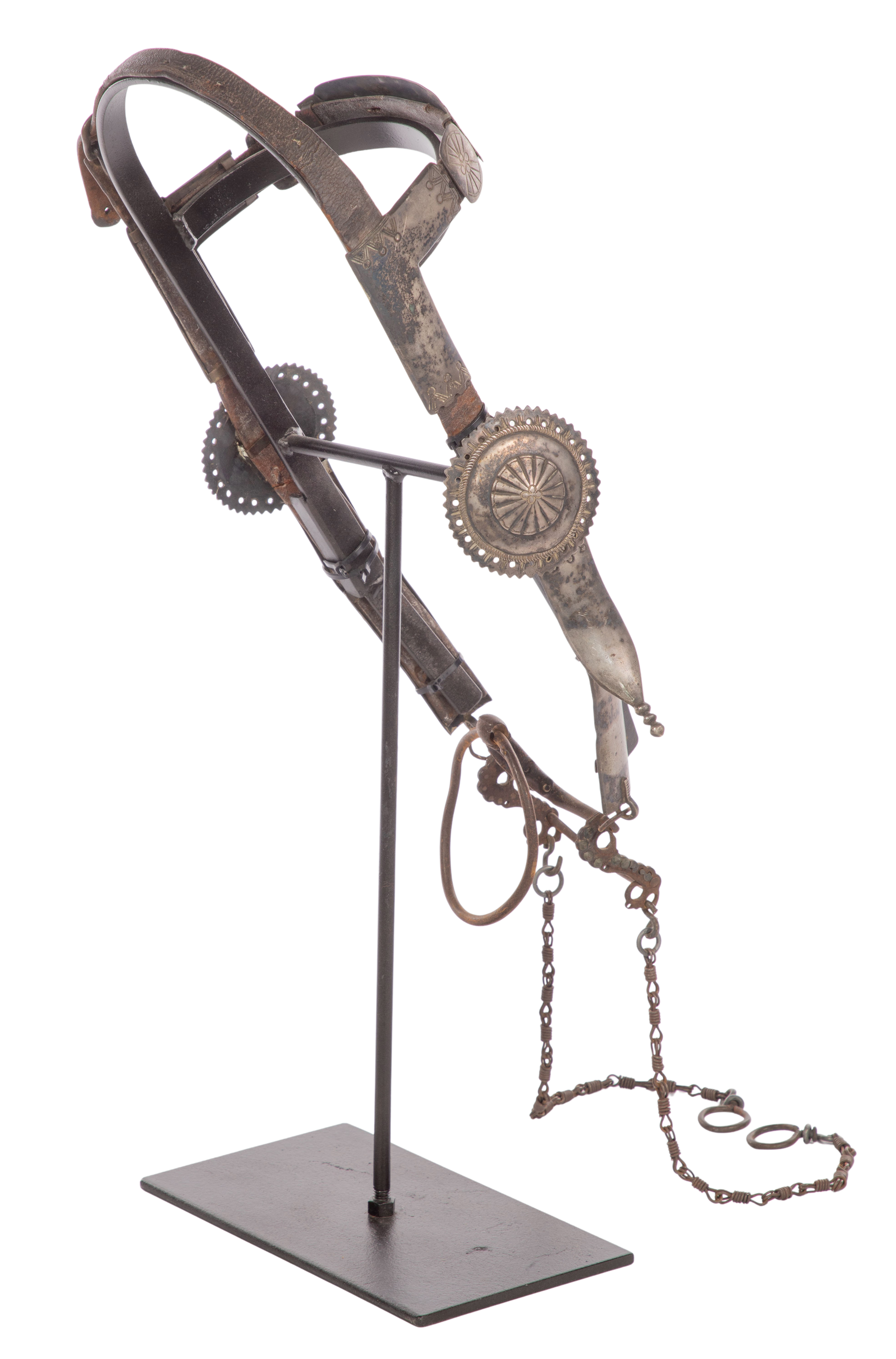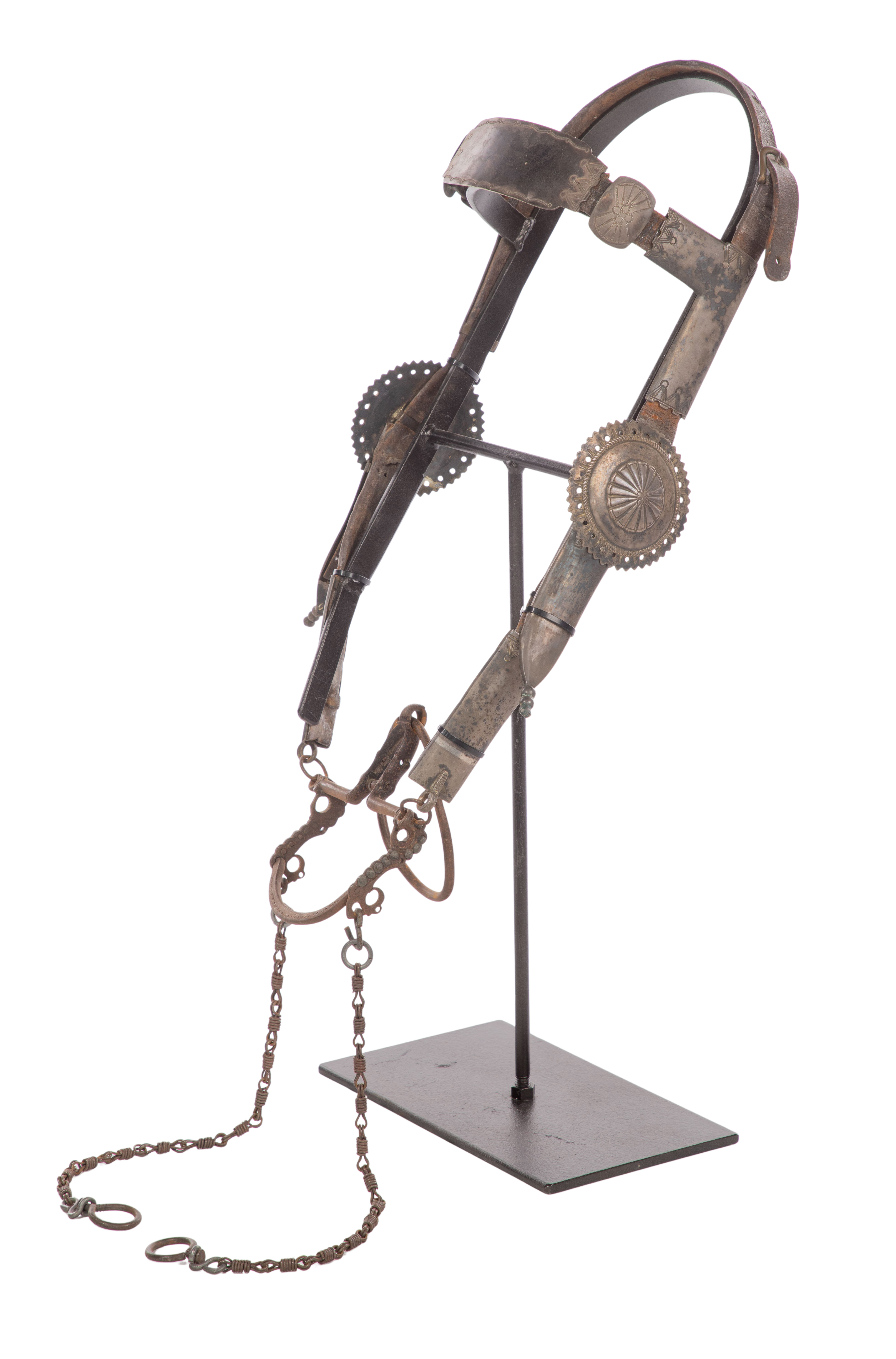Having flared silver cheek pieces, scalloped edge conchos and a stamped silver brow-band, attached to an iron ring bit, including stand and receipt