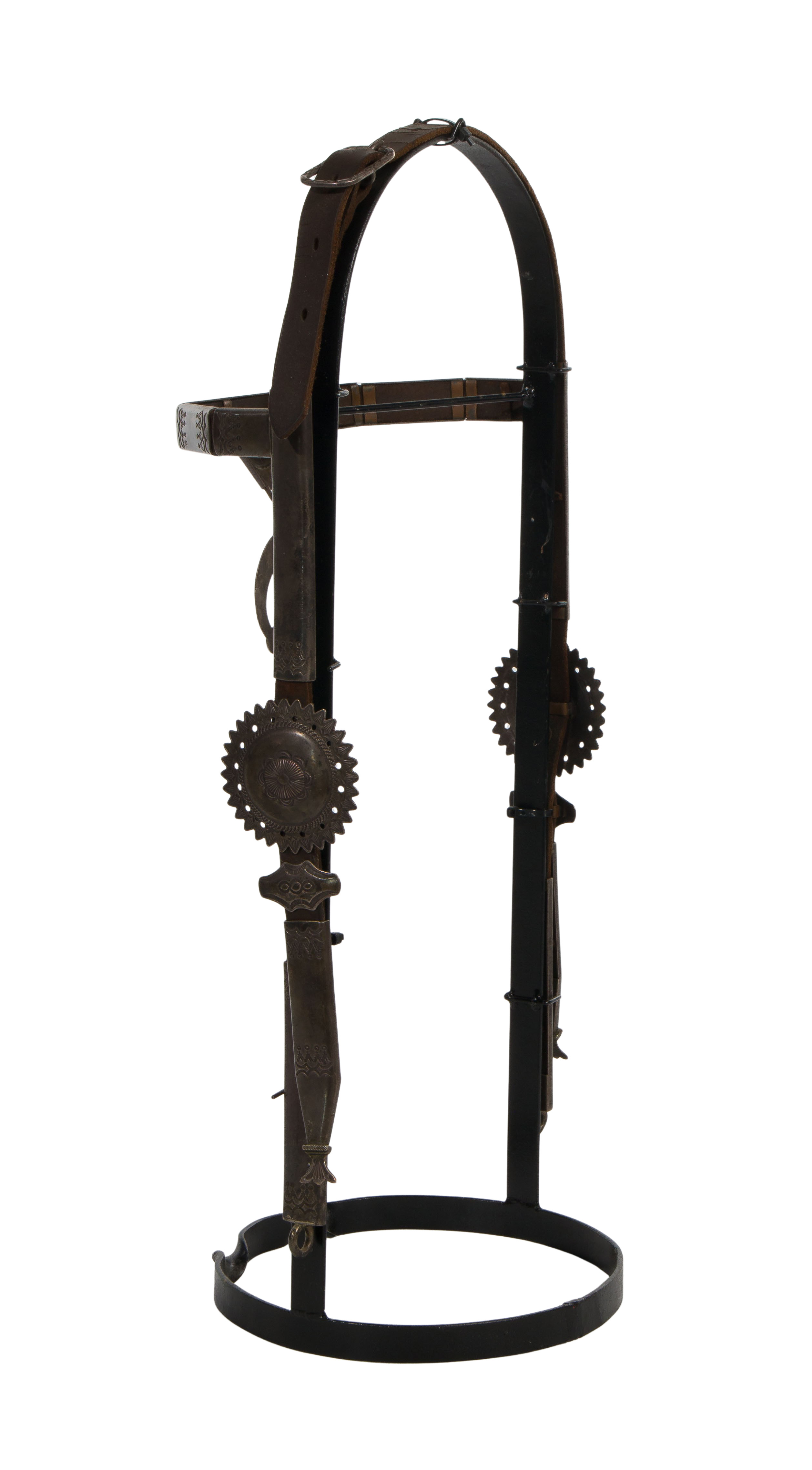 A leather head stall having stamped silver accents and a center naja, including stand