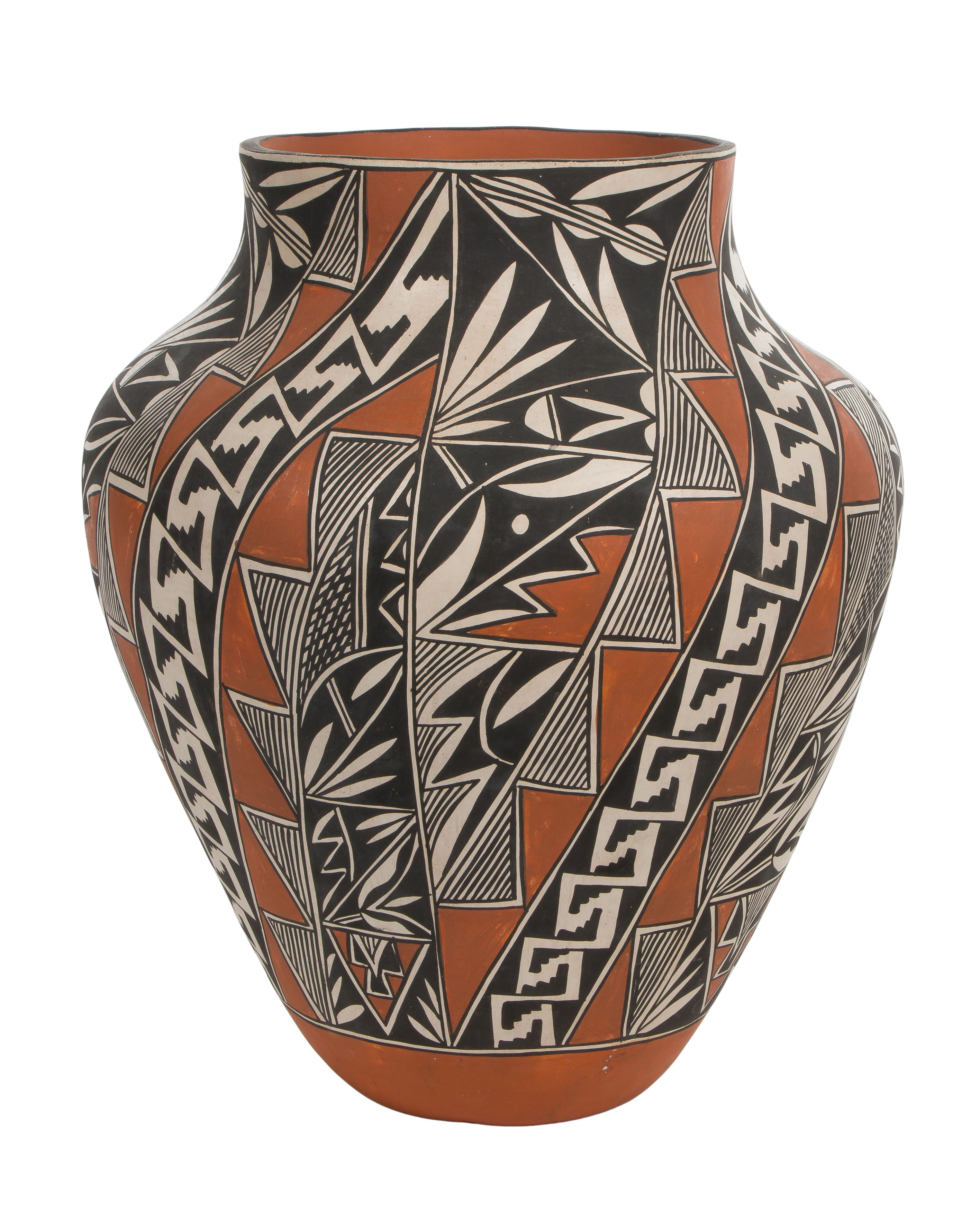 A large olla jar having black, red and white decoration marked ‘R. S. / Acoma N. M.’ underside