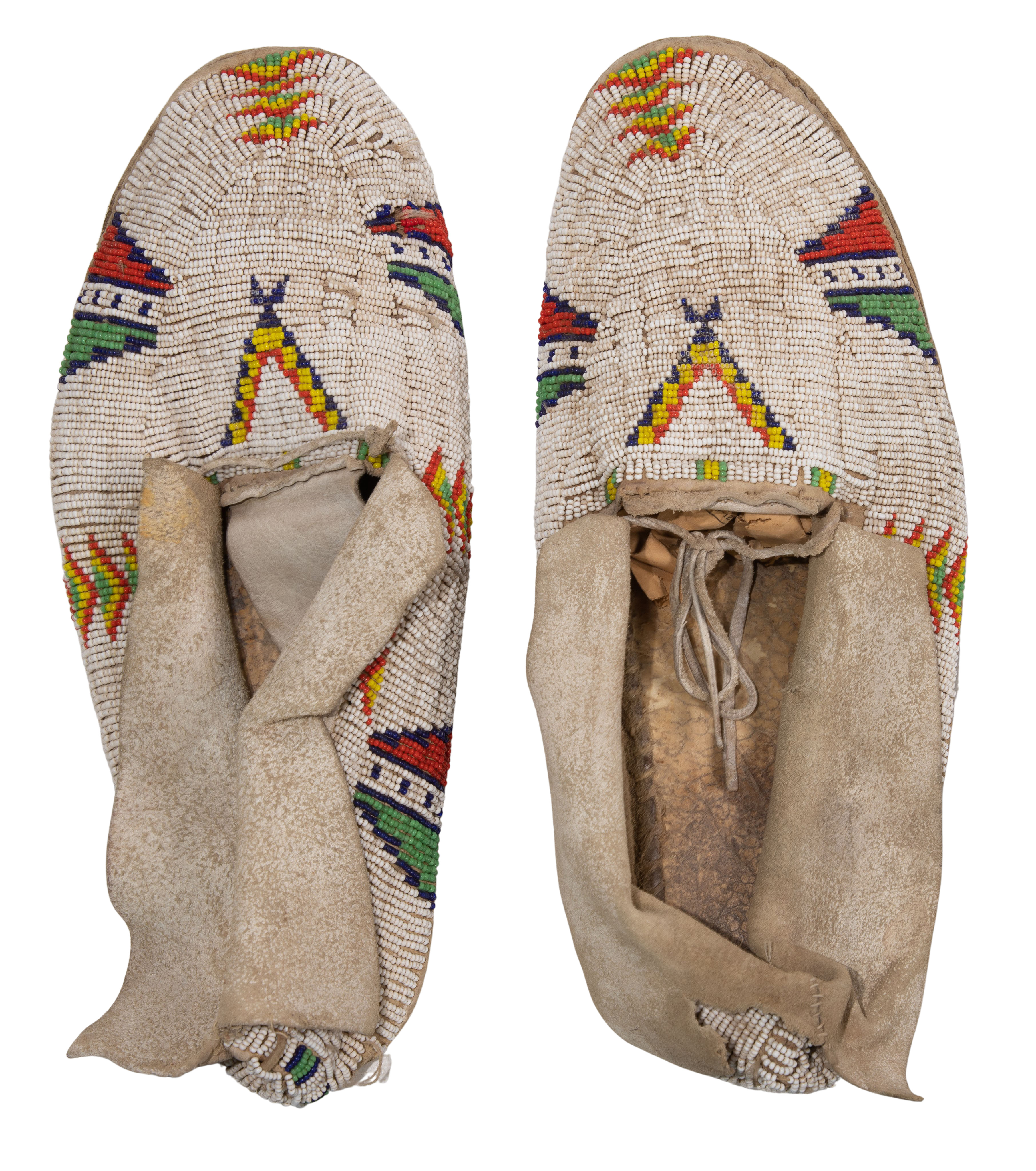 A pair of tanned hide, hard-soled, having lazy stitch beaded geometric patterns