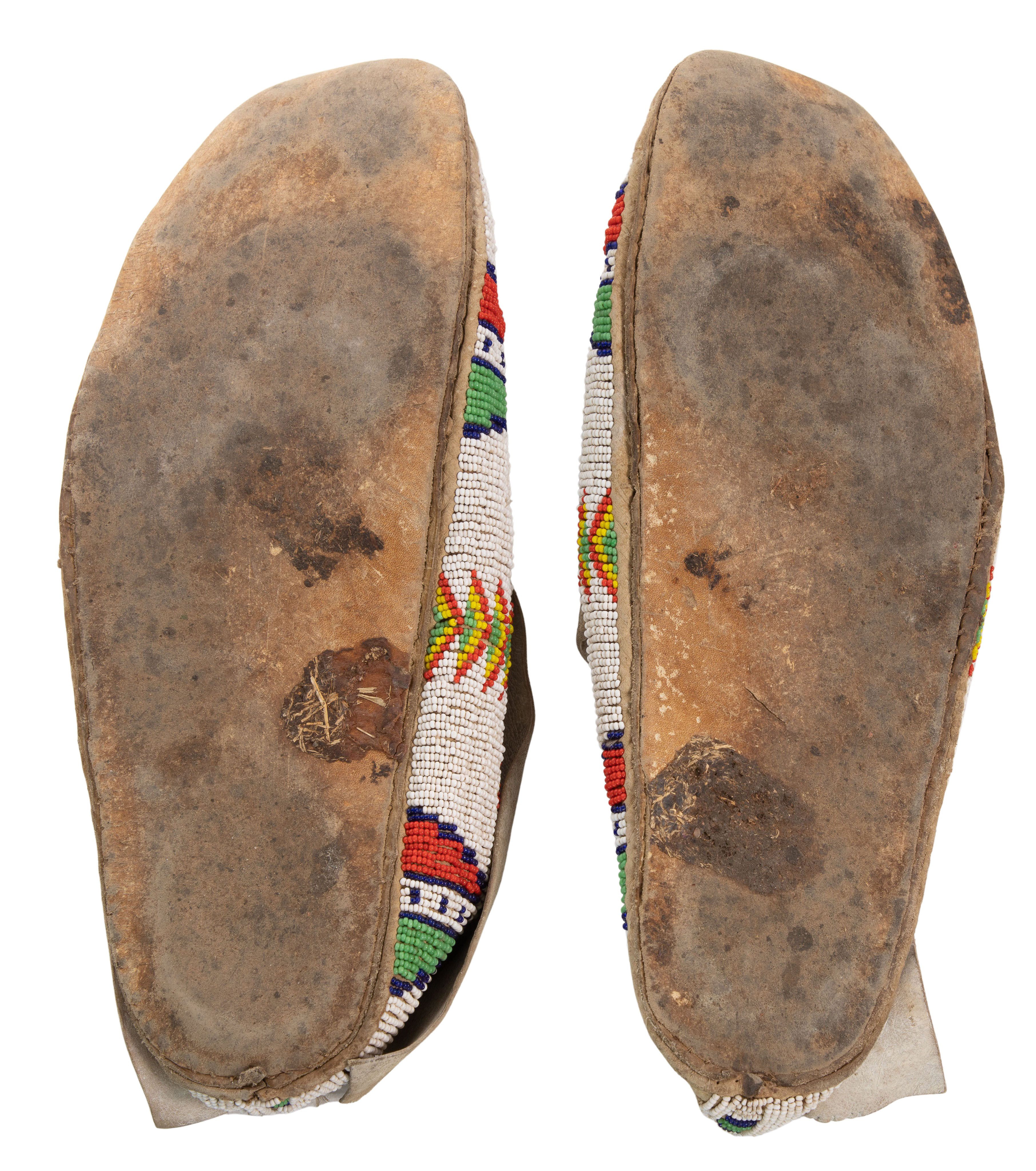 overall moderate wear consistent with normal use, soles having accretions, leather uppers a bit stiff and flattened, a tear at heel of one, wear-through at toe of the other, minor loss of beads at a heel