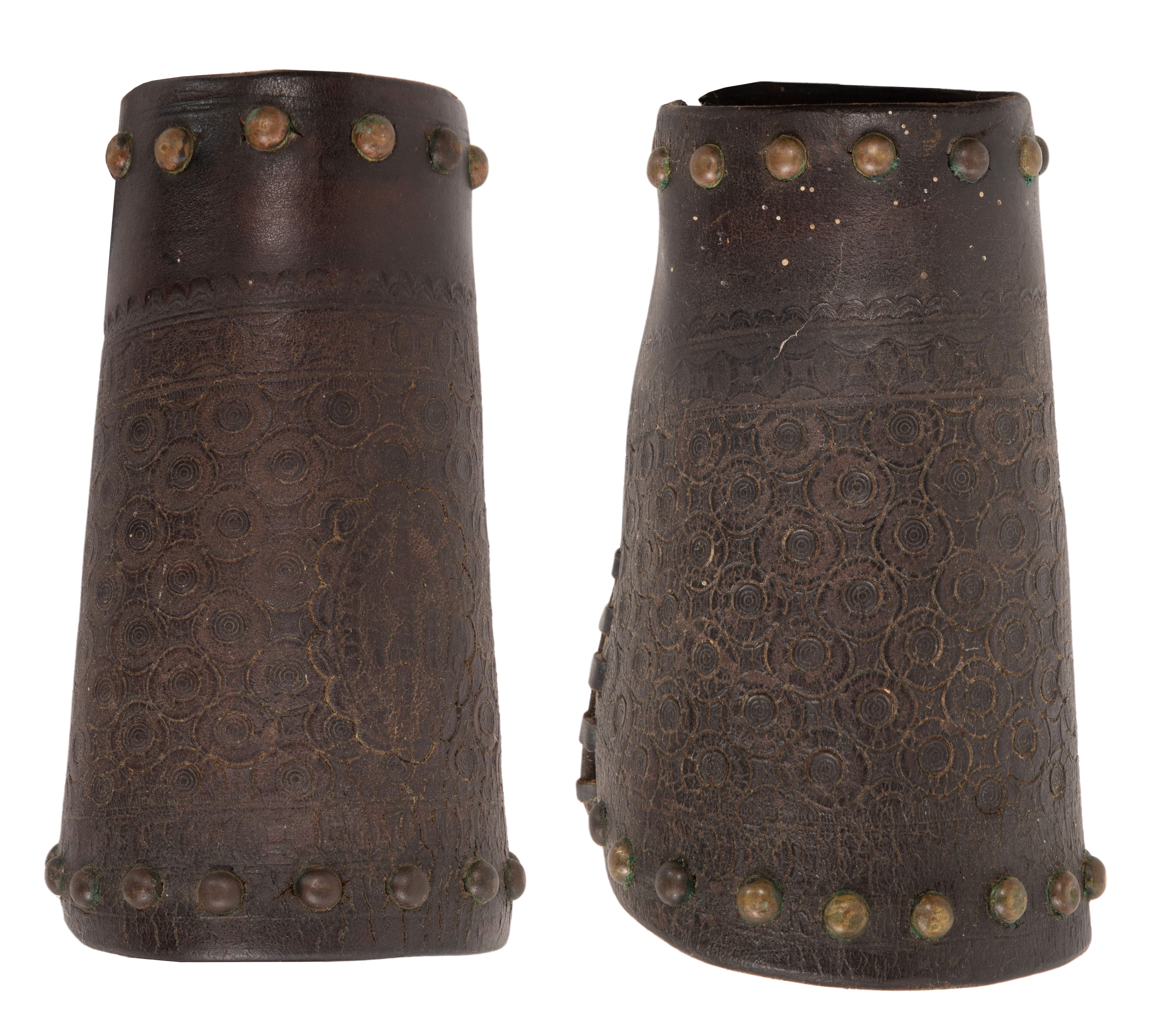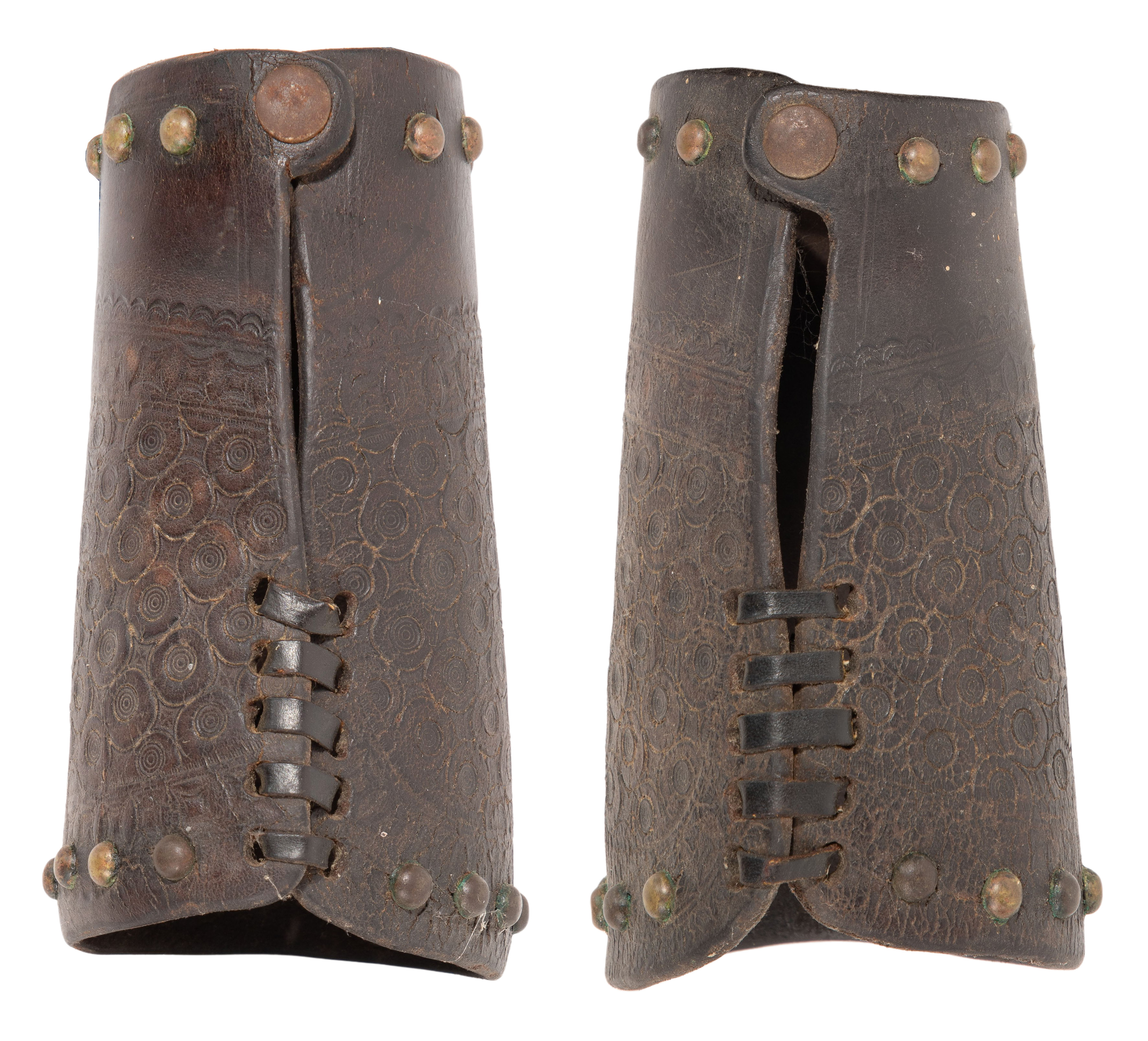 The pair in tooled leather having brass studs, stamped ‘Famous Jumbo Brand’ post-1902 mark