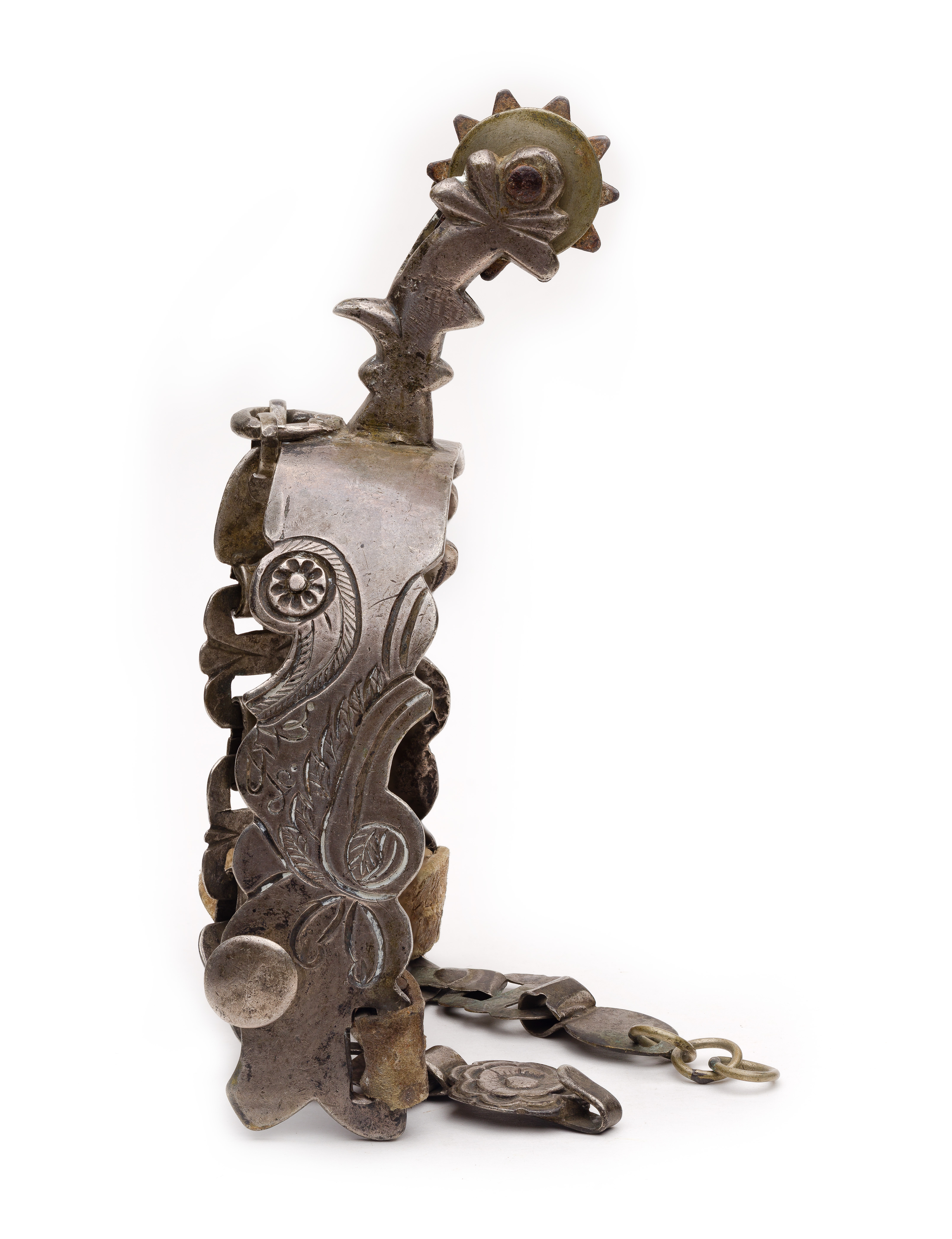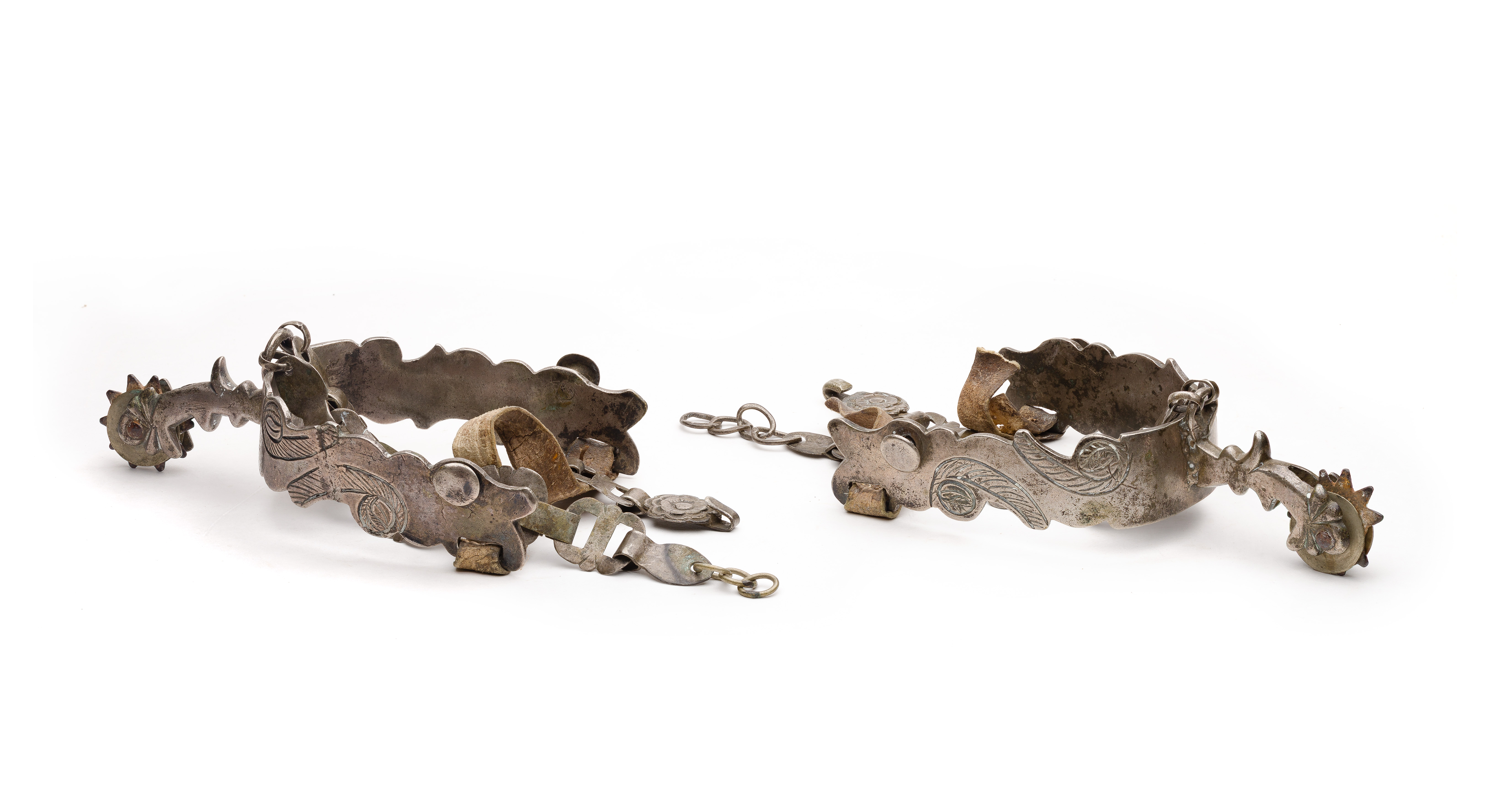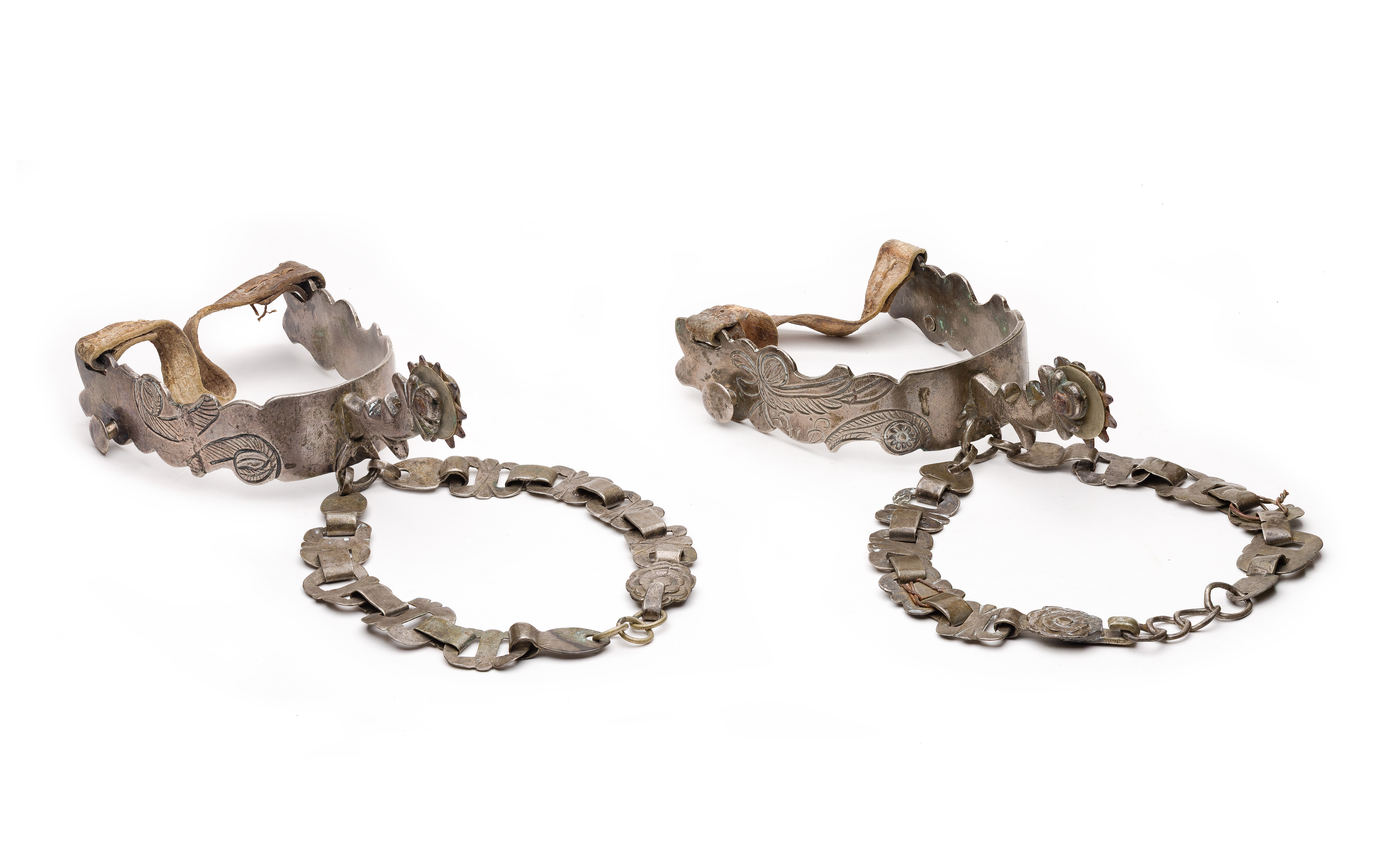 A pair having engraved heel band, floriform shank, sewn rawhide straps and heel chains having rosette closures