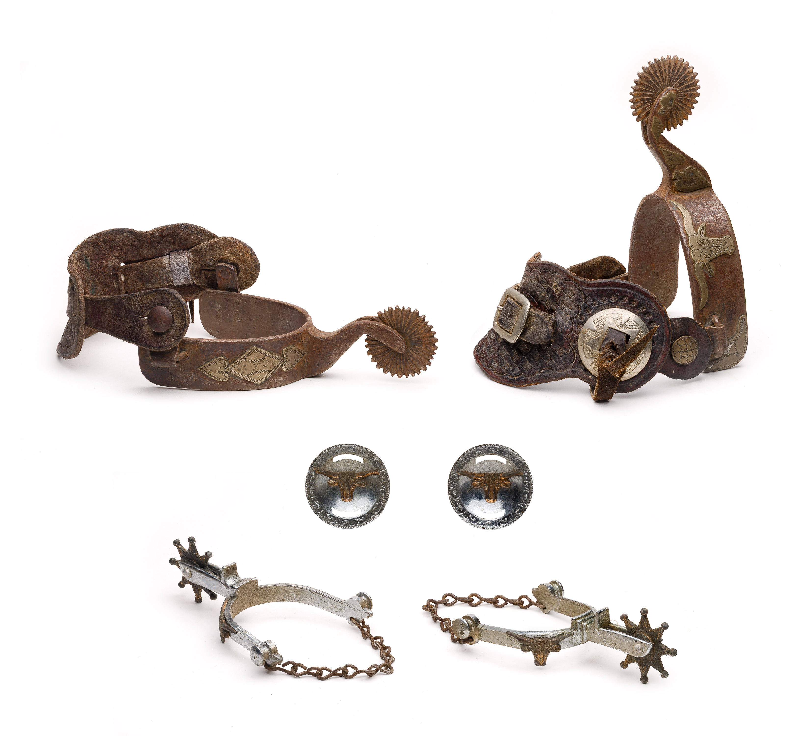 (2) pairs including a wrought iron having applied brass playing card suit pips to shanks and engraved geometric and steer head shaped mounts to heel band, tooled leather straps having conchos, as well as a plated brass having applied cast brass steer heads to band and to conchos (detached from missing straps), 8-point rowels having ball tips, heel chains