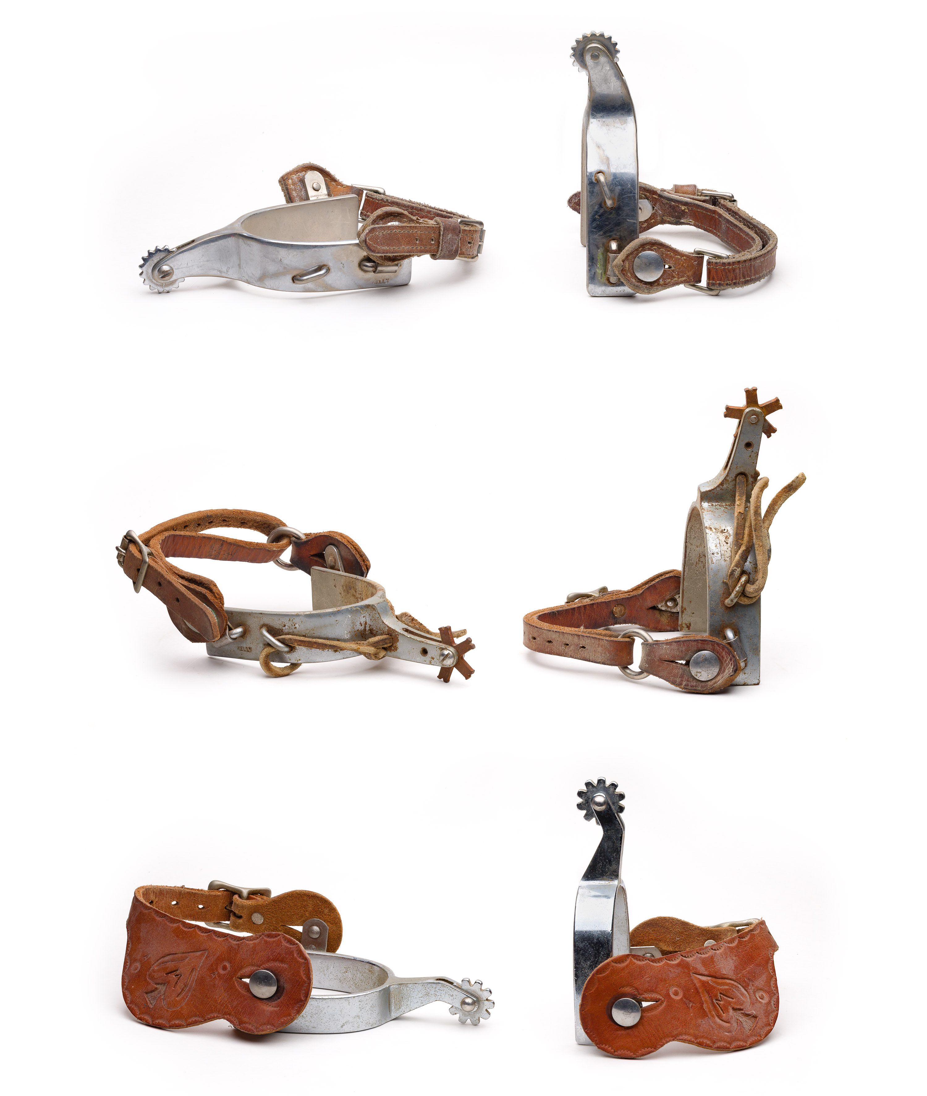 (3) total items including (2) pairs of stainless steel spurs stamped ‘Kelly’, both having leather heel straps, one pair having stamped ‘215 Kelly’ and 5-pointed rowels; together with an unmarked pair of stainless steel spurs having lightly tooled heel straps and monogram ‘M’ within a spade shape