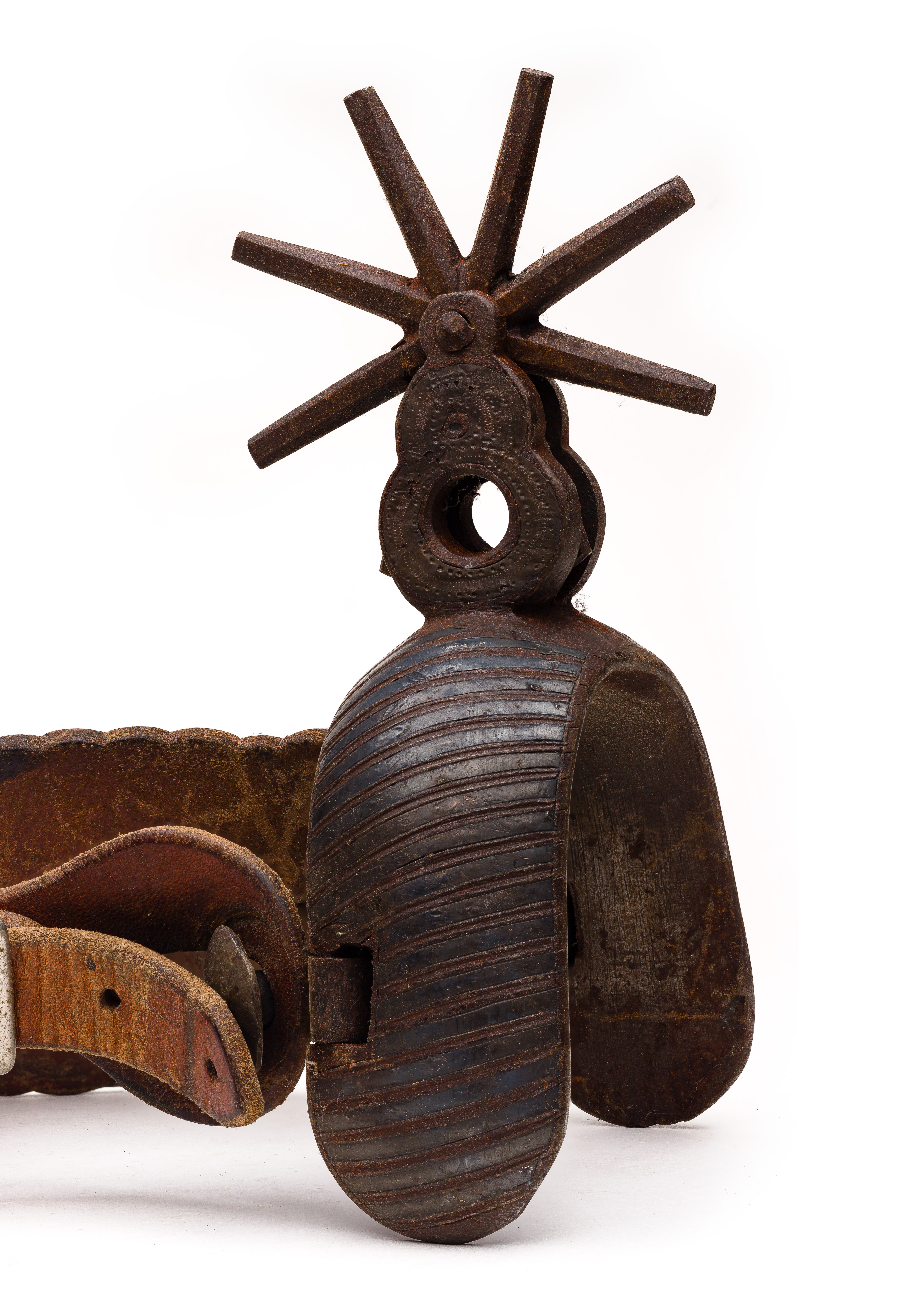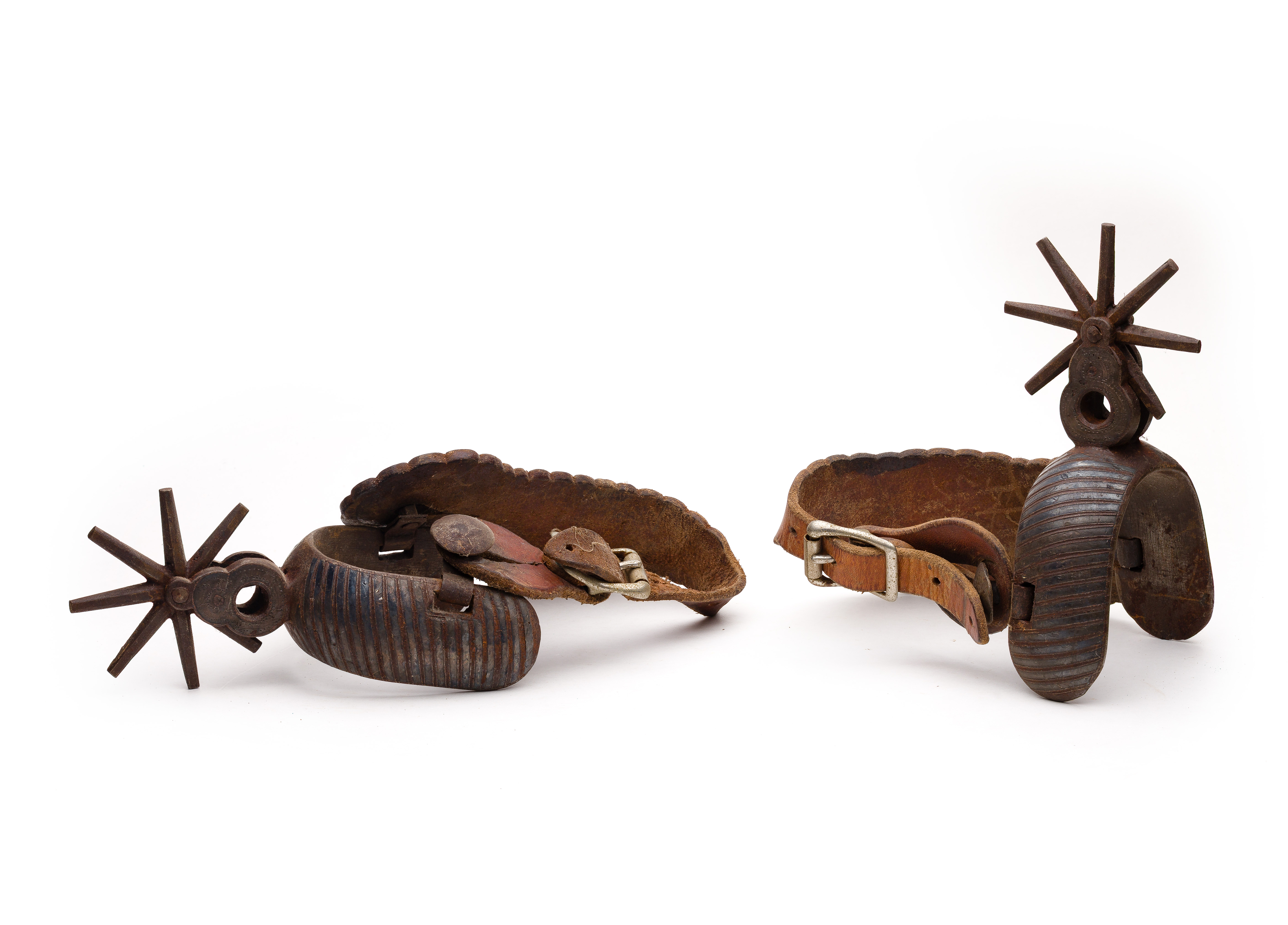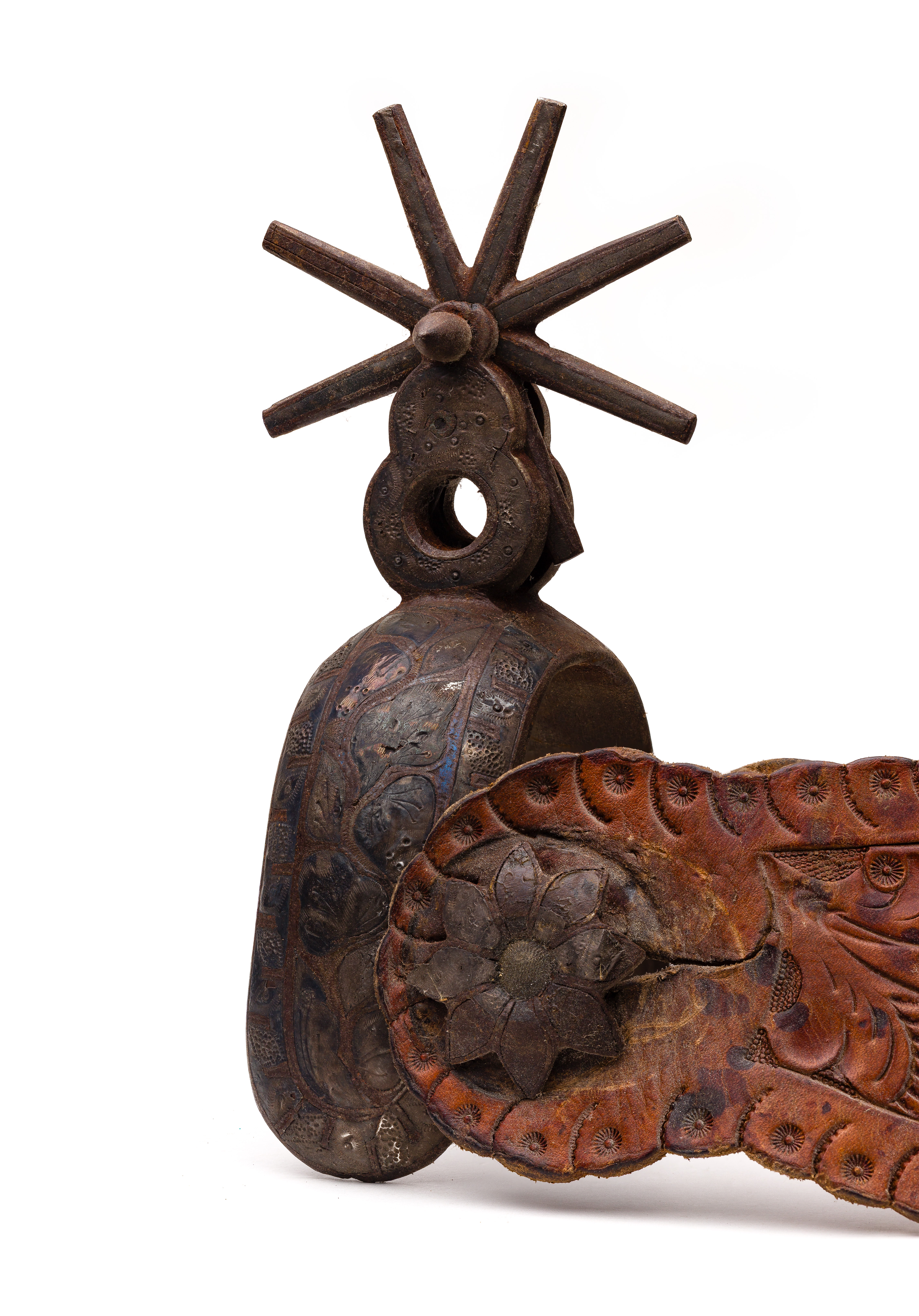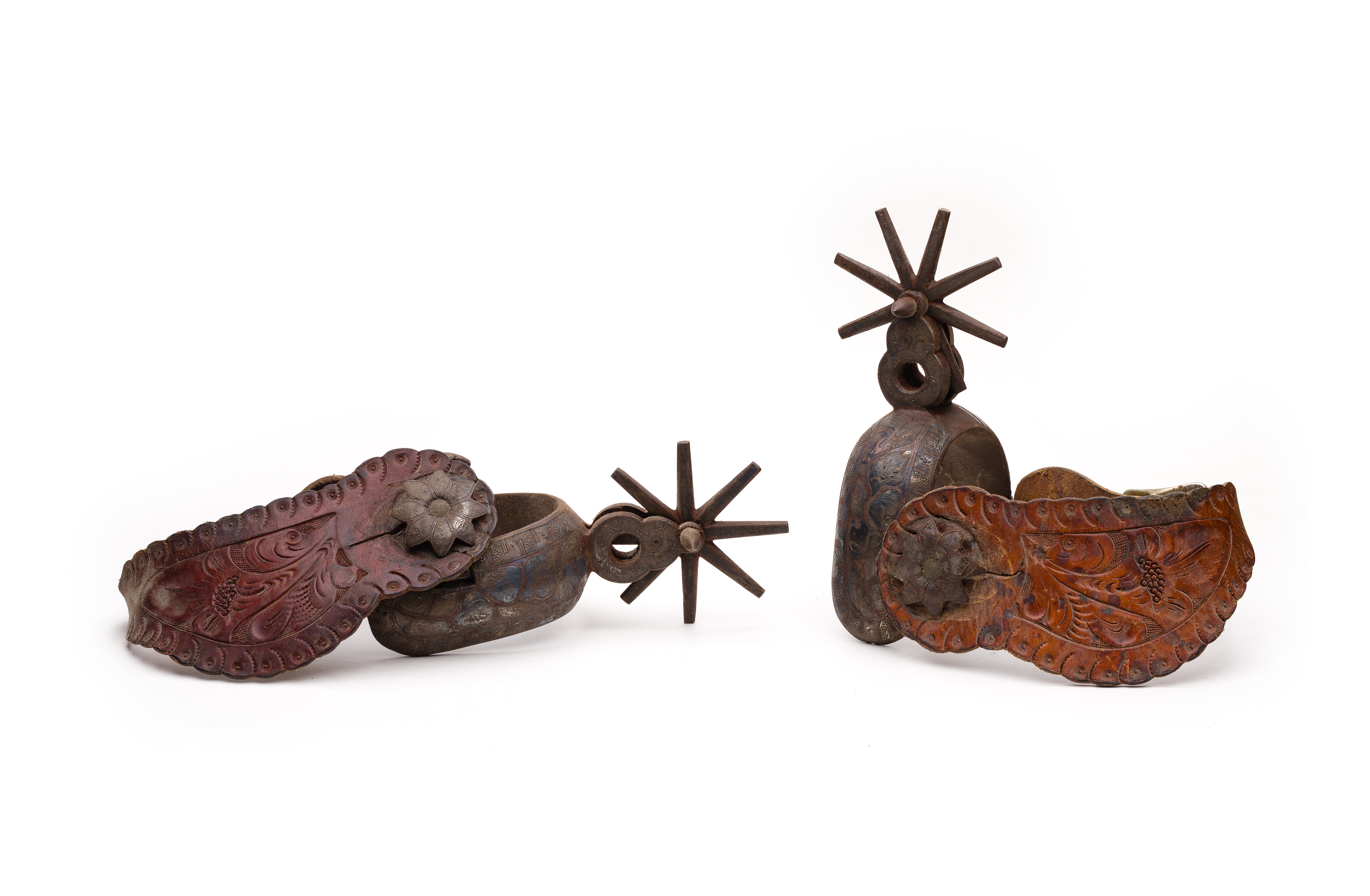 A pair having silver inlay to heel band and shank, 8-point, 3-inch diameter rowels and tooled leather straps