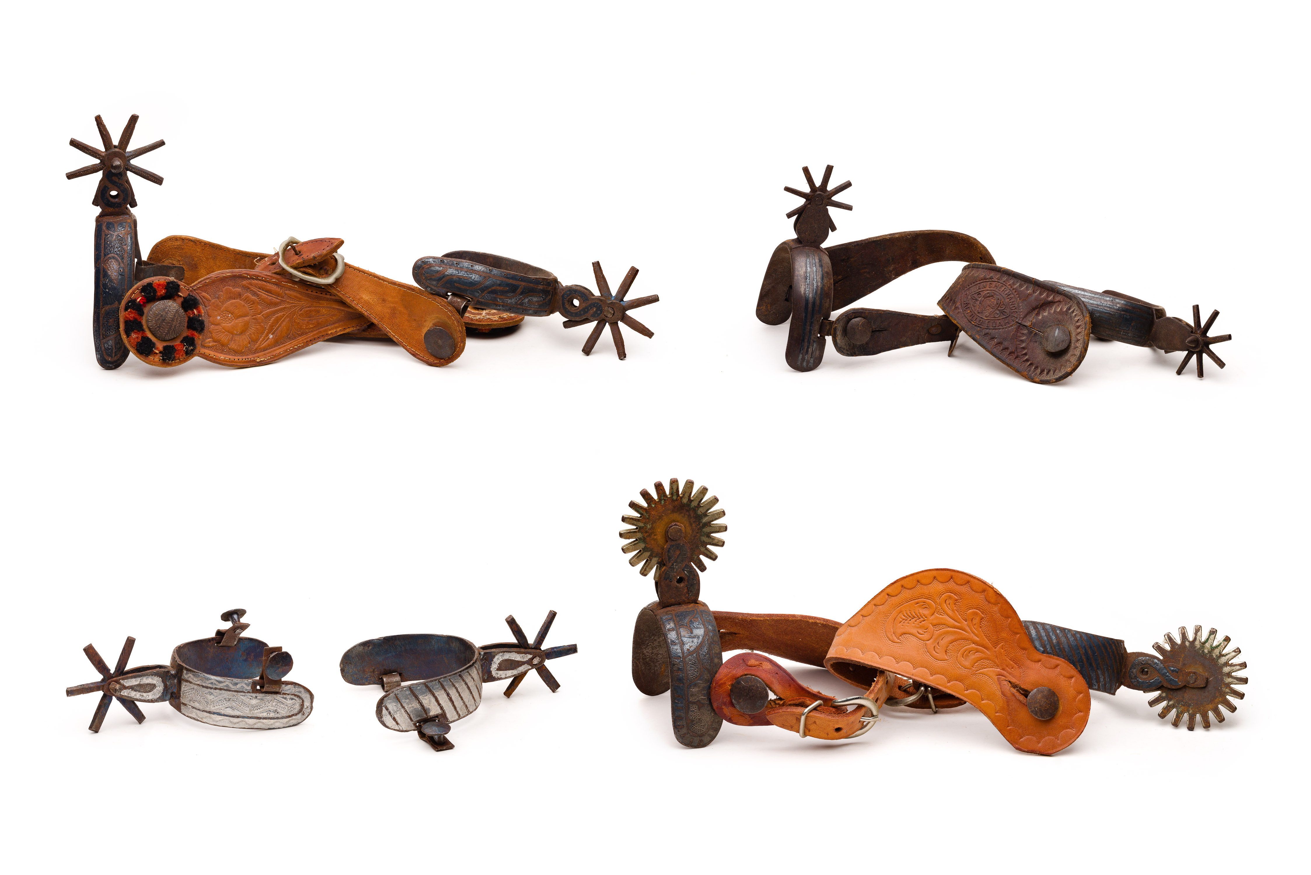 (4) pairs, all having nickel silver inlay or overlay decoration including (2) pairs having 8-point rowels and tooled leather straps, a pair having 20-point rowels and tooled leather straps and a pair having 6-point rowels lacking straps