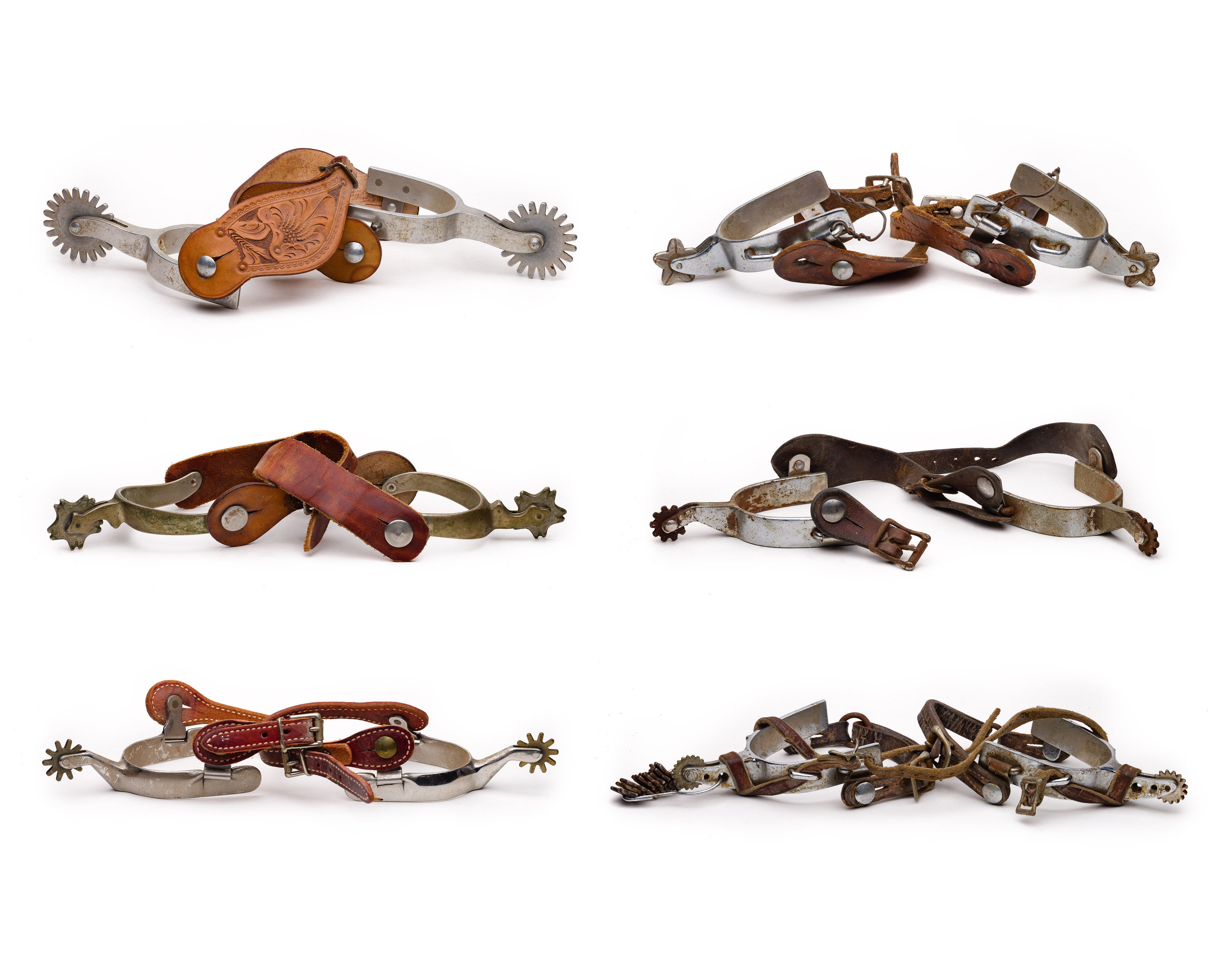 (6) pairs of various styles including (5) steel (of which one having unmatched rowels and a selection of seven replacement rowels attached by wire clip) and an aluminum pair having tooled straps, all having leather straps