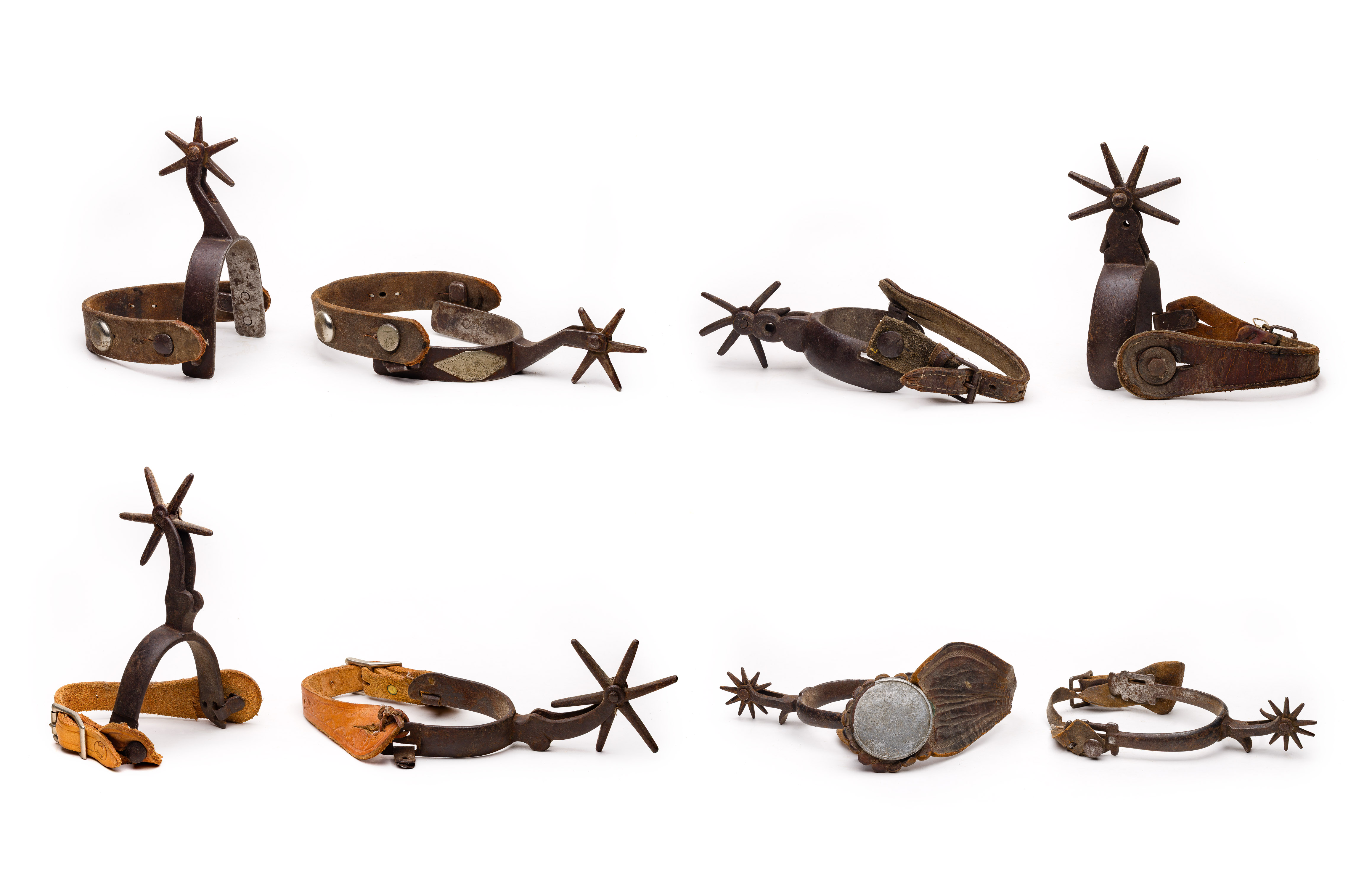 (4) pairs including one having nickel silver overlays, 6-point 2.25-inch rowels and studded leather straps, one having remnants of silver wash and two different style straps (one having an aluminum button), a vaquero style having 6-point rowels and another having 8-point rowels, both having leather straps