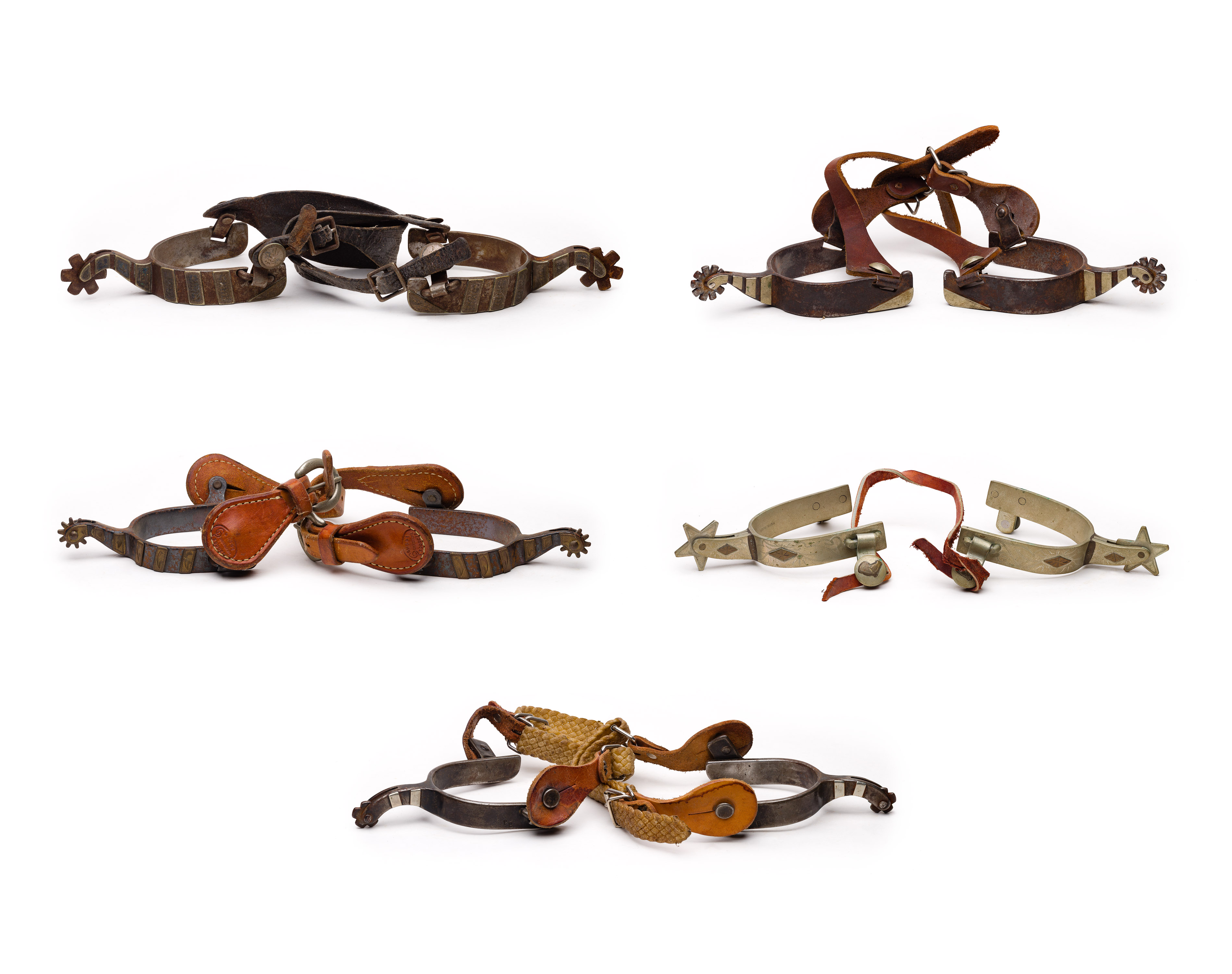 (5) total items including (3) pairs having nickel silver overlays including a Bob Blackwood stamped ‘BB’; together with a steel pair having brass overlays and an aluminum having brass overlays, all having leather straps