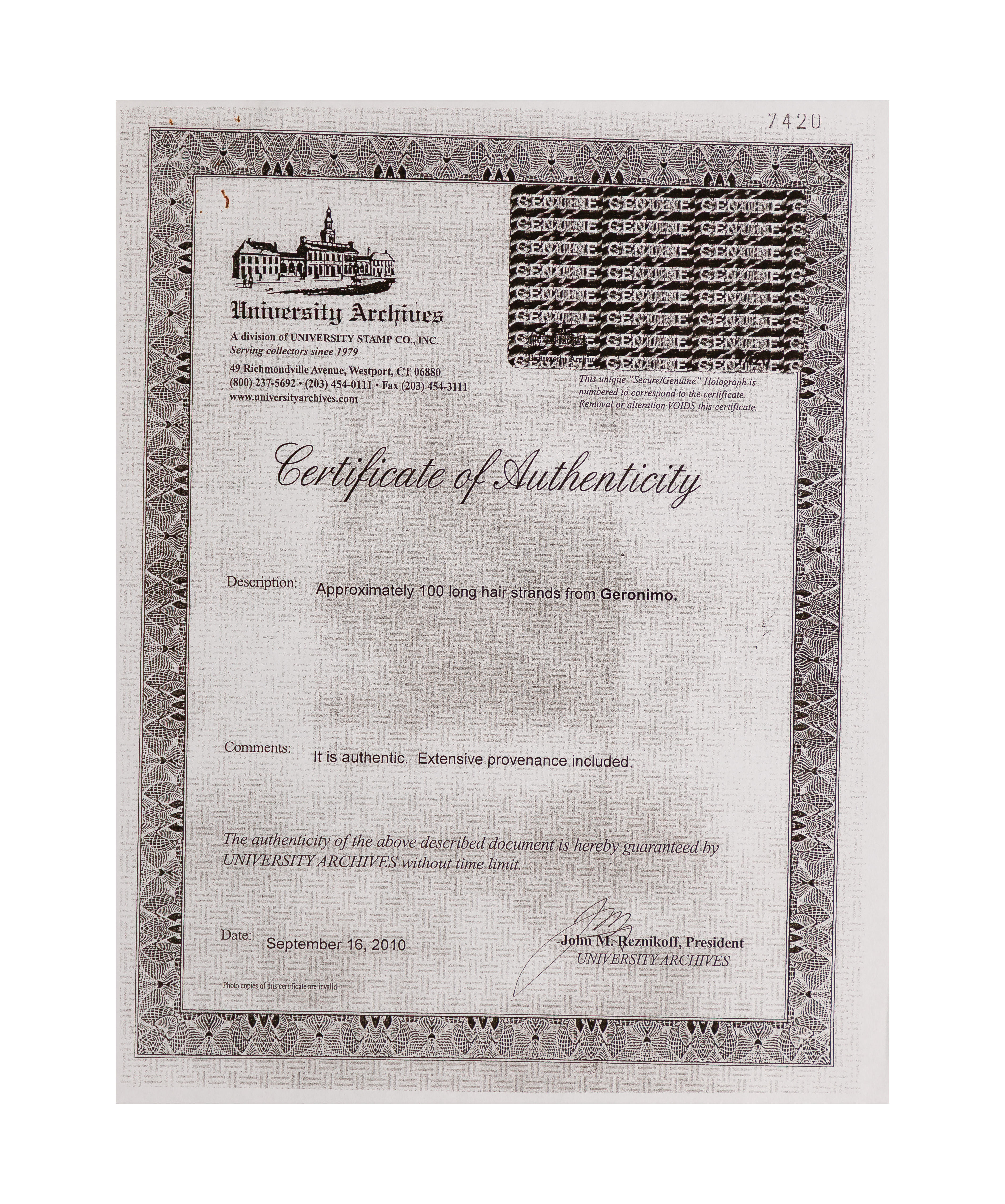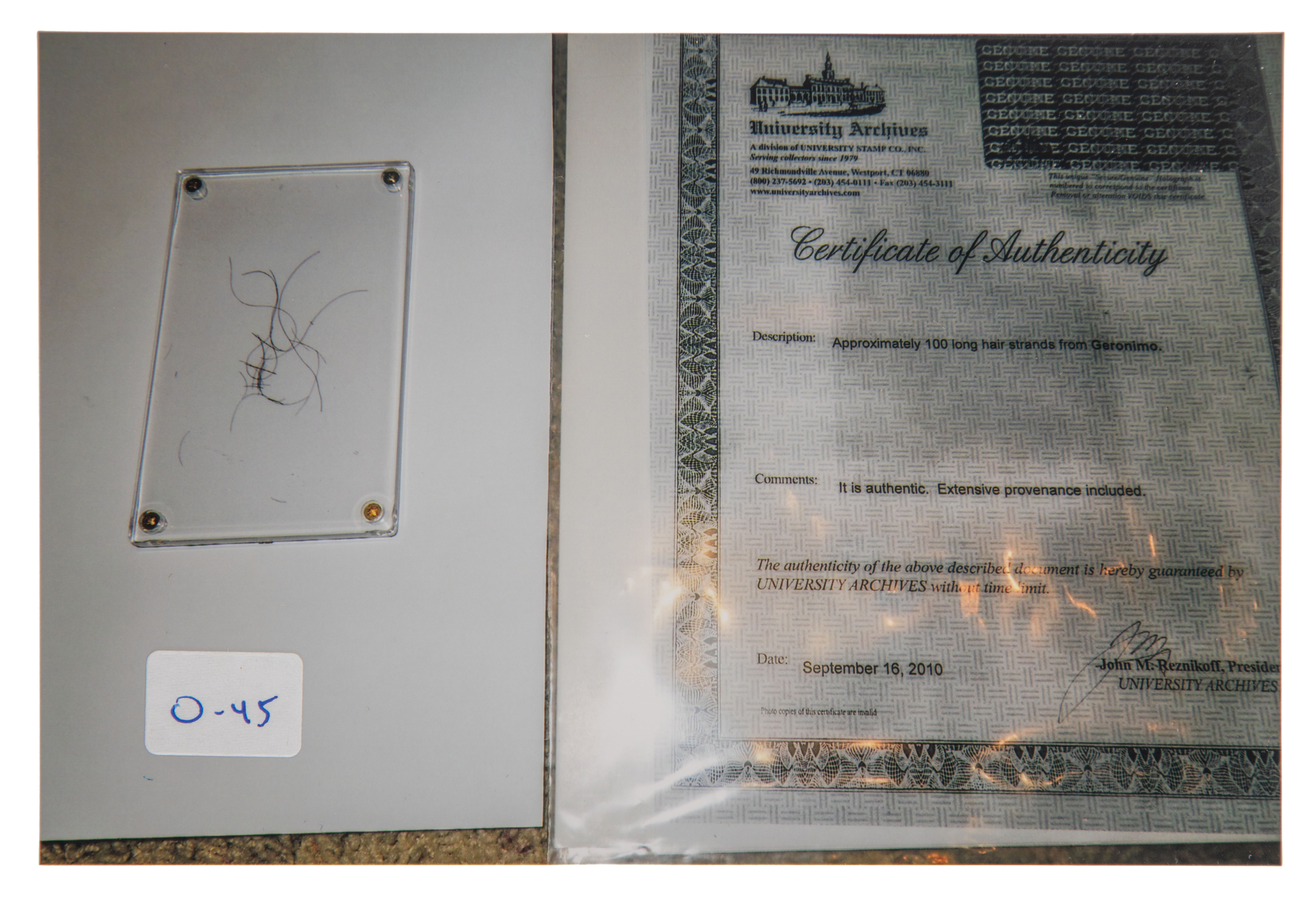 Removed from a larger lock obtained shortly before Geronimo’s death in 1909, in a plastic holder, accompanied by COA copy from leading authenticator of hair specimens John Reznikoff of University Archives