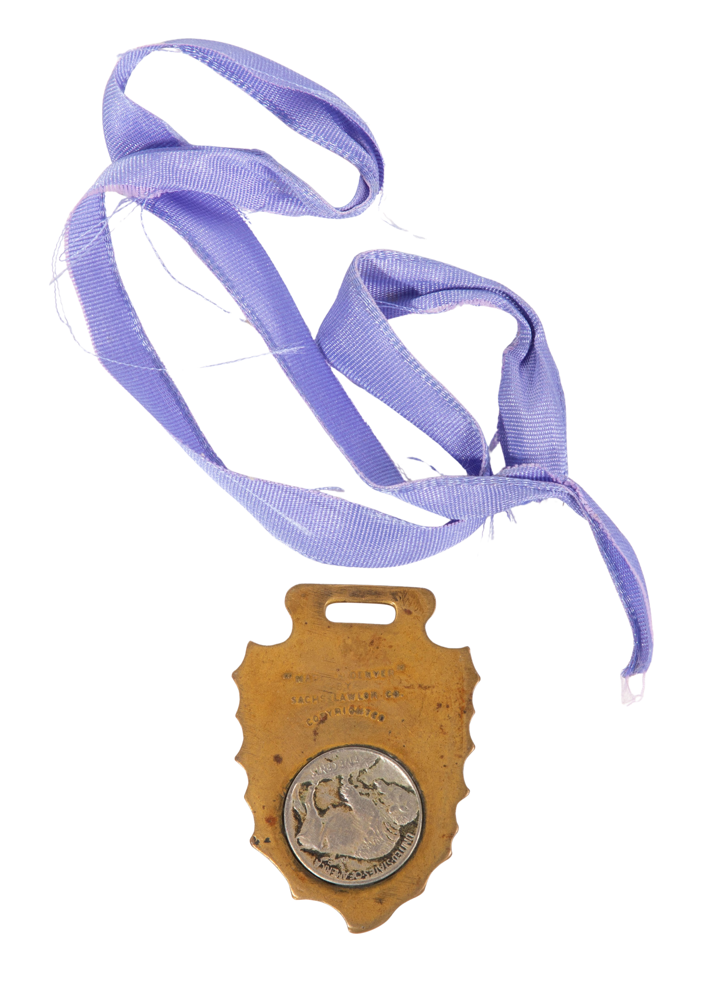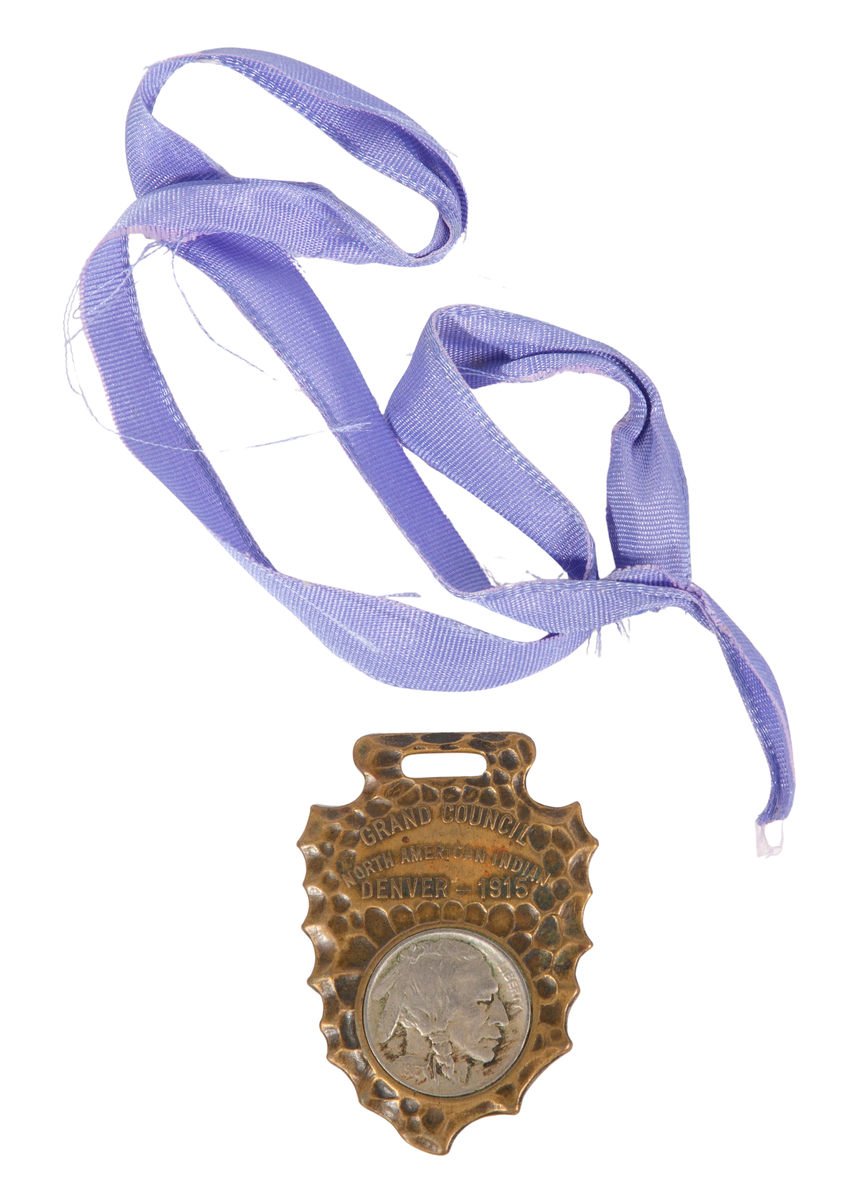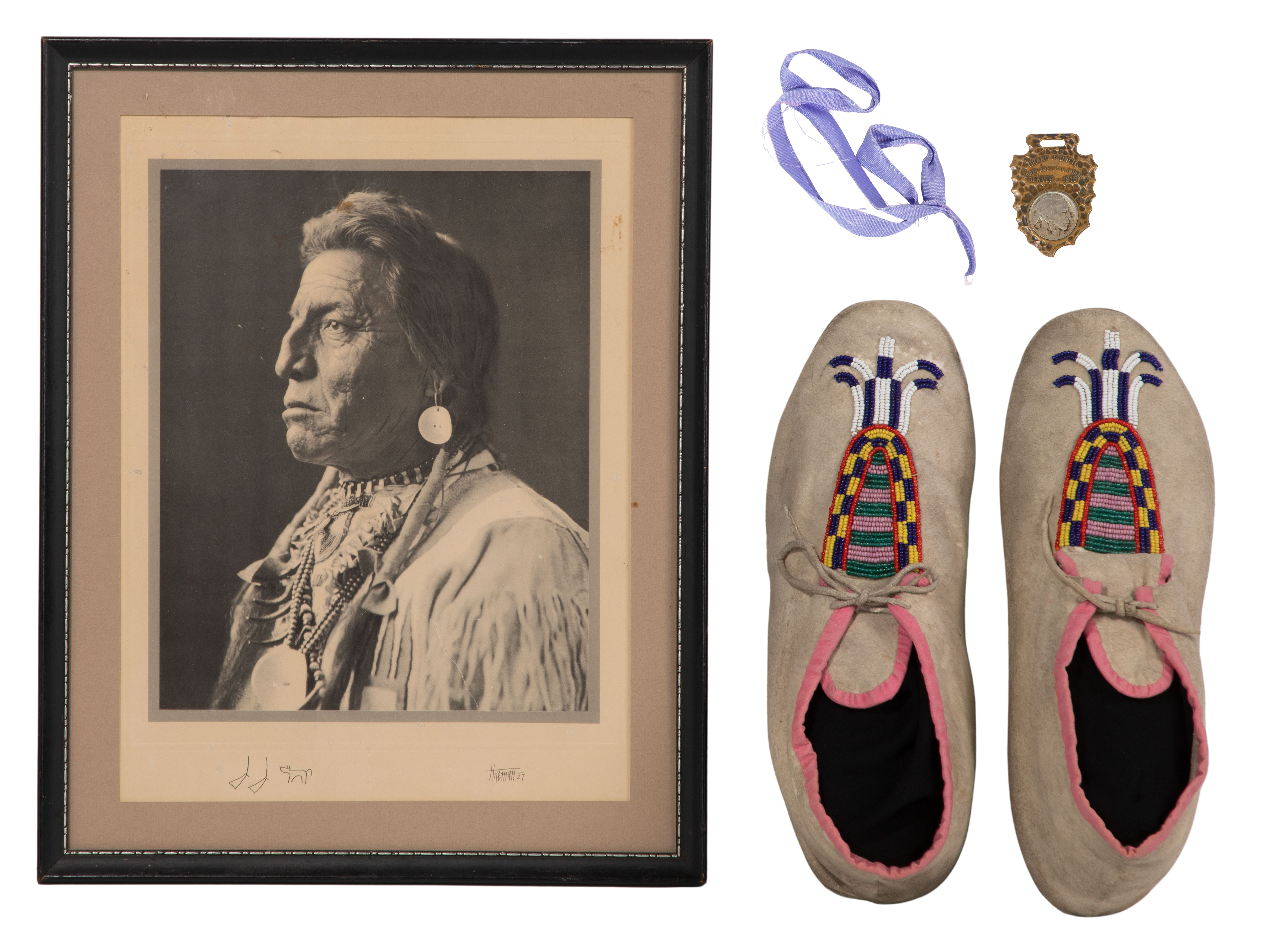 (3) total items including the pair of tanned hide moccasins partially decorated in a lazy stitch beaded geometric symbolic pattern, having trade cloth trim and signed to a sole using the pictographic cypher of the Piegan Blackfeet chief, an offset copy of a 1927 photograph by T. J. Hileman (American, 1882-1945) ink signed and dated by Hileman and by Two Guns White Calf using his pictographic cypher, matted behind glass in an 11 by 14-inch wood frame; together with an arrowhead shaped copper pendant having ‘Grand Council / North American Indian / Denver 1915’ above an inset Indian Head 5c, which Two Guns White Calf believed was a portrait of himself