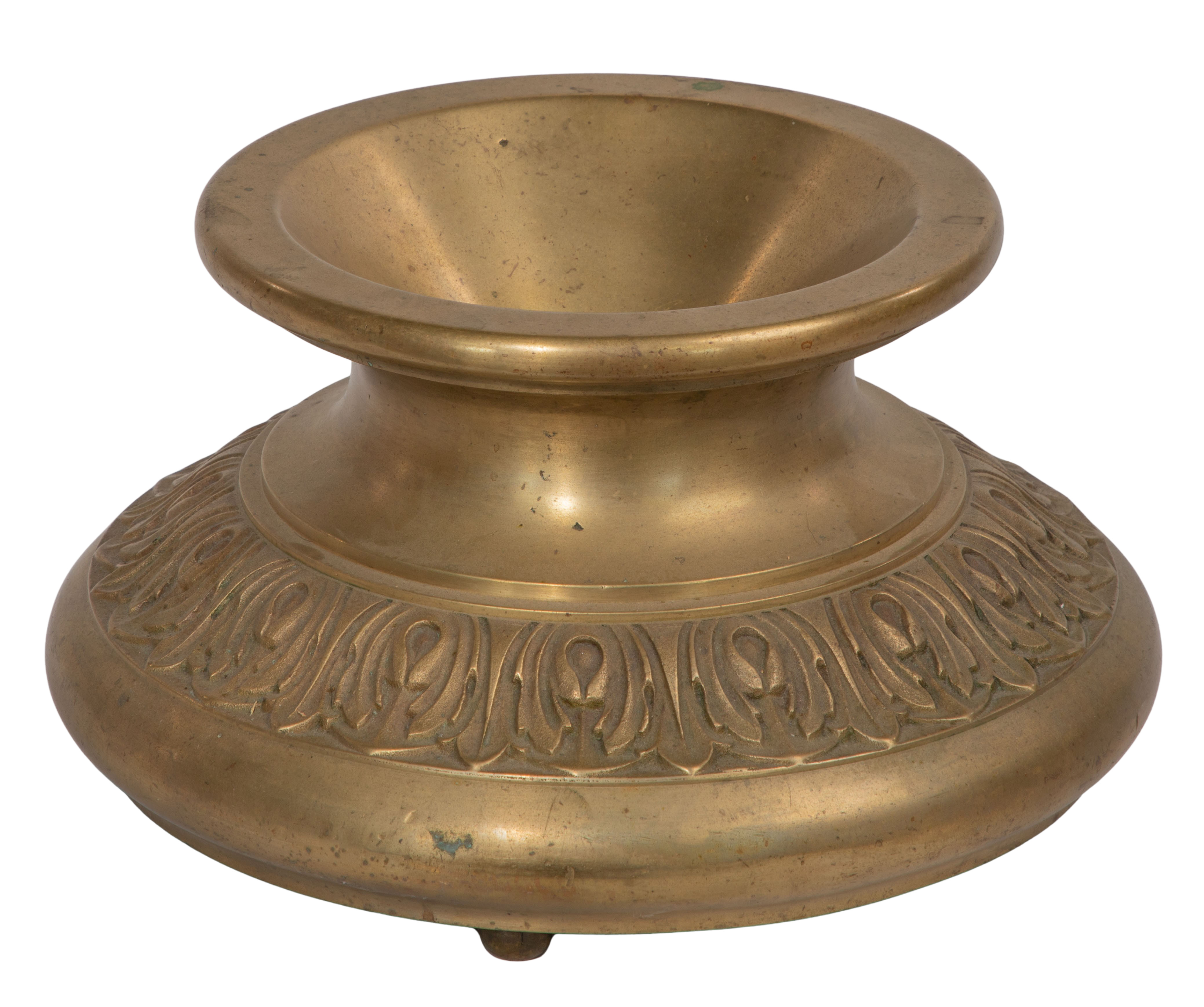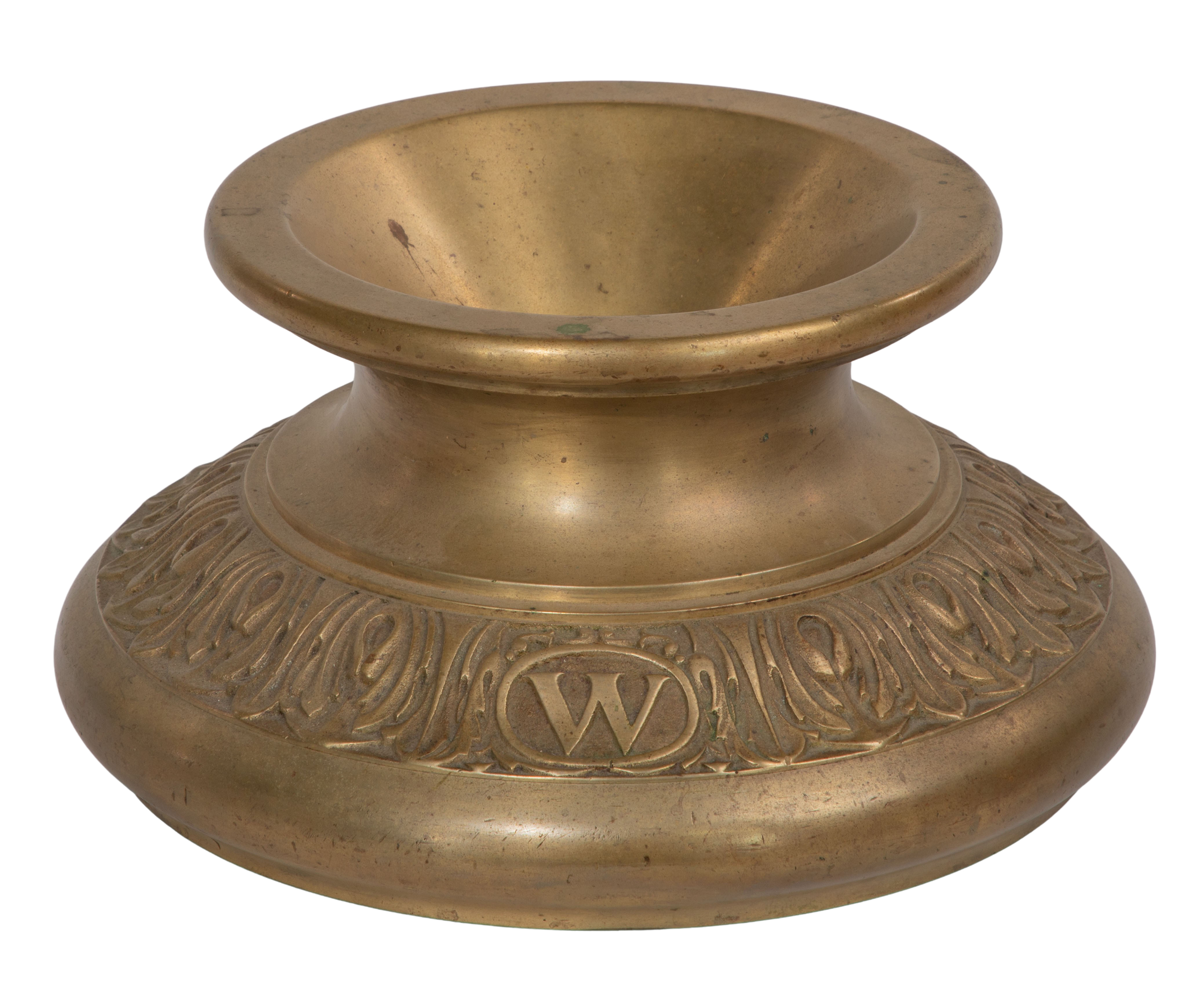 c.1910, cast brass having a raised band of foliate decoration around shoulder centering a ‘W’, rimmed funnel insert removable for cleaning