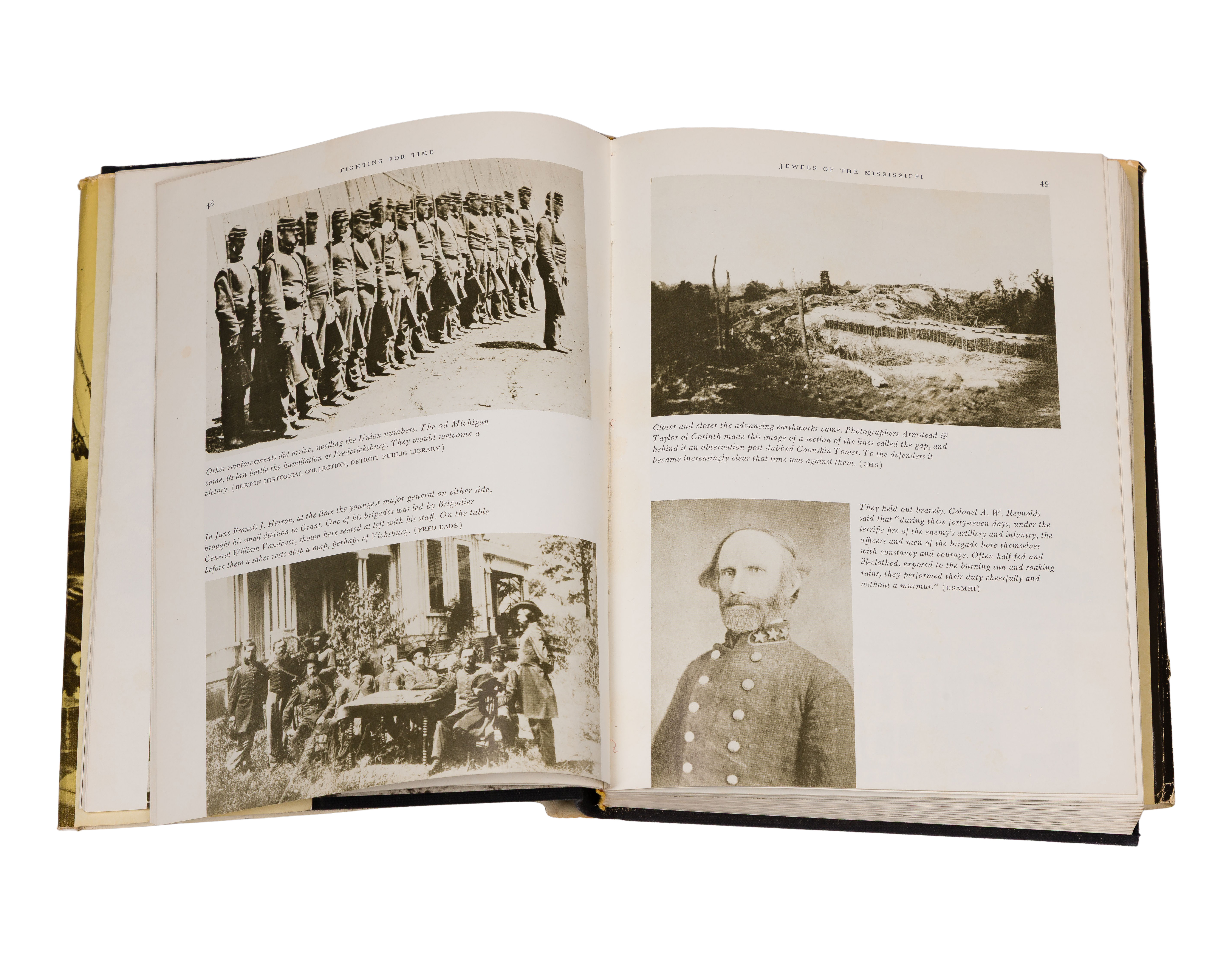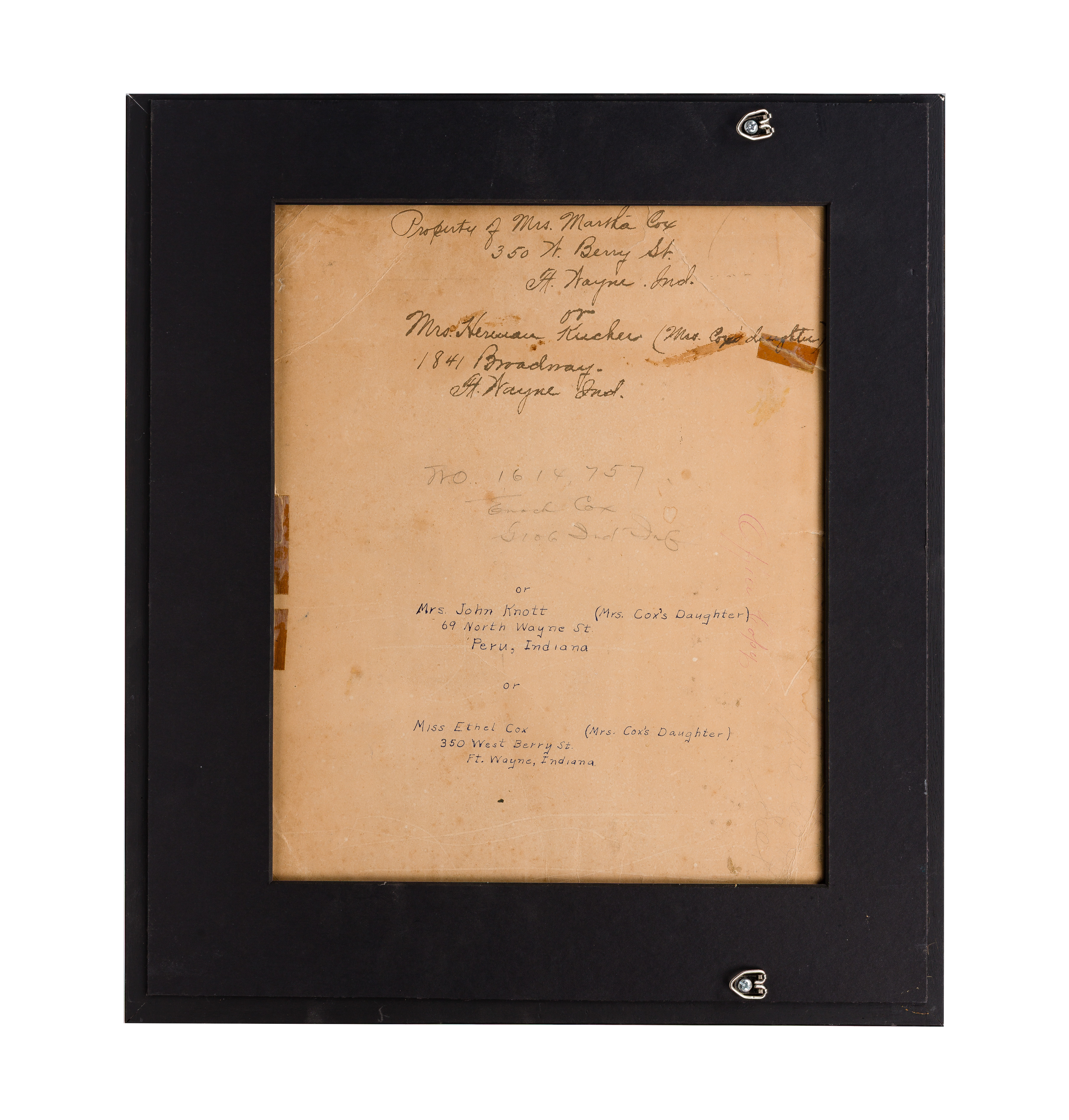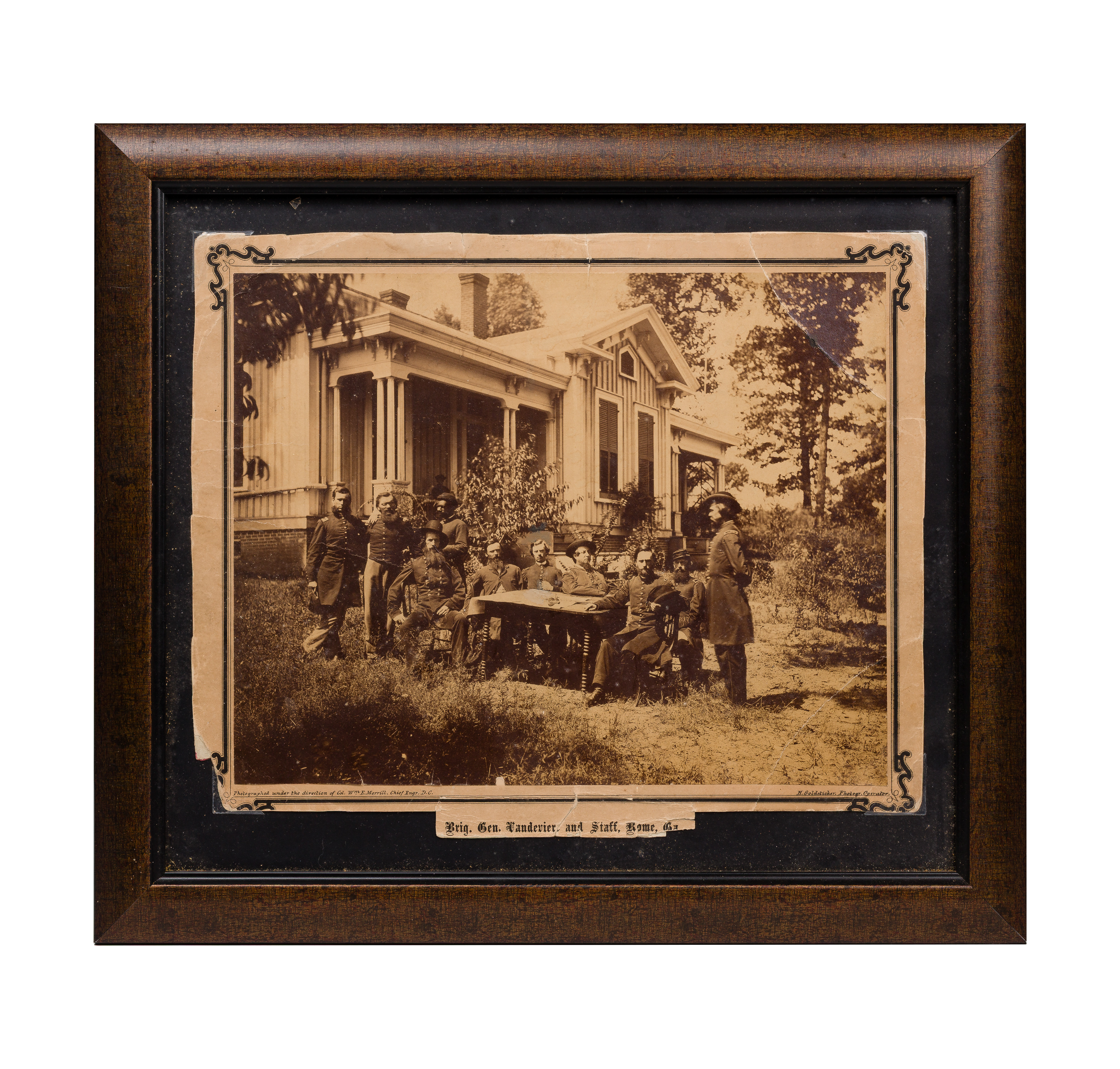 (3) total items including the image of General William Vandever (American, 1817-1893), printed within a decorative border, having misspelled title ‘Brigadier General Vandevier and Staff, Rome, Ga.’, ‘Photographed under the direction of Col. Wm. E. Merrill, Chief Engr. D.C.’ and ‘H. Goldsticker. Photoengr. Operator.’ below image, hand printed record of the chain of possession through the Cox family on verso, visible through the back glass of the double-pane wood float frame, the sheet attached using photo corner mounts to backing mat; together with a sleeve containing scans of the image and a copy of the National Historical Society book ‘The Image of War: 1861-1865 Vol. IV’ in which the image appears on page #48