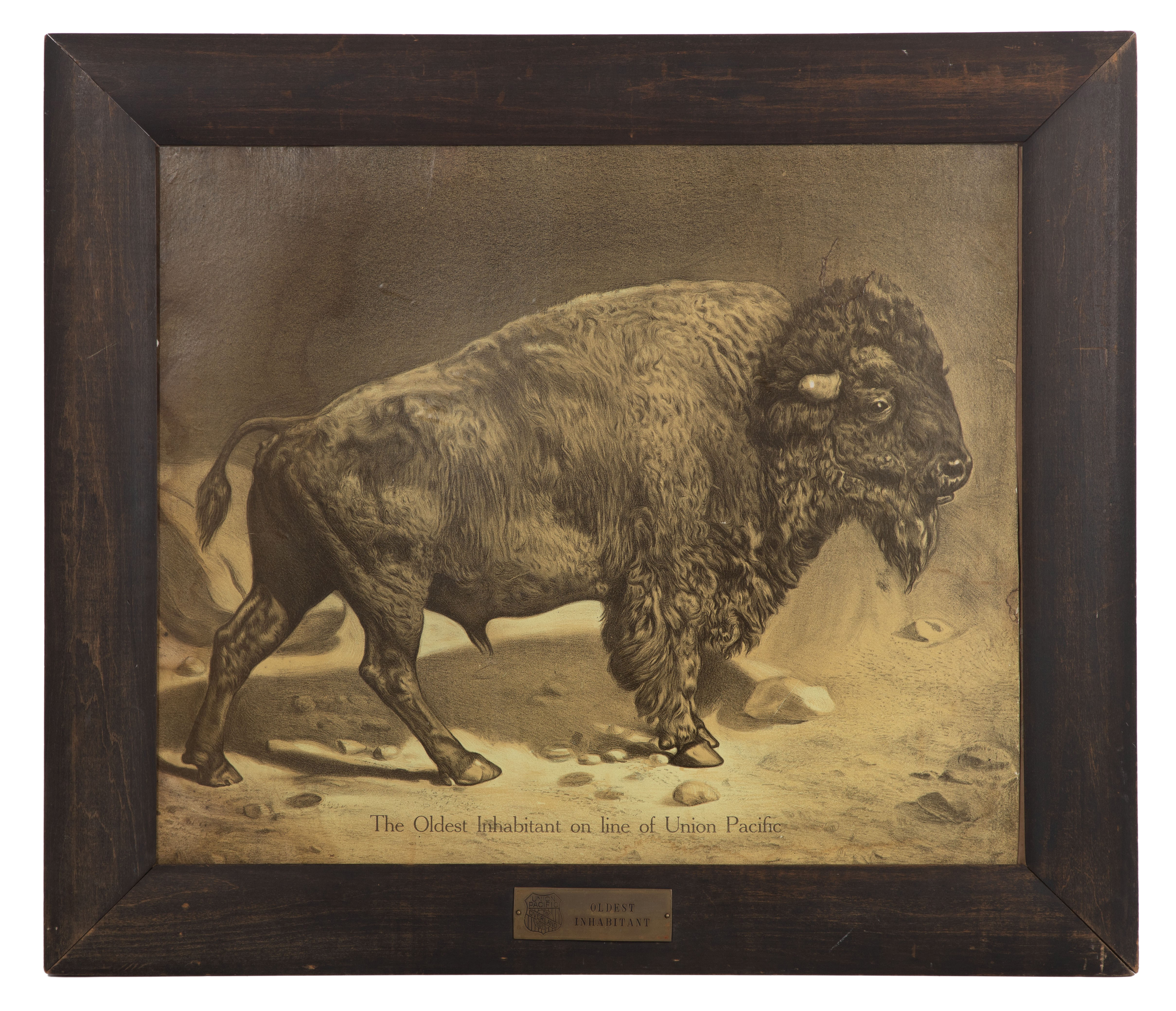Having the caption ‘The Oldest Inhabitant on the Line of Union Pacific’, in a wood frame having an attached copper tone plaque