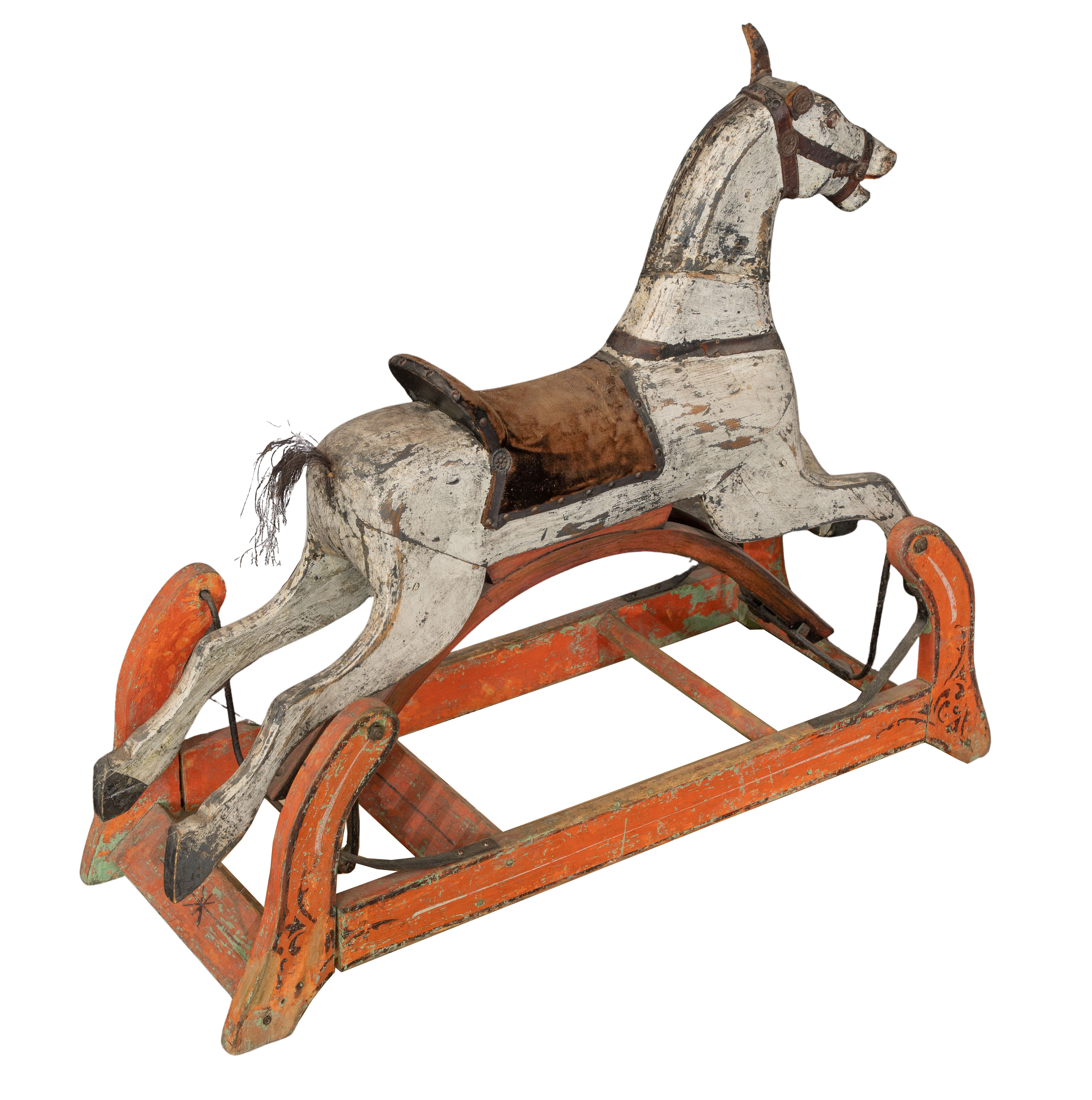 Condition: moderate wear overall, missing most of tail, paint loss, missing leather straps, thread loss on cloth seat, rust, loose joints on base, tail separated from rear