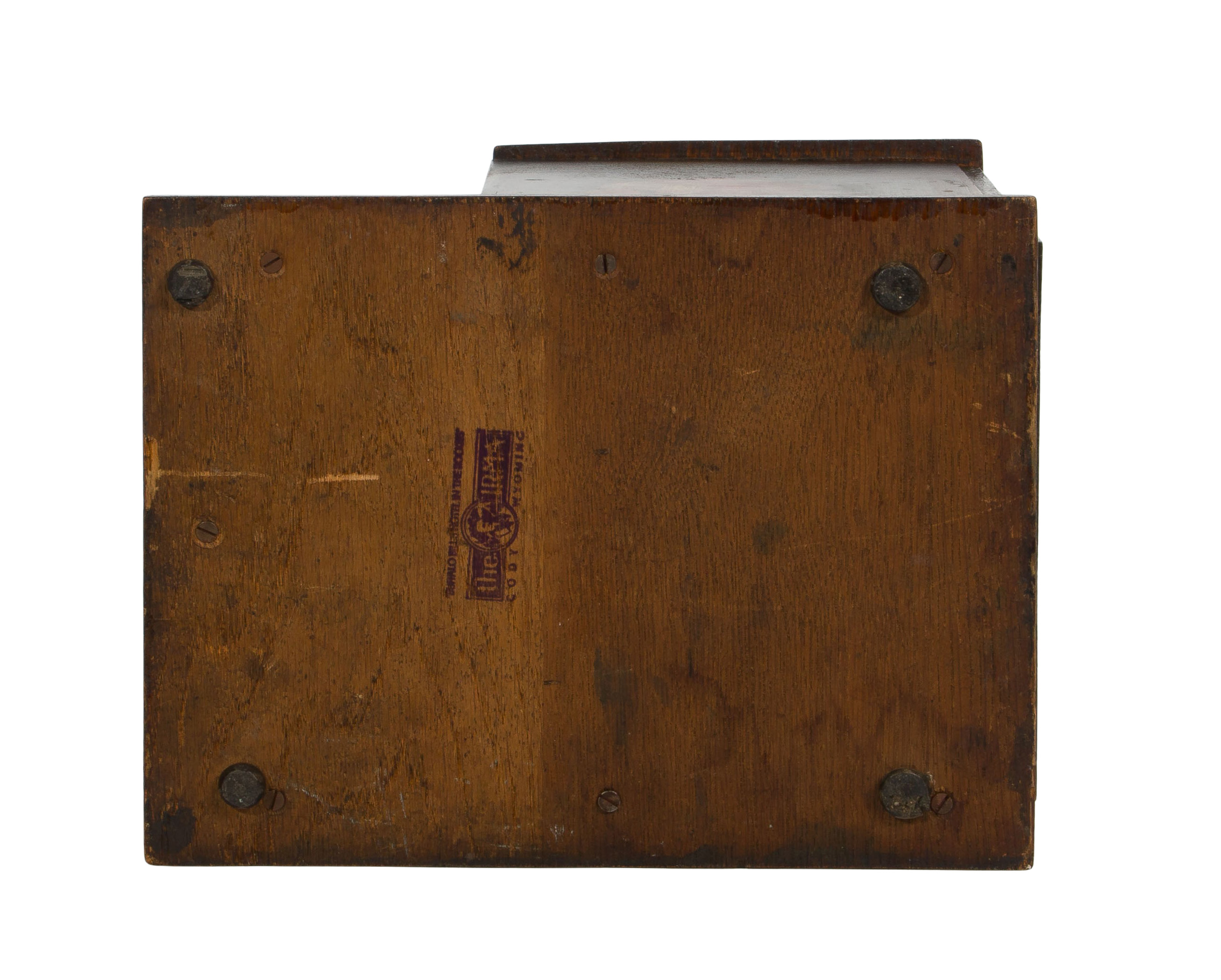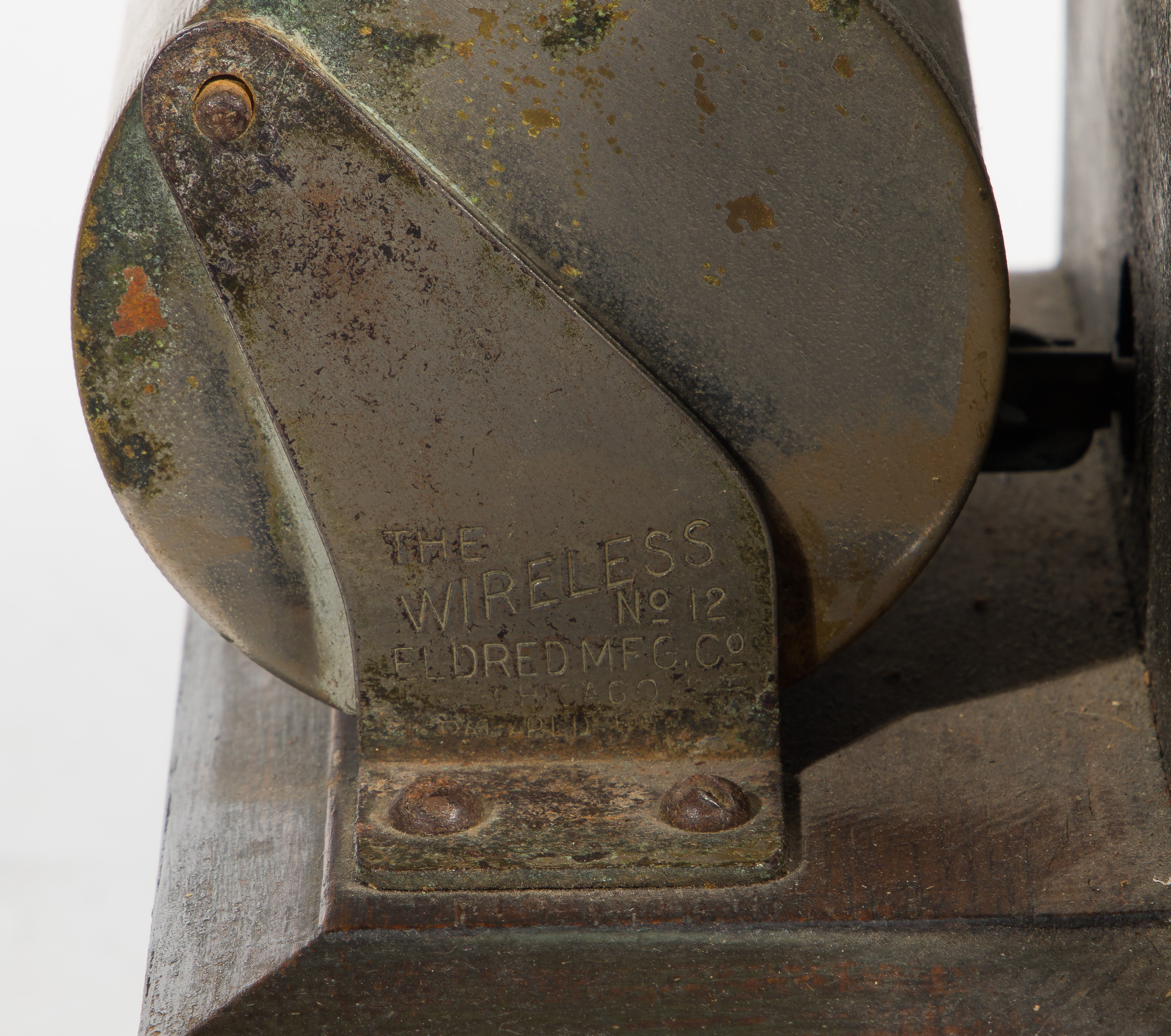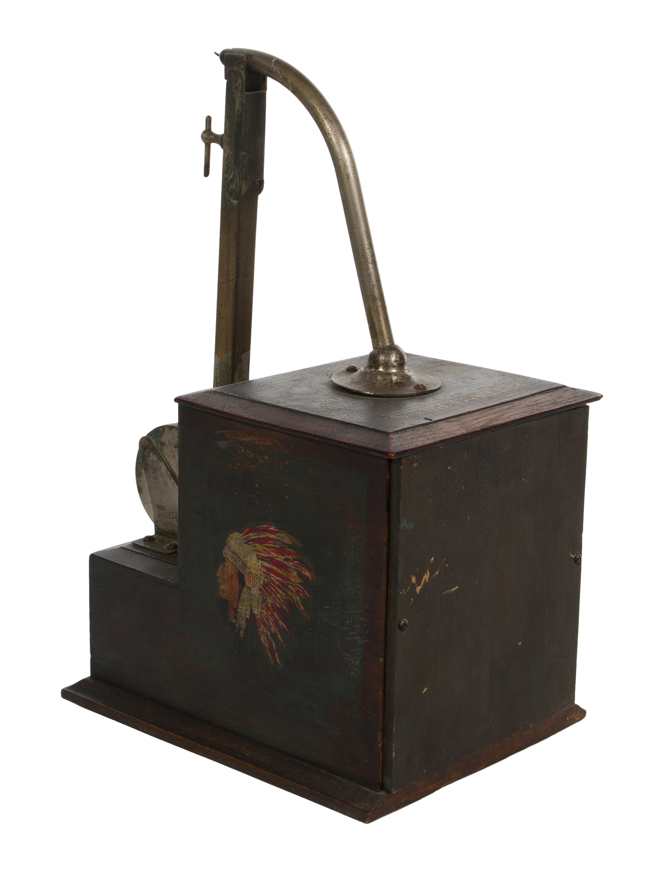 A c.1910 jump spark table cigar lighter marked on fuel reservoir brackets ‘THE WIRELESS / No. 12 / ELDRED MFG. CO. / CHICAGO’, the wood case having gilt lettering to front and top reading ‘THE IRMA / Saloon CIGAR LIGHTER / BUFFALO BILL’S very own HOTEL’ and having multi-color Native American profiles to sides