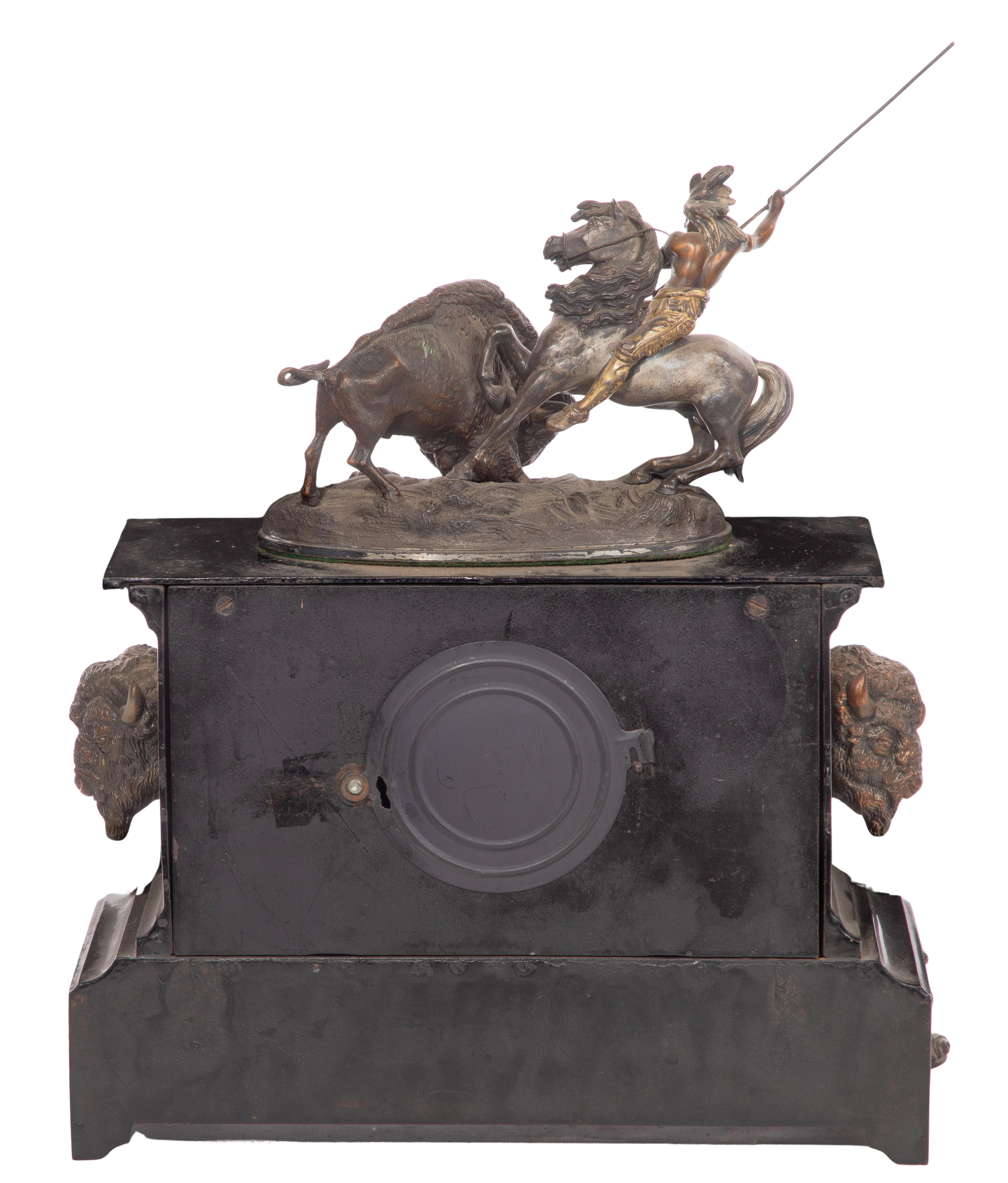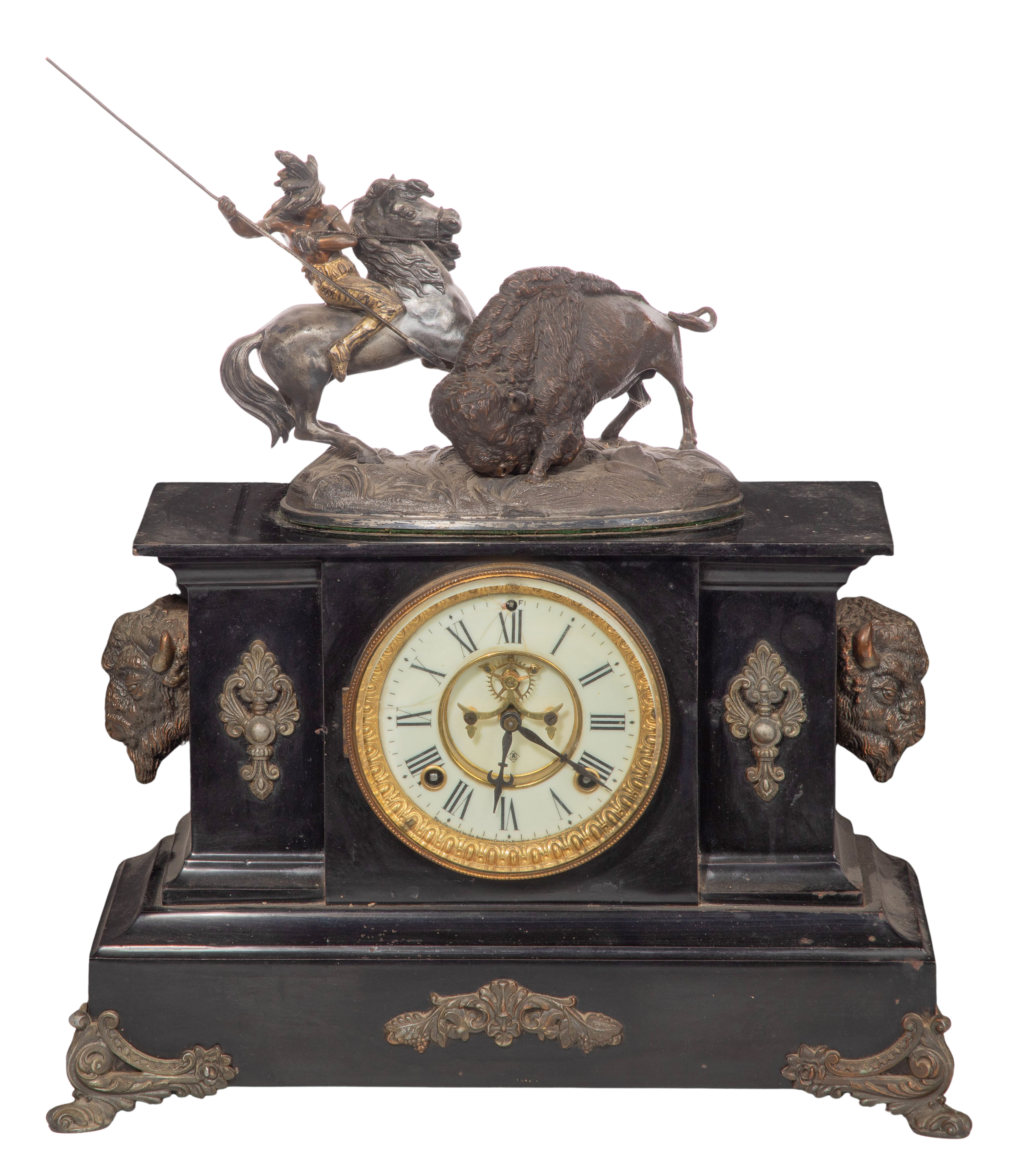 Roman numeral enamel dial having two key ports, fast / slow adjustment port, the ‘A’ mark and manufacturer’s statement just visible above bezel, behind brass framed glass, the black slate marble case having copper alloy feet and mounts, including bison head handles at sides, supporting a depiction of a warrior about to spear a buffalo, the brass movement stamped ‘Ansonia Clock Company’