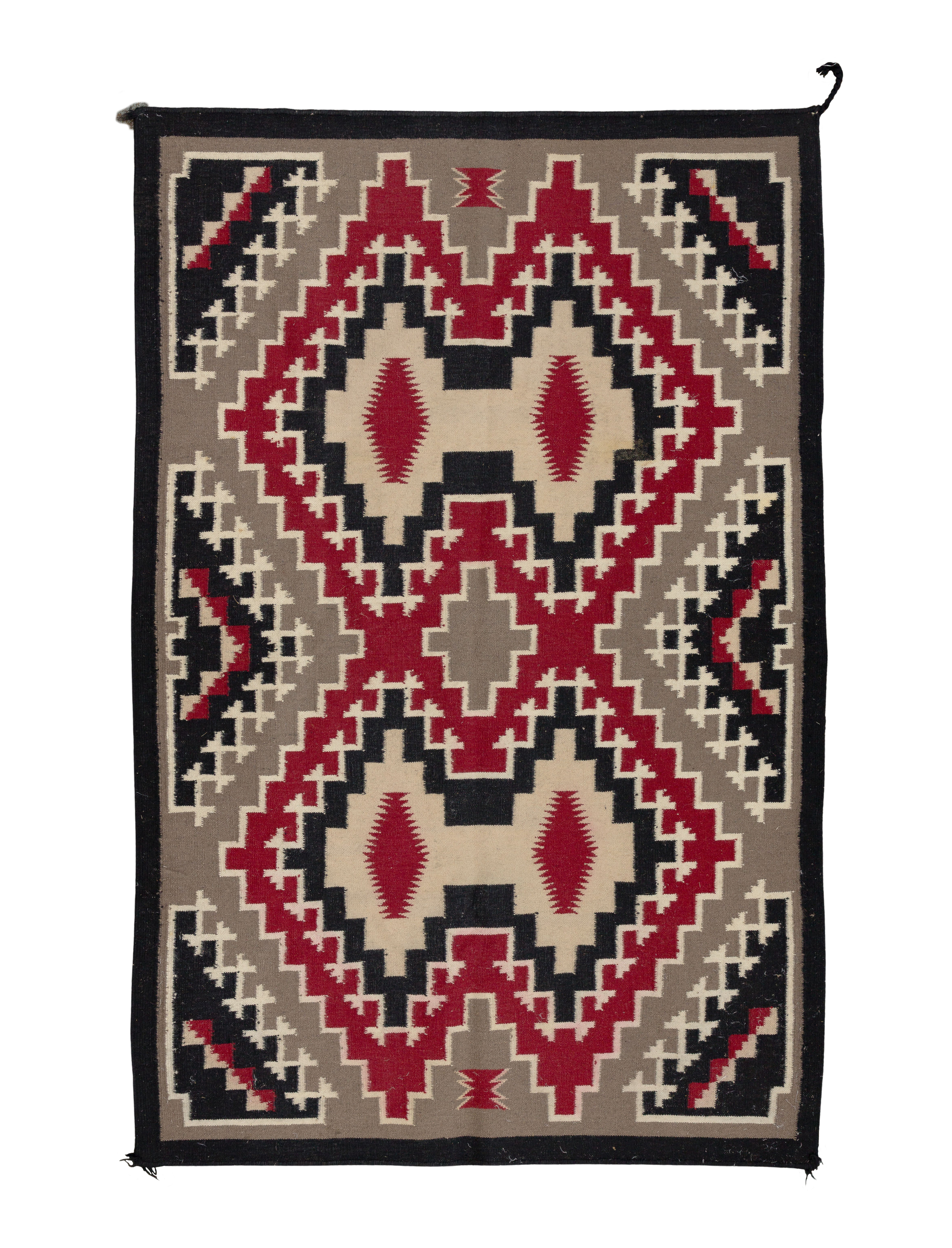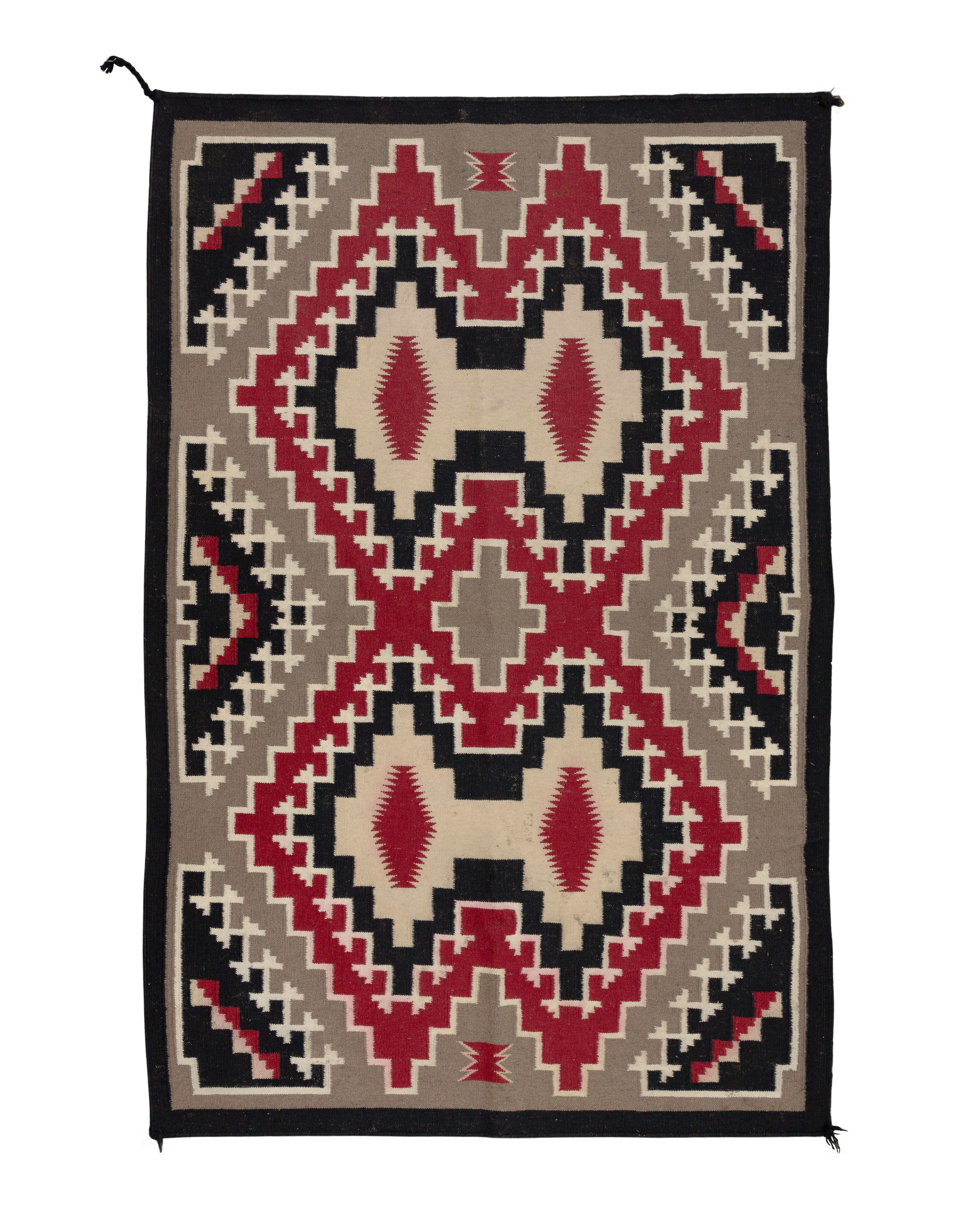 Handwoven flat weave Klagetoh style on a geometric motif in natural colors of grey and brown accented in red