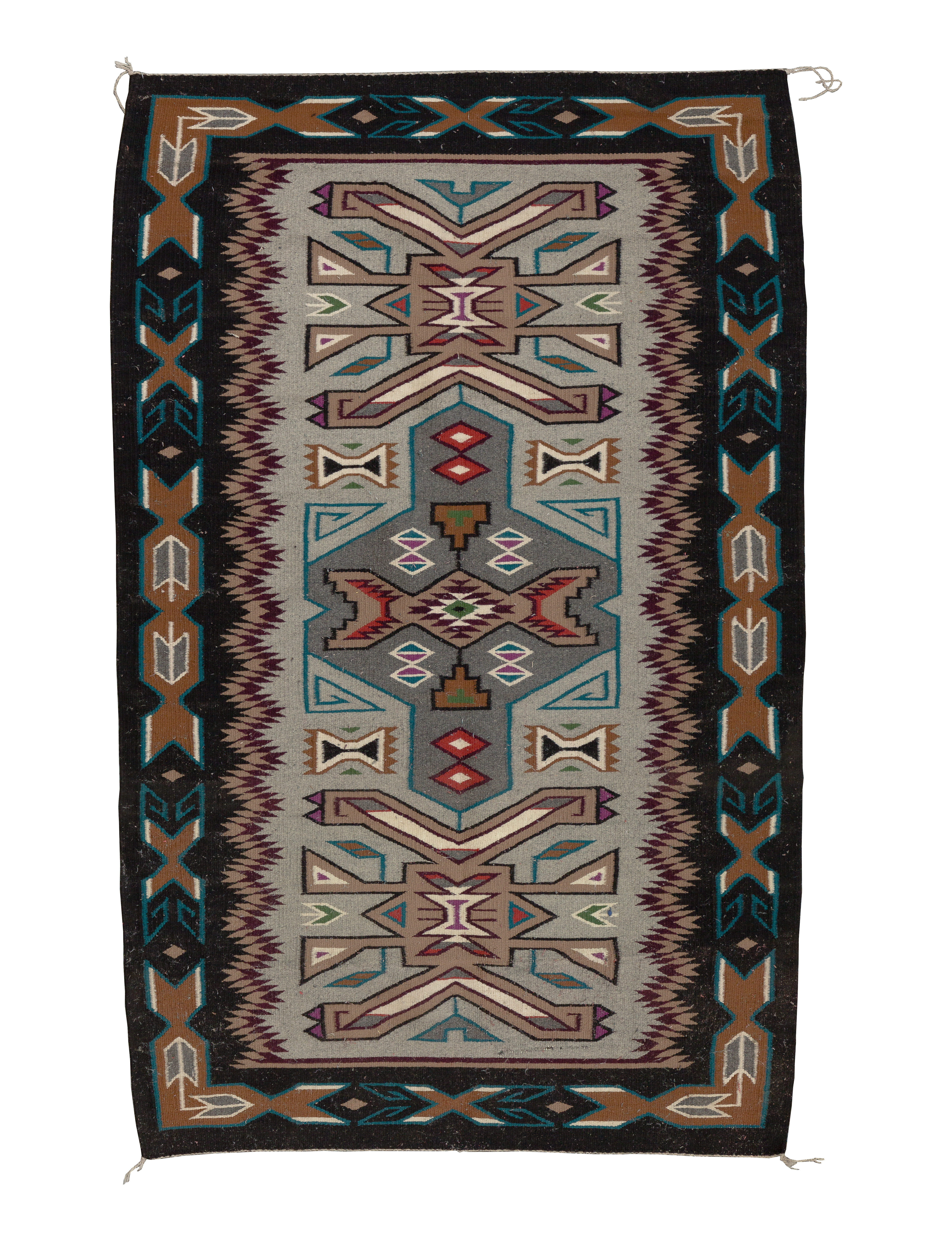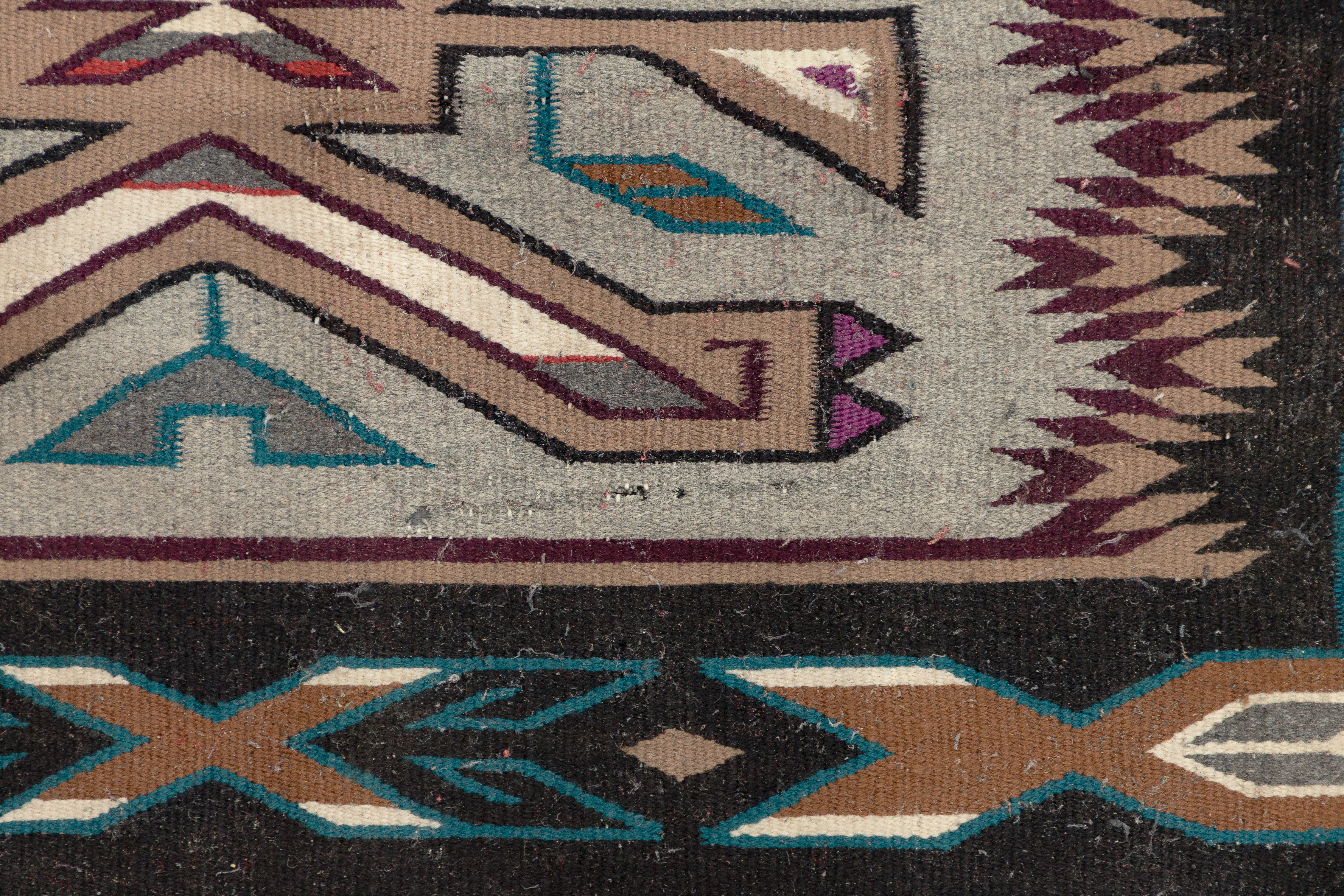 Woven in jewel tones including turquoise, purple, green, cream, gray and black having a geometric motif