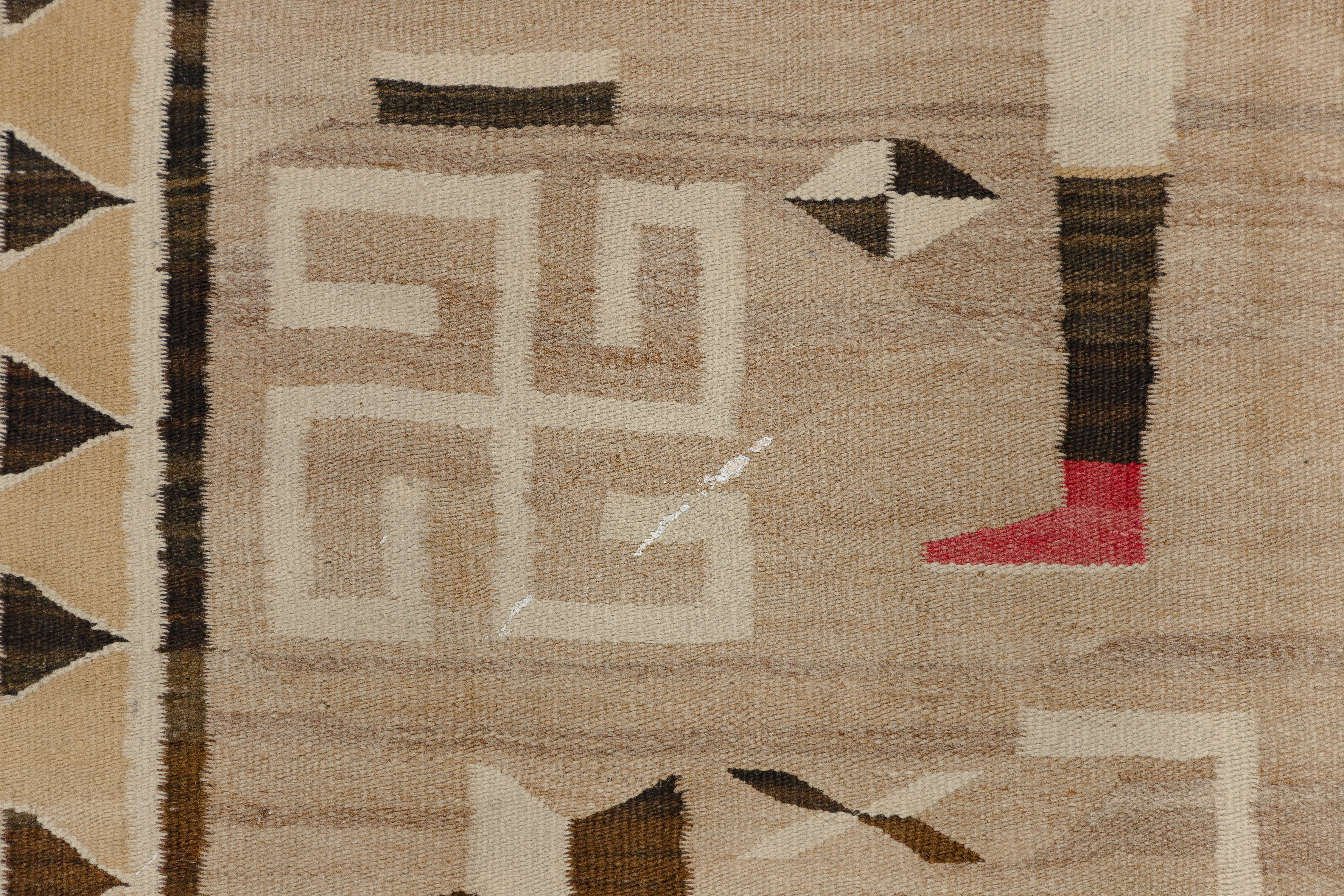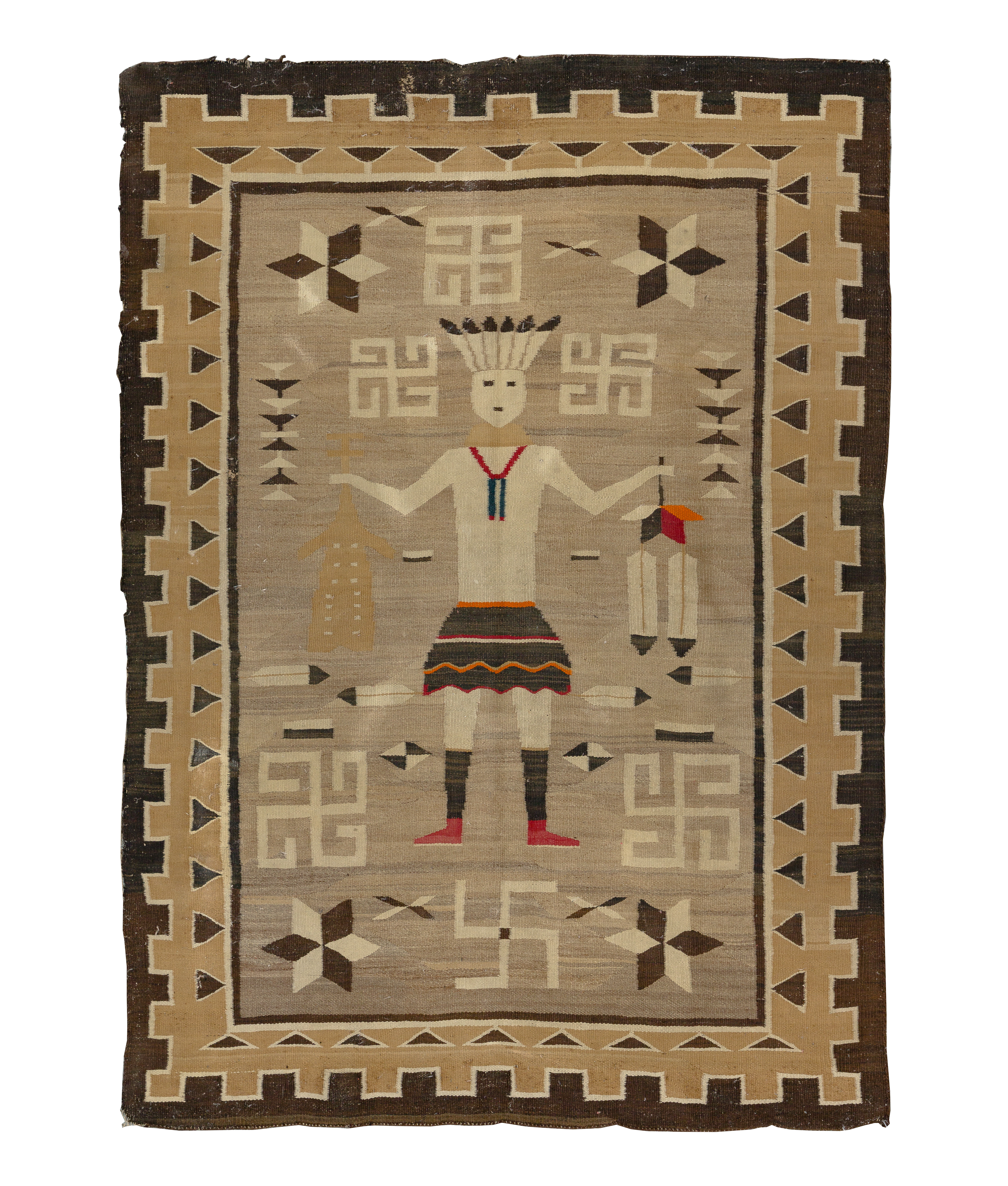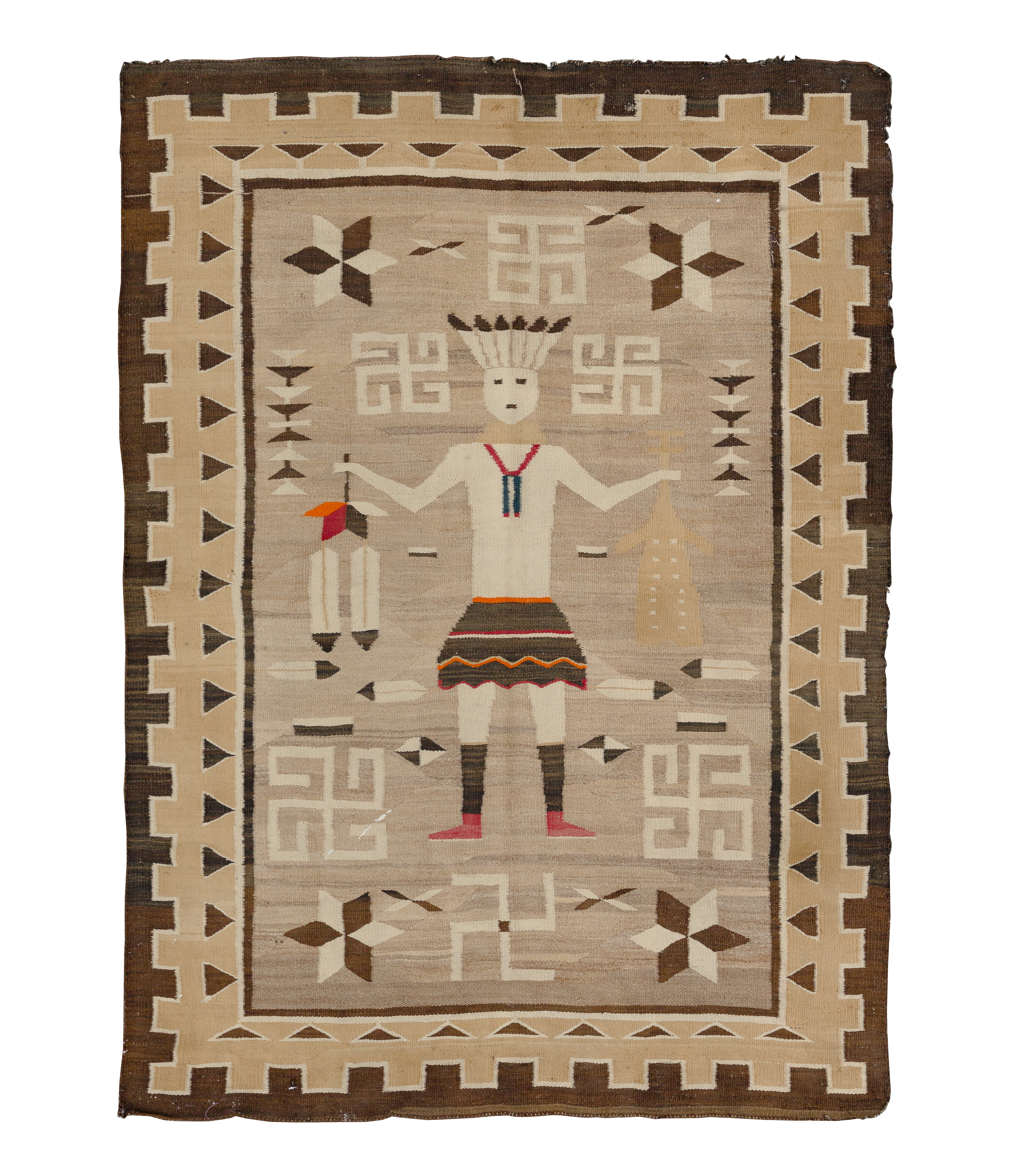 Pictorial weaving depicting a single Yei figure surrounded by feathers, stars and whirling logs woven in reds, blacks, oatmeal and cream