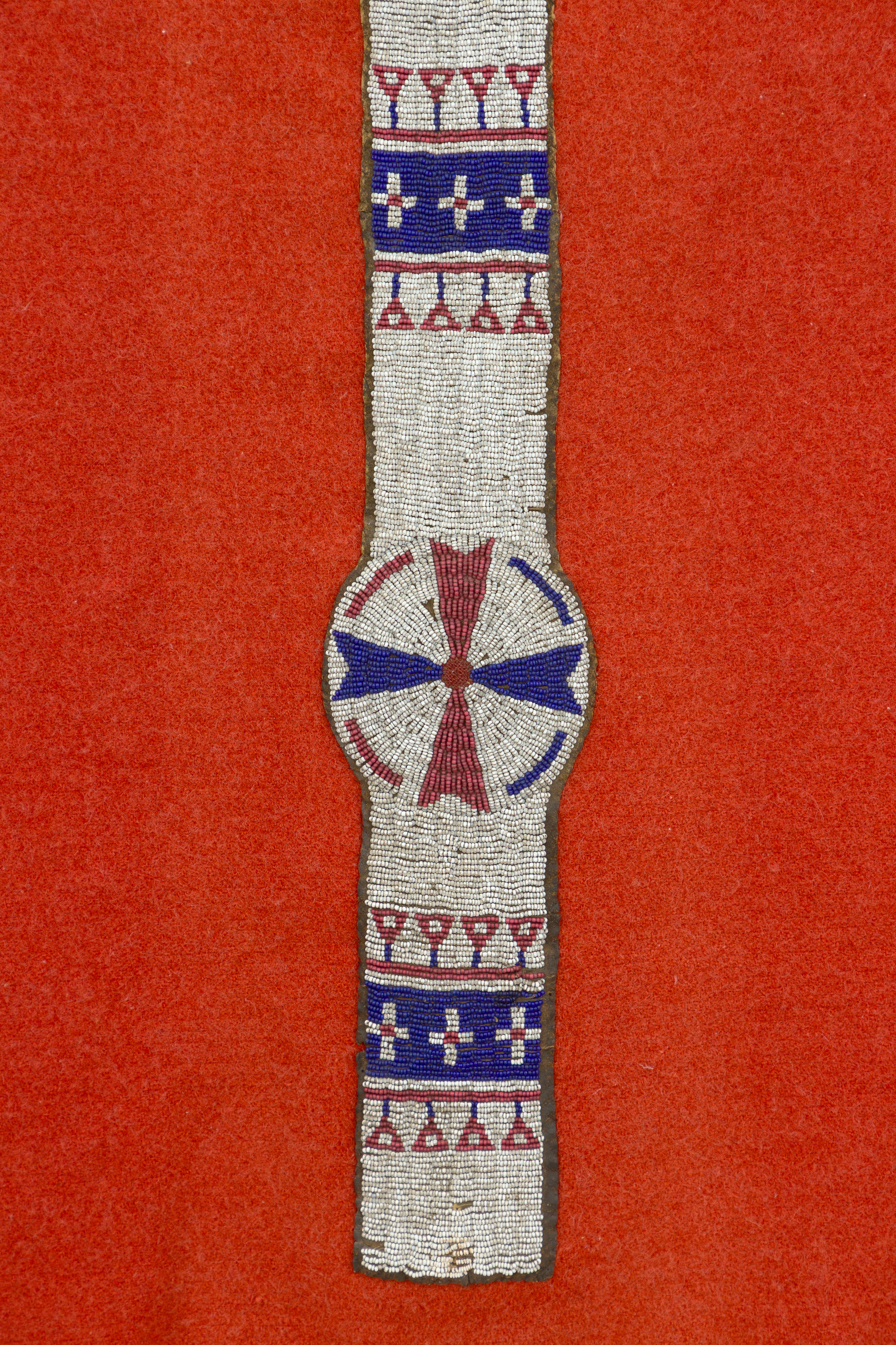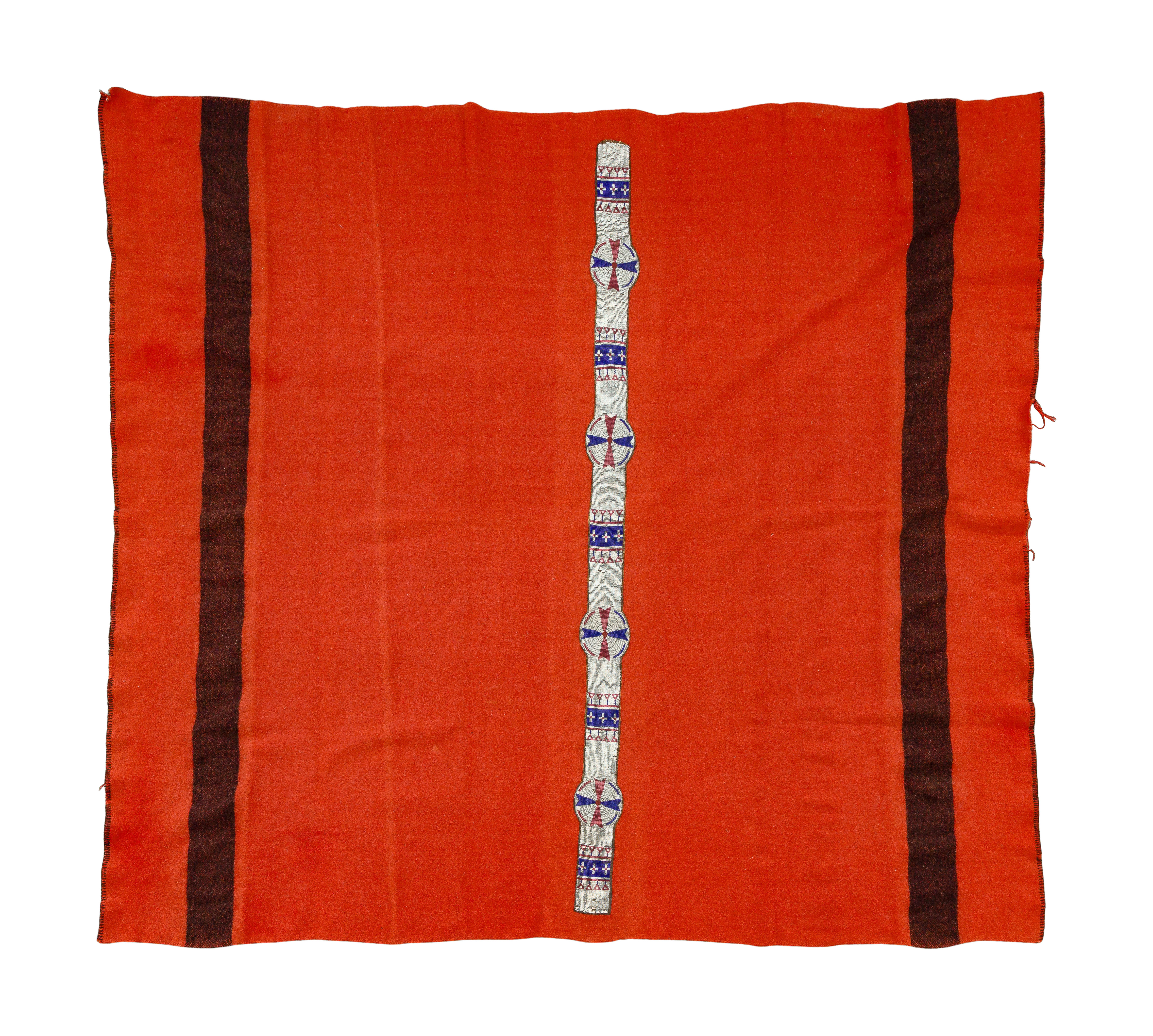 c. late 19th century, trade blanket having beaded hide strip, the strip having multicolored geometric designs on a white ground