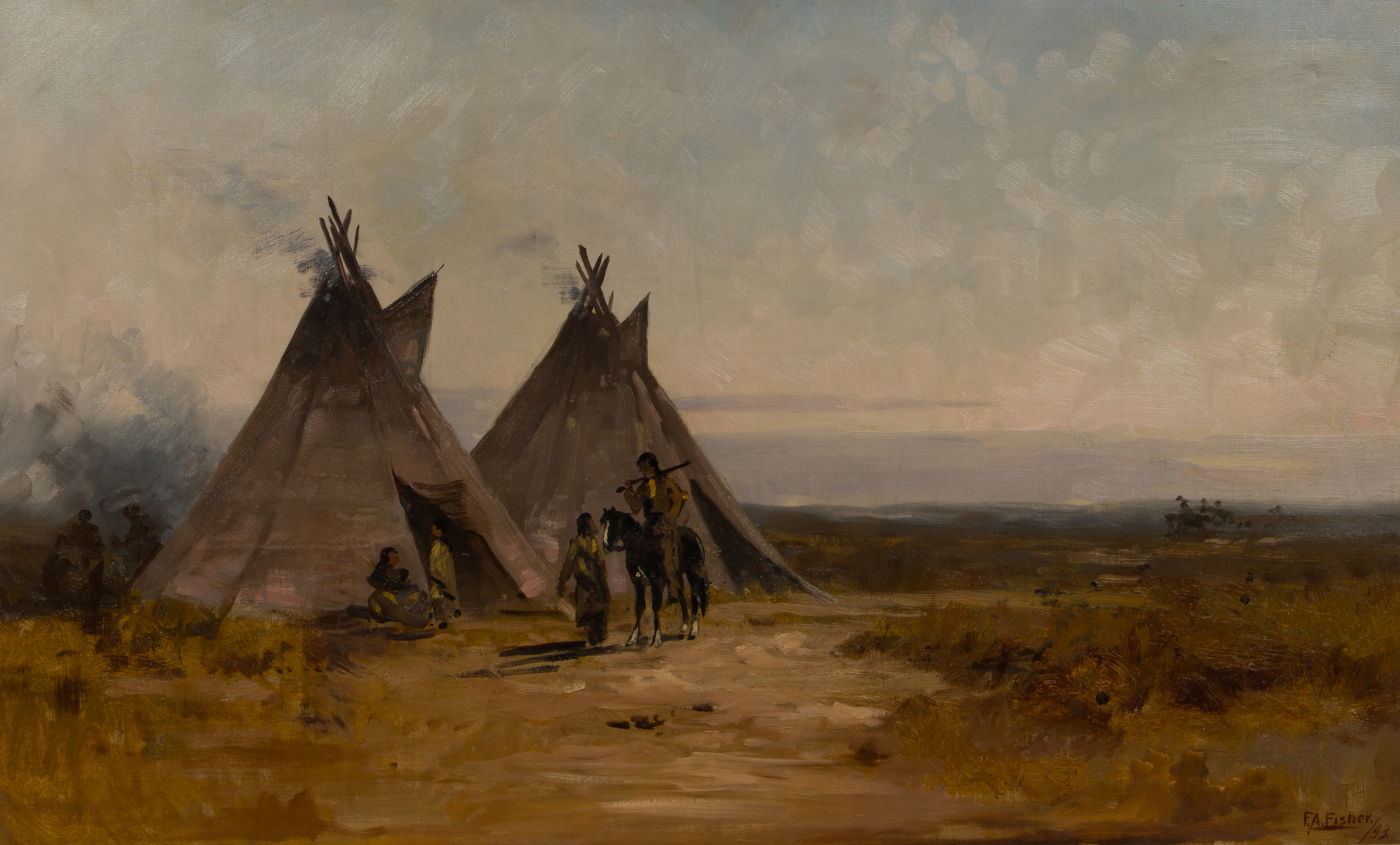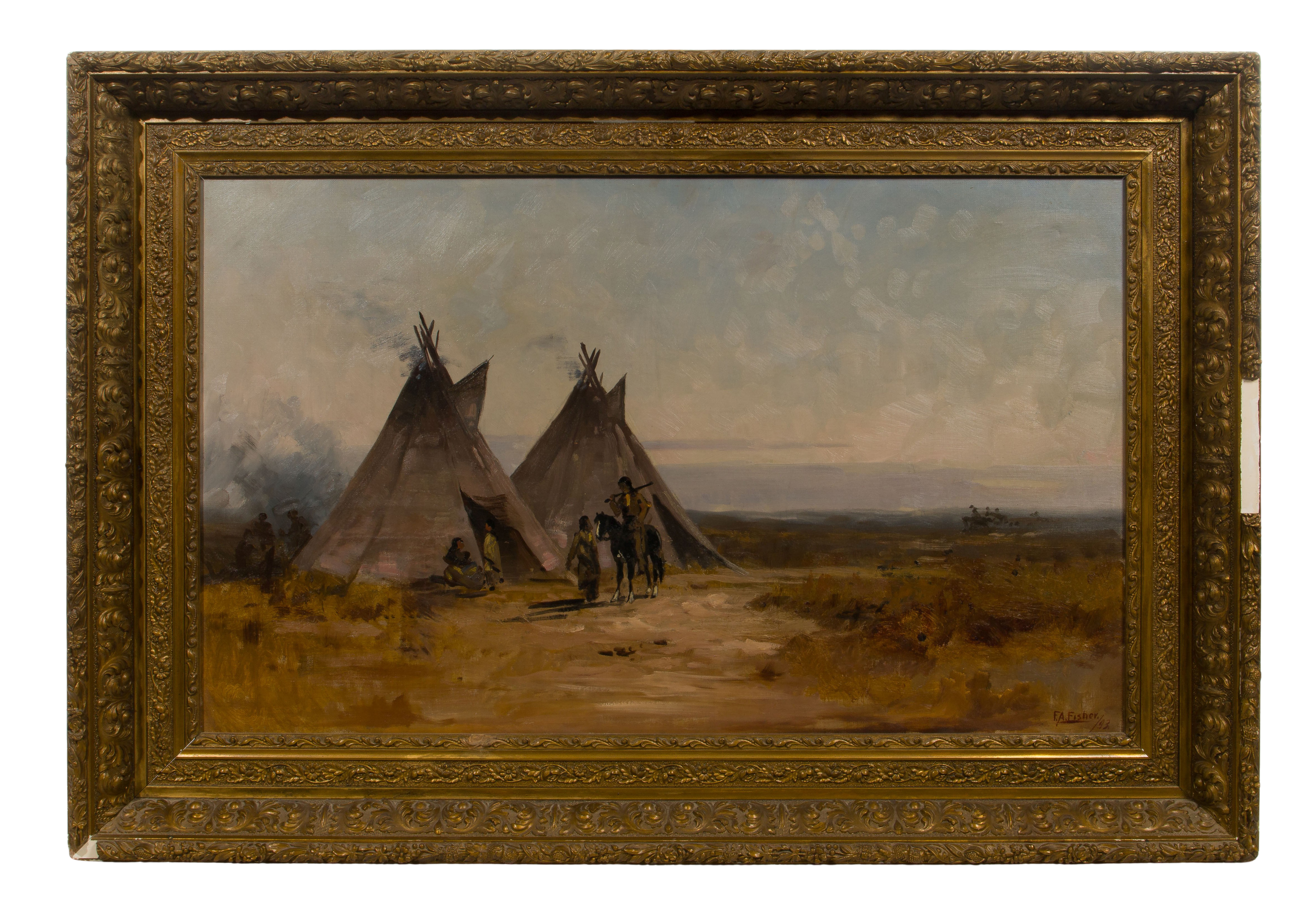 1893, signed, depicting two teepees, in a gold-tone gesso on carved wood frame having Northshore Gallery, Edmunds, Washington form listing restorations, Allard Auctions, Inc. print-out and catalog pages illustrating the painting attached verso