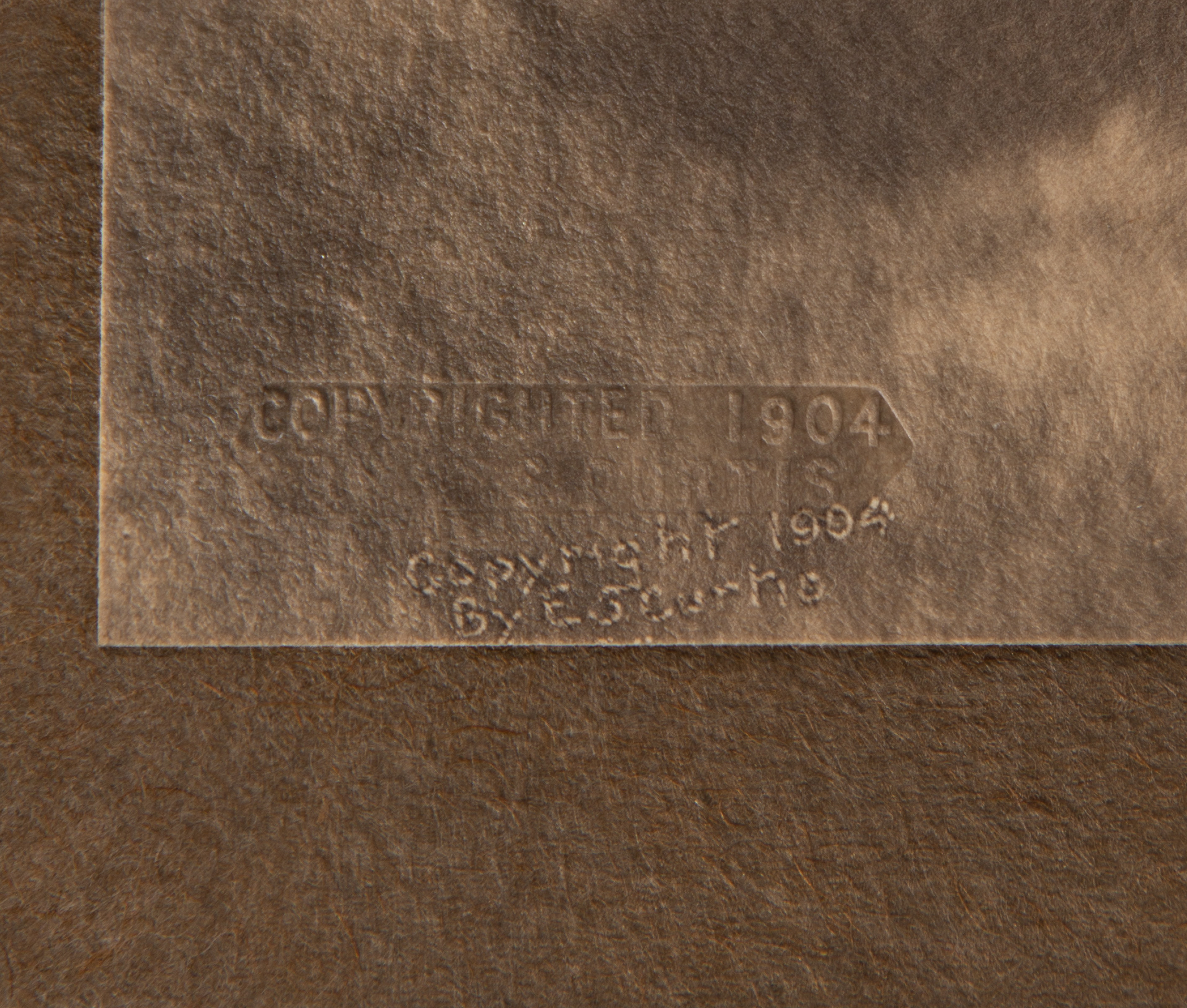 Copyright 1904, printed signature, depicting traditionally dressed Native American Indians on horseback, retaining paper label on verso of frame