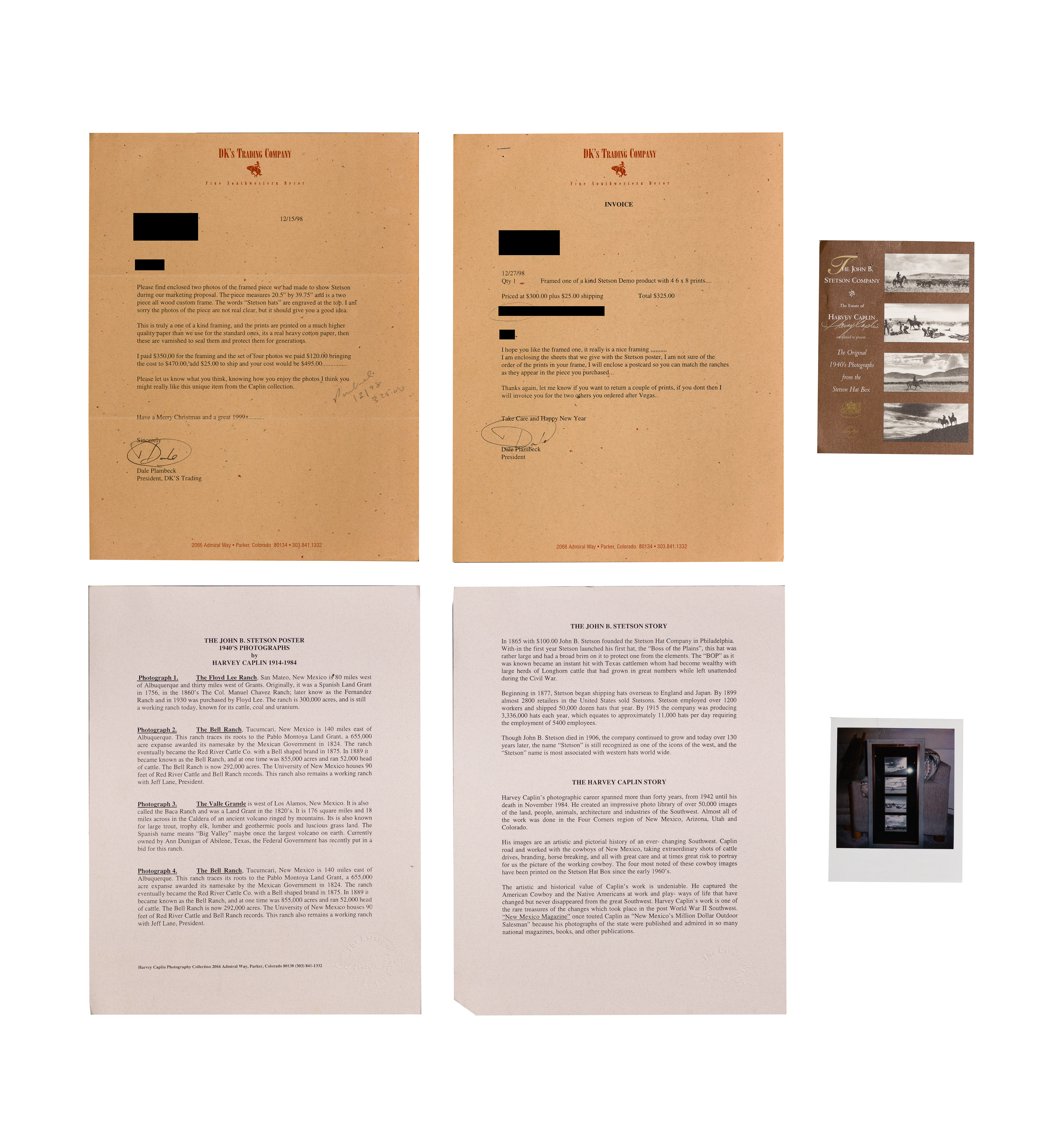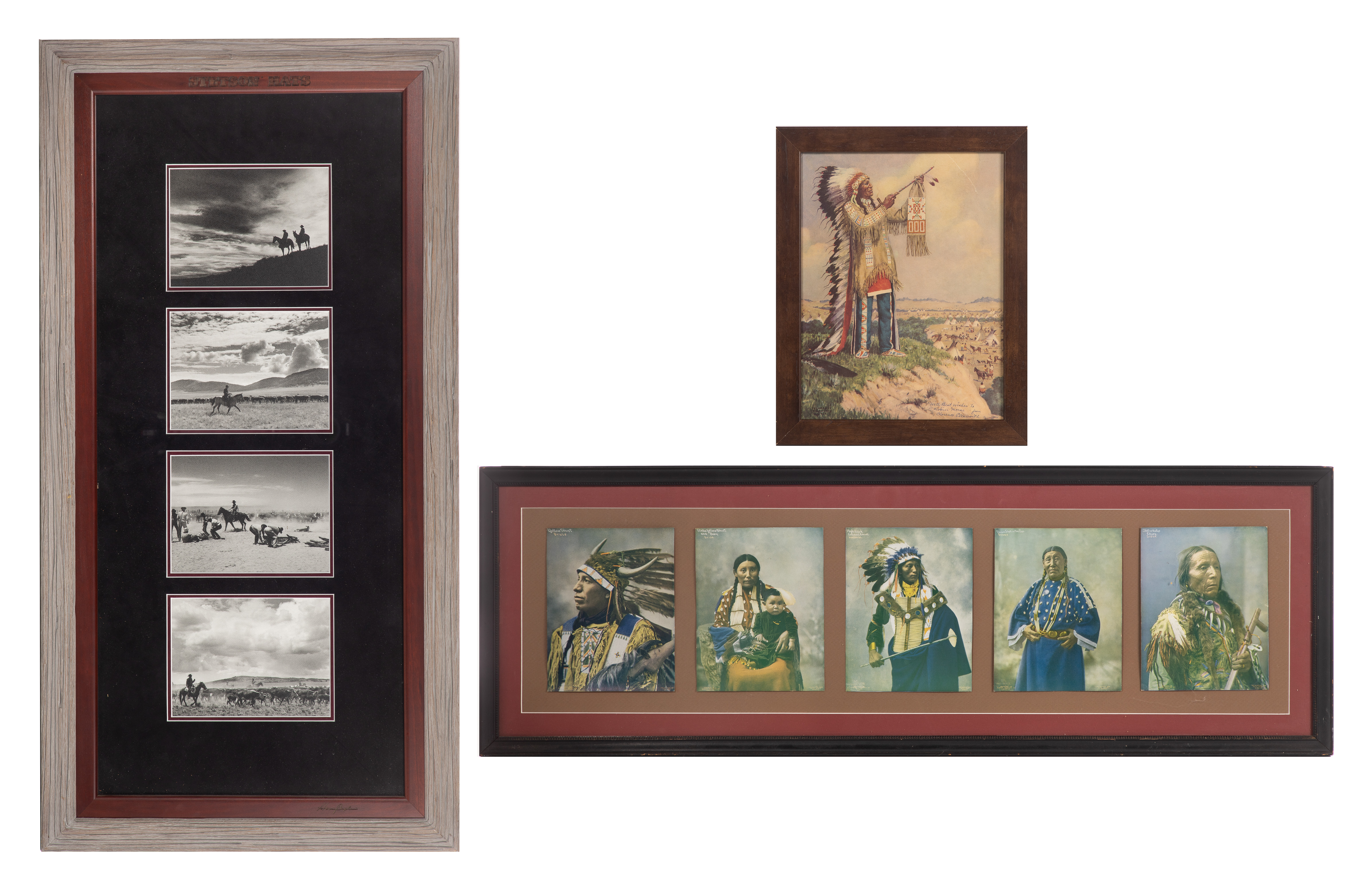 (3) total items including a 1934 Ellsworth print having pen signed dedication, in a wood frame; together with framed 1899 group of Burkley Printing Co. Native American offset lithographs and a framed group of Henry Caplin for Stetson photographic prints, including descriptive paperwork