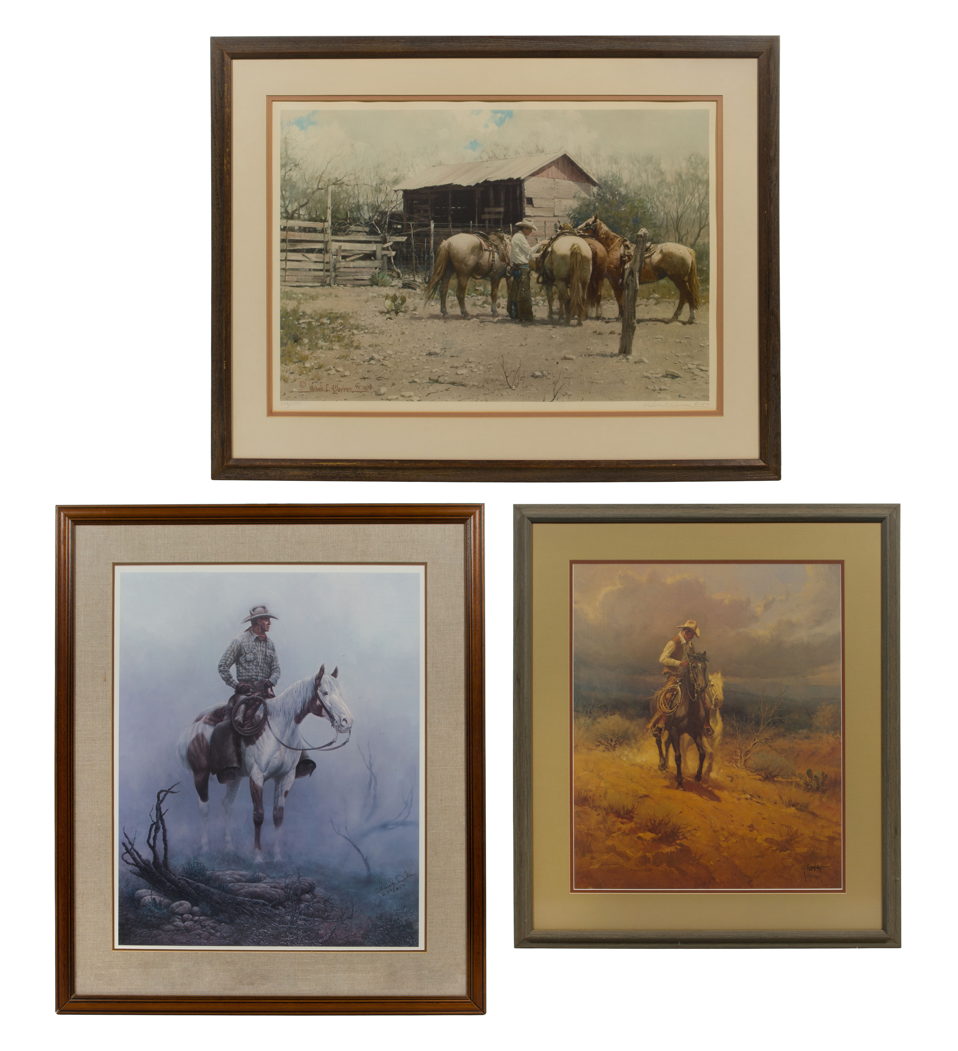 (3) items, all photolithograph after paintings, including Melvin Warren (American, 1920-1995) 1974 ‘Top Hand on the Concho’, #398/750, Chuck DeHaan (American, b.1933) 1979 ‘Foggy Mornin’ Wait’, #639/650 and G. Harvey (American, 1933-2017) 1975 ‘The New Philly’, #131/150, all matted behind glass in wood frames, ‘Foggy Mornin’ Wait’ having a Guildhall Prints Inc. COA attached to verso