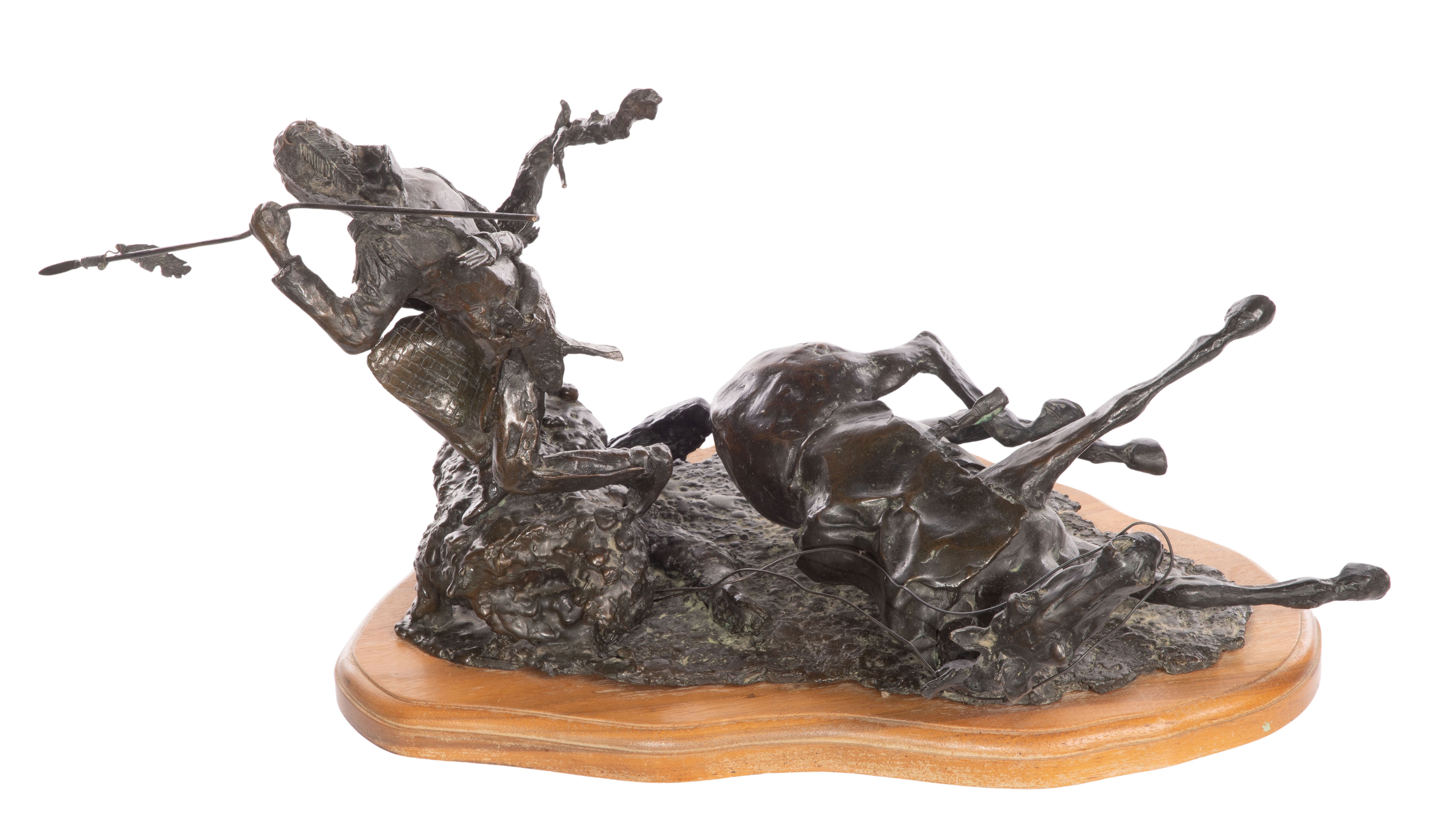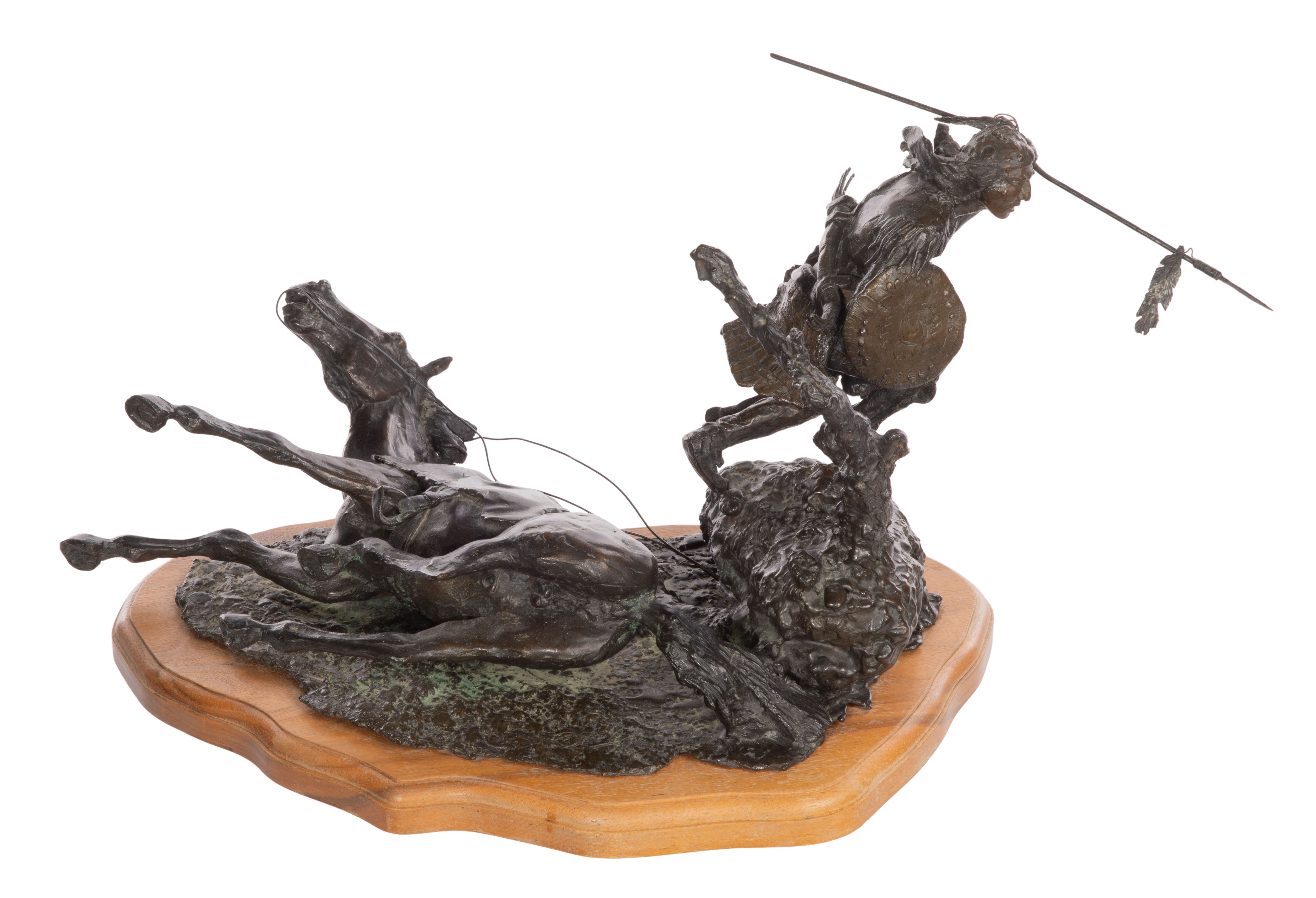 Undated, patinated bronze, signed and titled in cast, depicting an Indian warrior with his fallen horse, on a conforming wood base