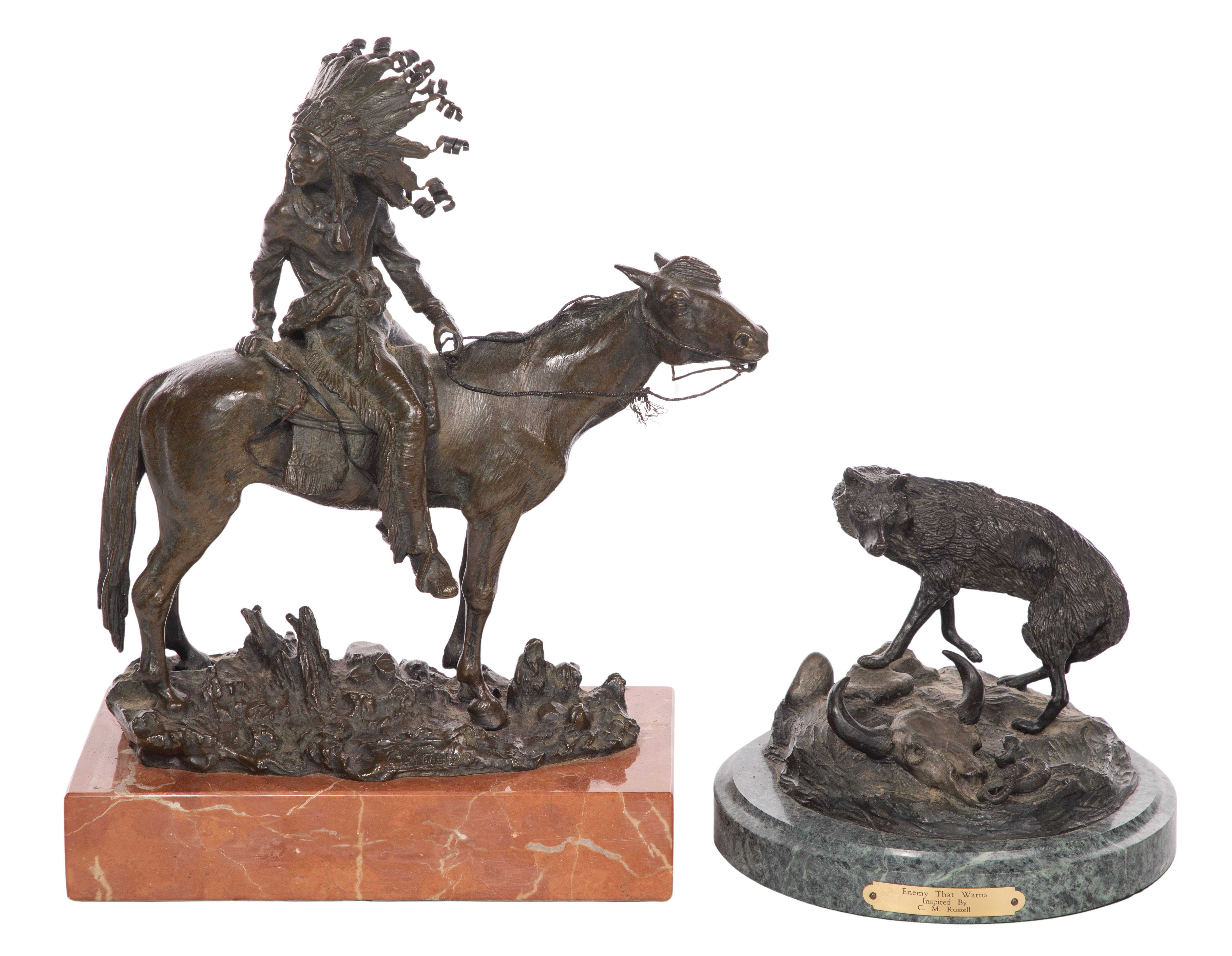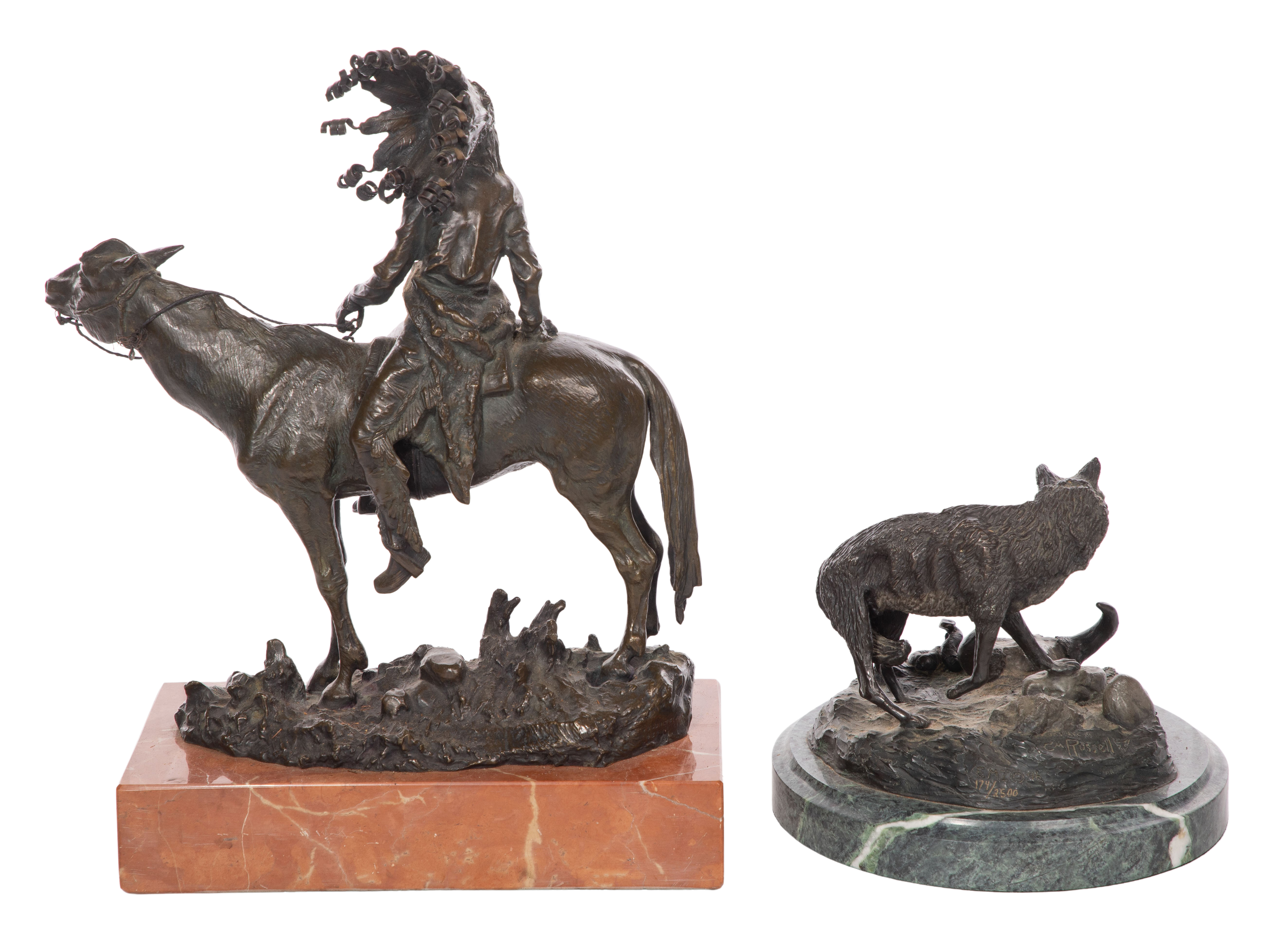 (2) total items including the depiction of a chief on horseback by Kauba having cast signature and a marble base; together with a depiction of a coyote alarmed by a rattlesnake having emerged from a steer skull, after Charles Russell having cast signature, on a marble base