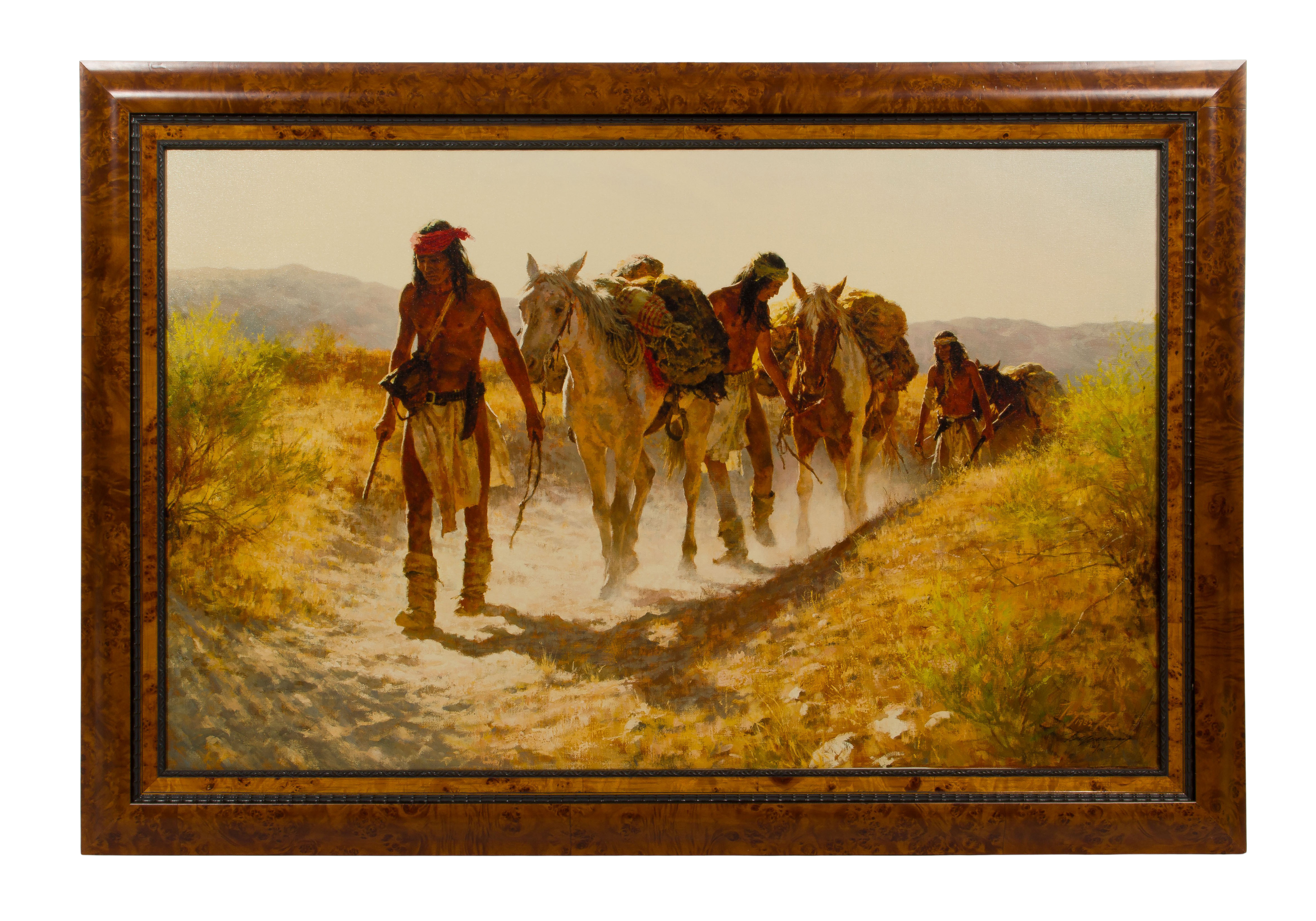 1982, signed, #130/175 near printed signature, depicting warriors leading stolen pack mules, in a faux burl wood frame