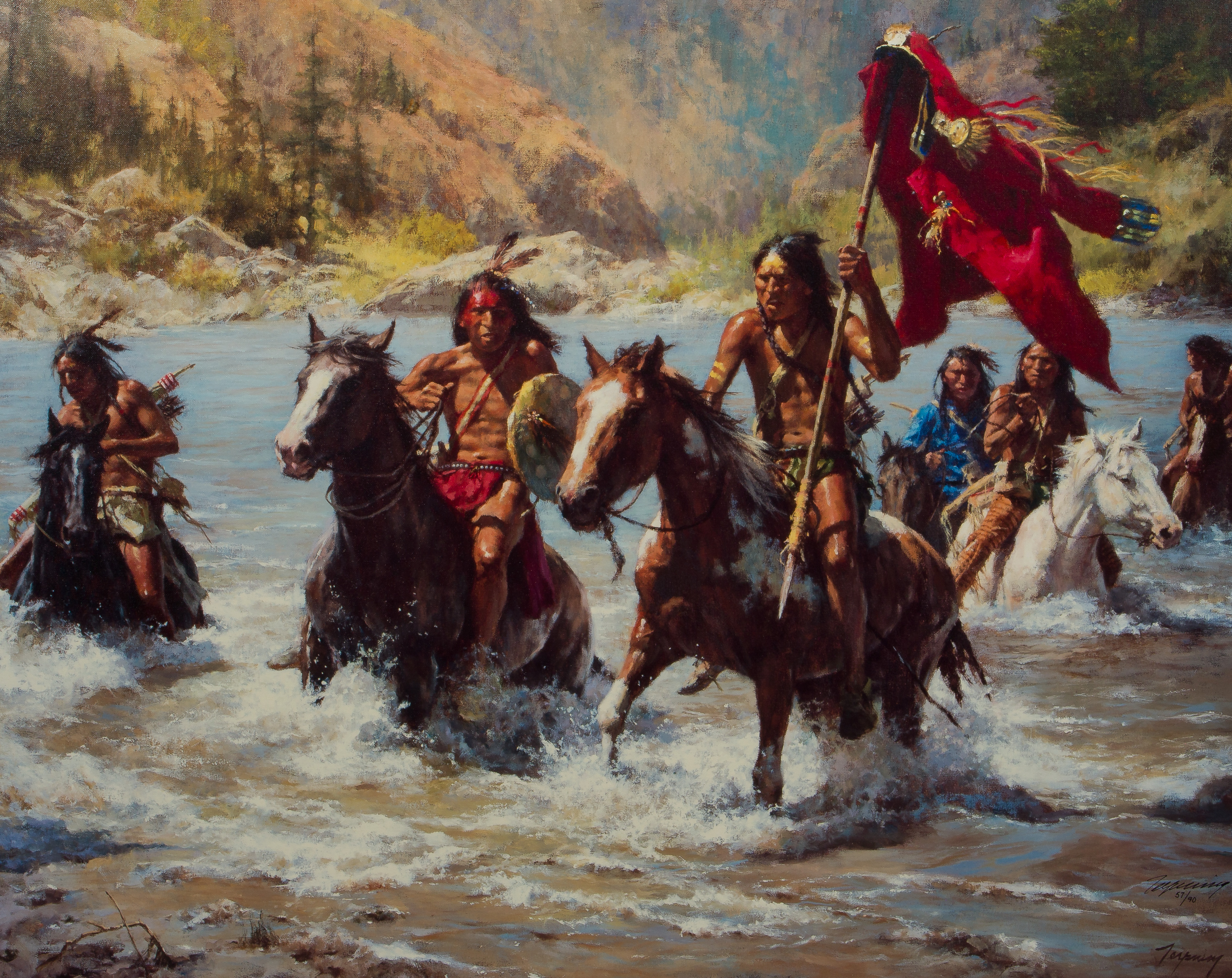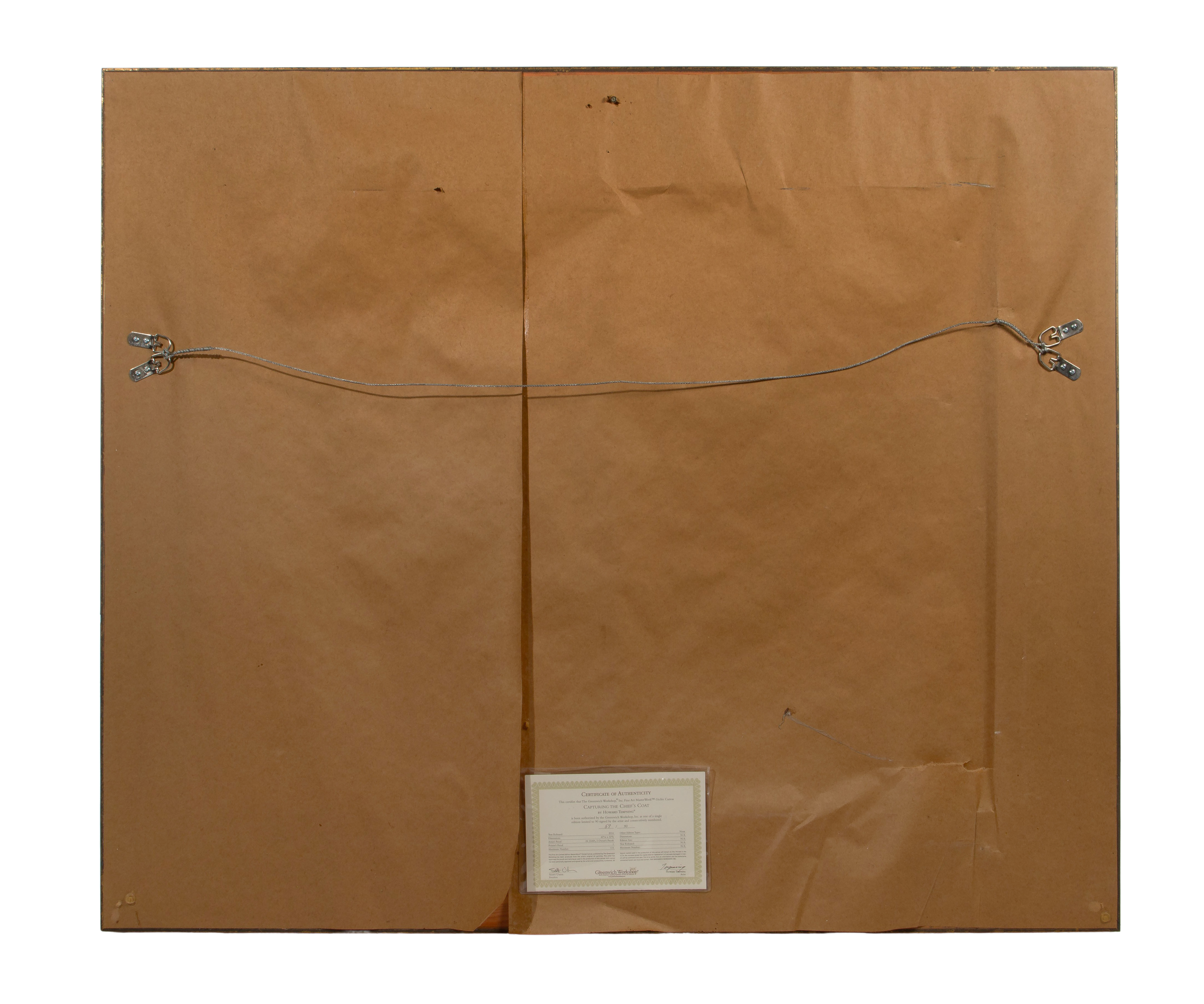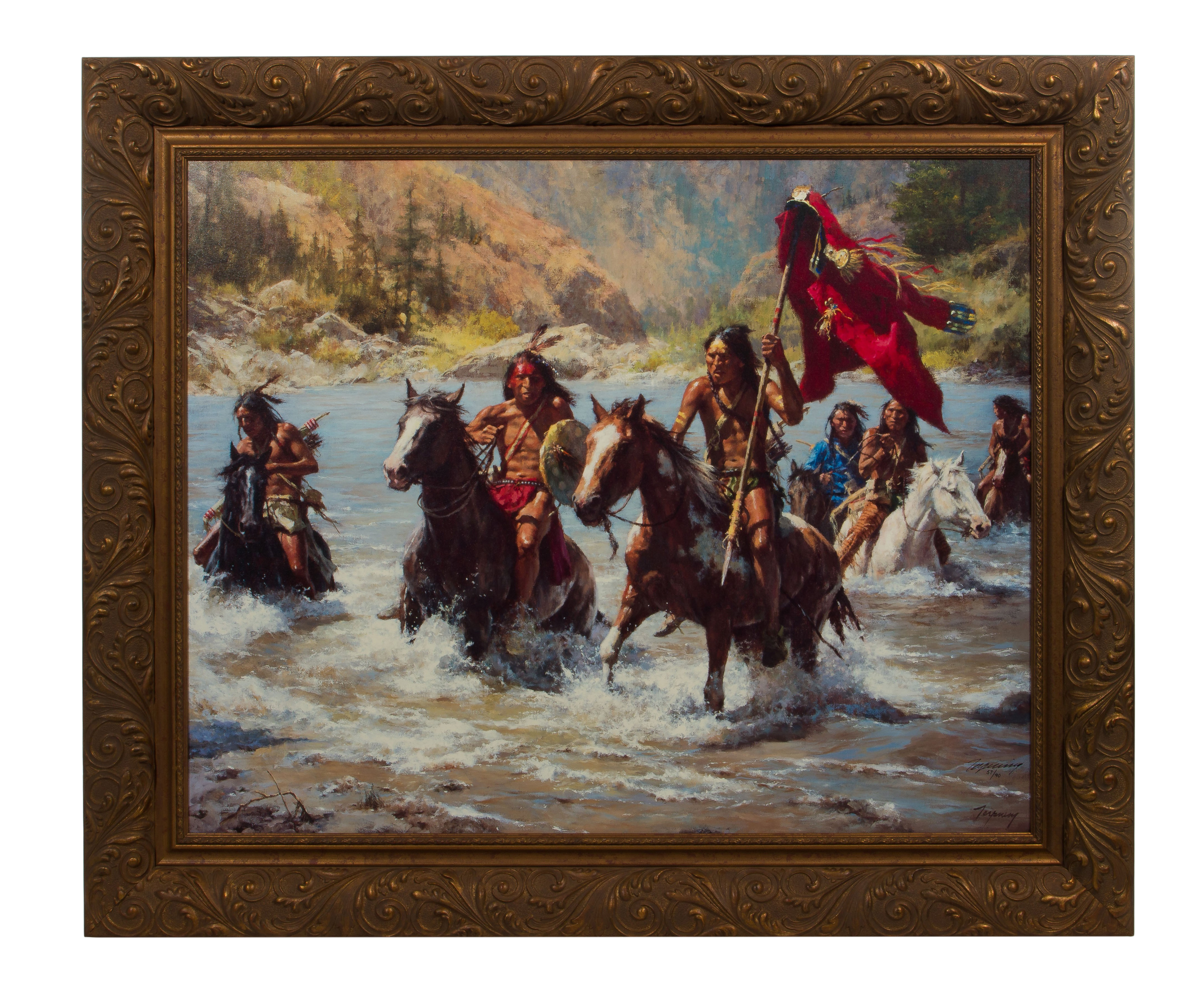 2014, ink signed and #57/90, depicting a war party making off with a trophy, in a gold-tone composition on wood frame having a Greenwich Workshop Inc. Trumbull, Connecticut signed and dated COA attached verso