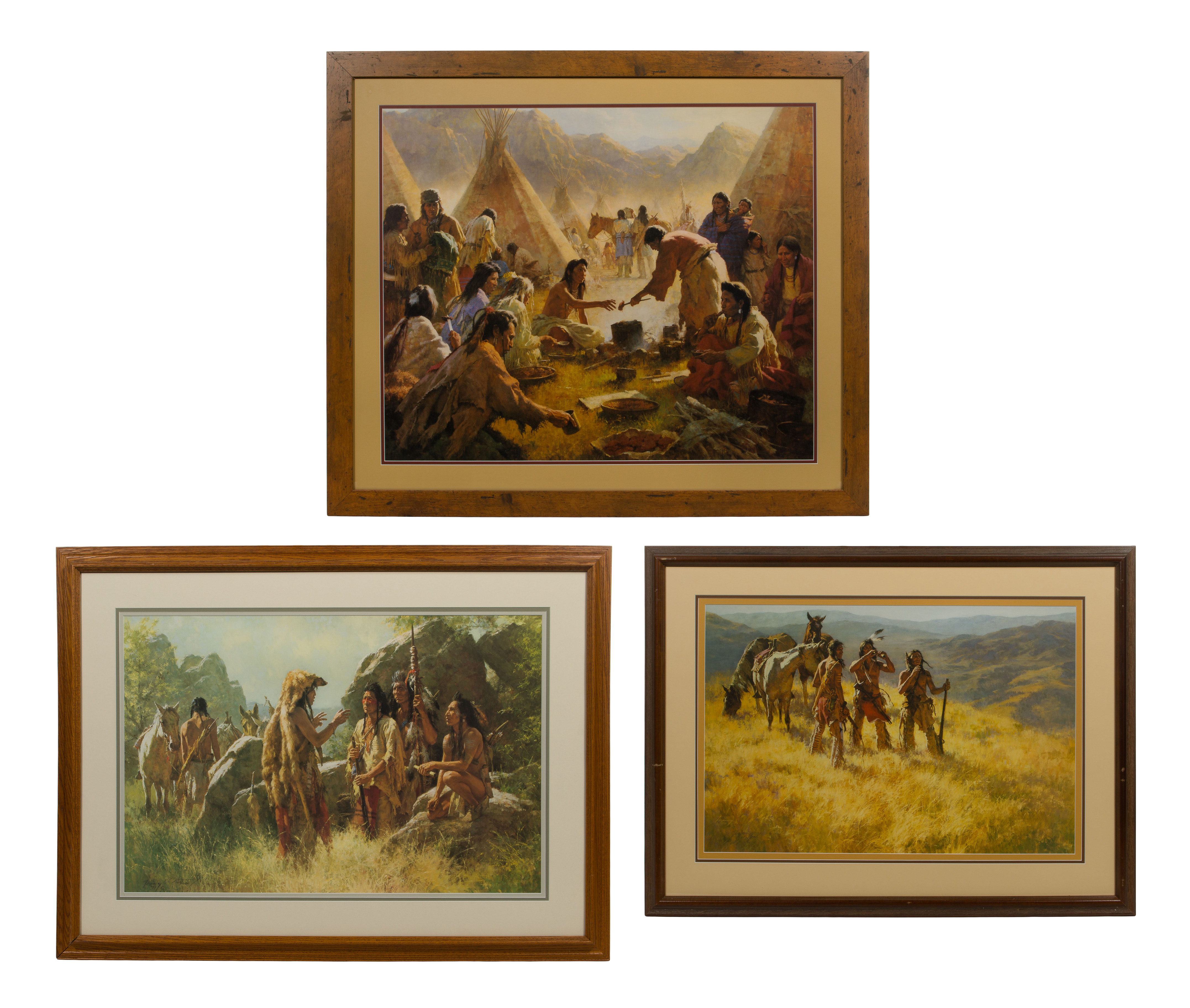 (3) items, photolithograph after paintings, pencil signed and numbered near printed signature and date, including 1994 ‘The Feast’ #824/1850, 1988 ‘Scout’s Report’ #168/1250 and 1981’Dust of Many Pony Soldiers’ #AP 30/50, all matted behind glass in wood frames, ‘The Feast’ and ‘Scout’s Report’ having Greenwich Workshop Inc. Trumbull, Connecticut COAs attached verso