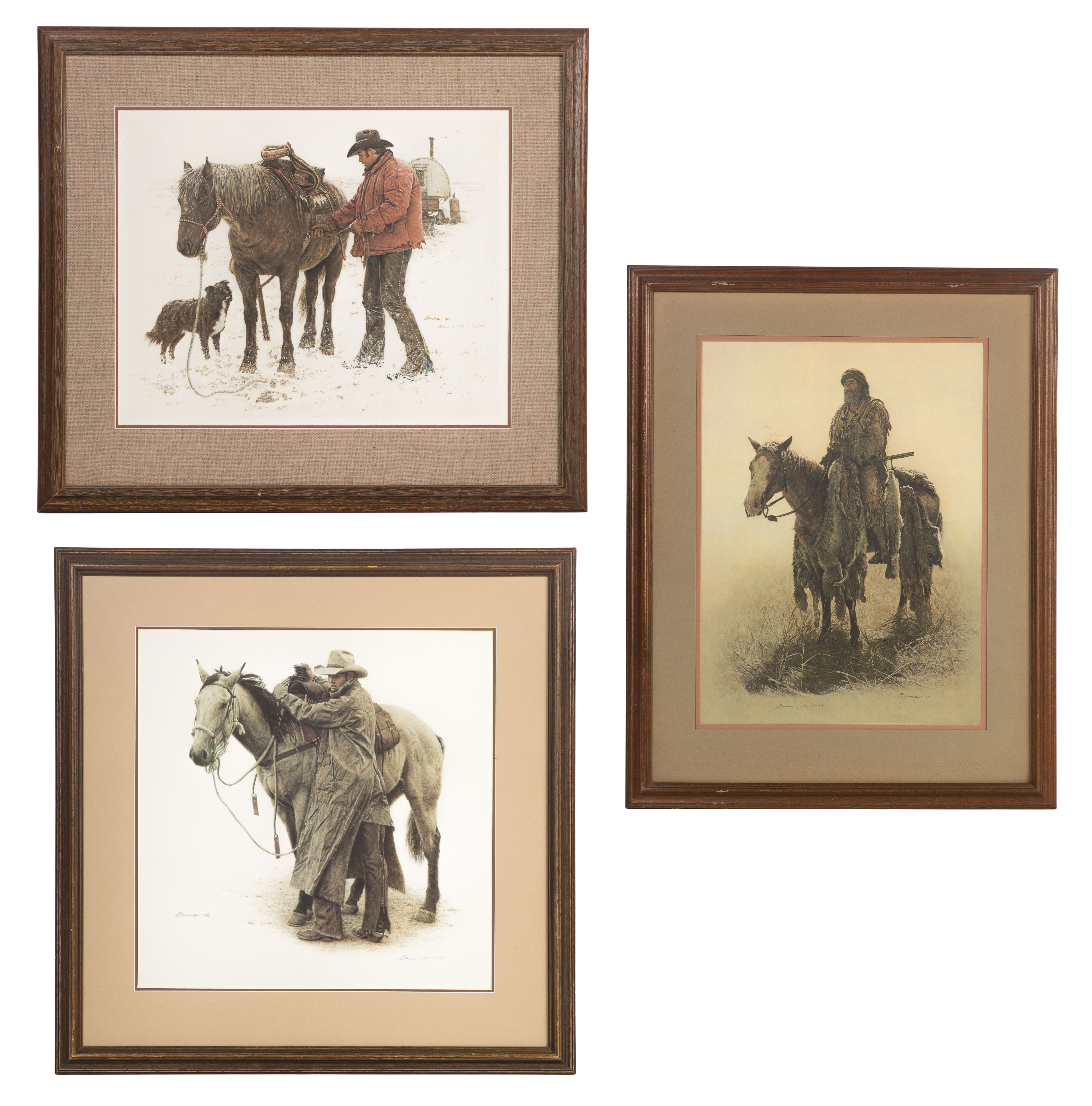 (3) pencil signed items including 1990 ‘Young Sheepherder’, #797/1500, 1988 ‘Bittin’ Up – Rimrock Ranch’, #795/1250 and 1972 ‘Timber Jack Joe Mountain Man’, #602/1000, all matted behind glass in wood frames