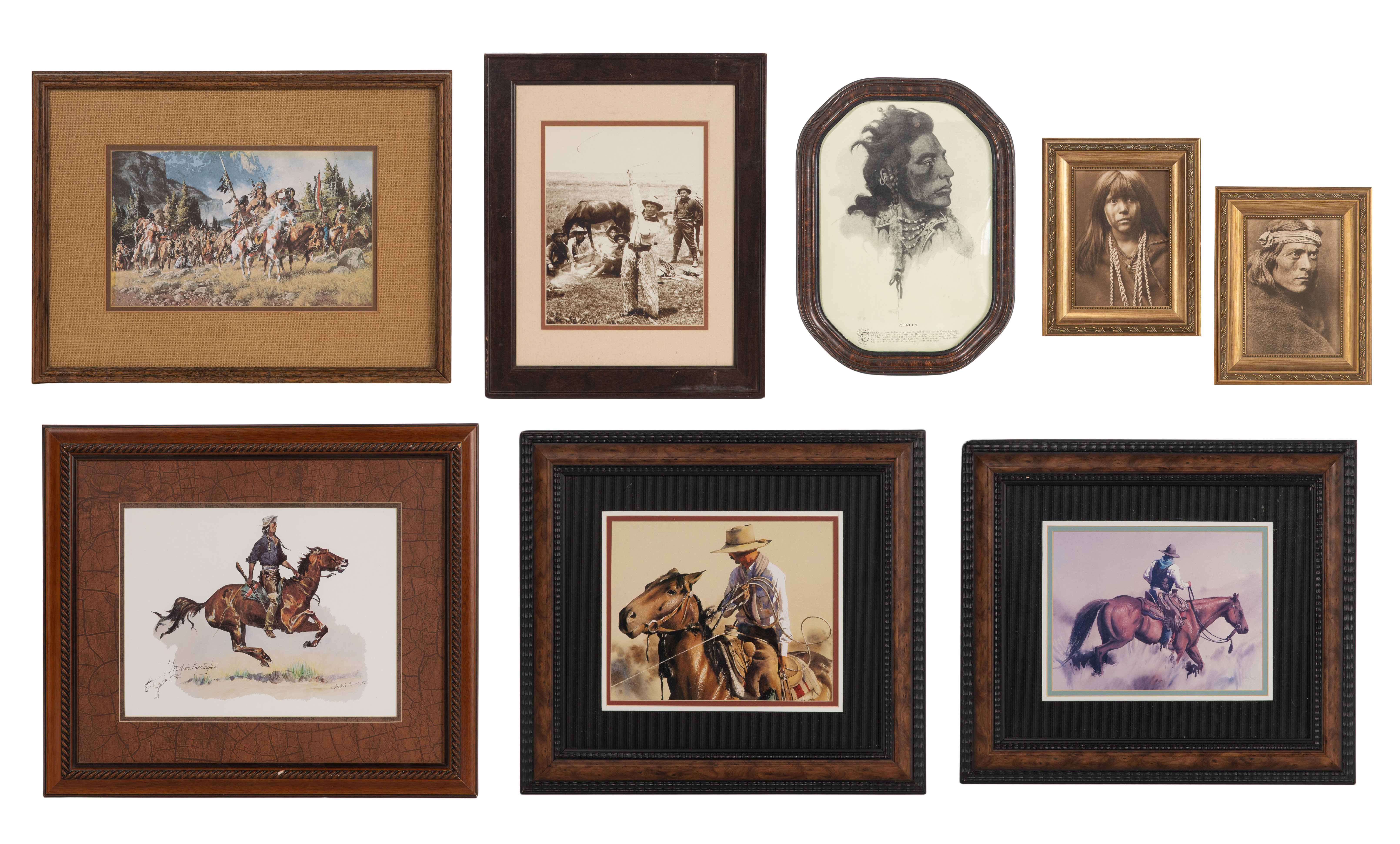 (8) items including (2) ethnic tribal portraits in matching frames, an Edgar S. Paxson ‘Curly’ framed book excerpt, an unknown artist photograph featuring a cowboy with lasso, an after Frederic Remington ‘Crow Scout’, (2) cowboy prints and an unsigned Frank C. McCarthy Native American scene