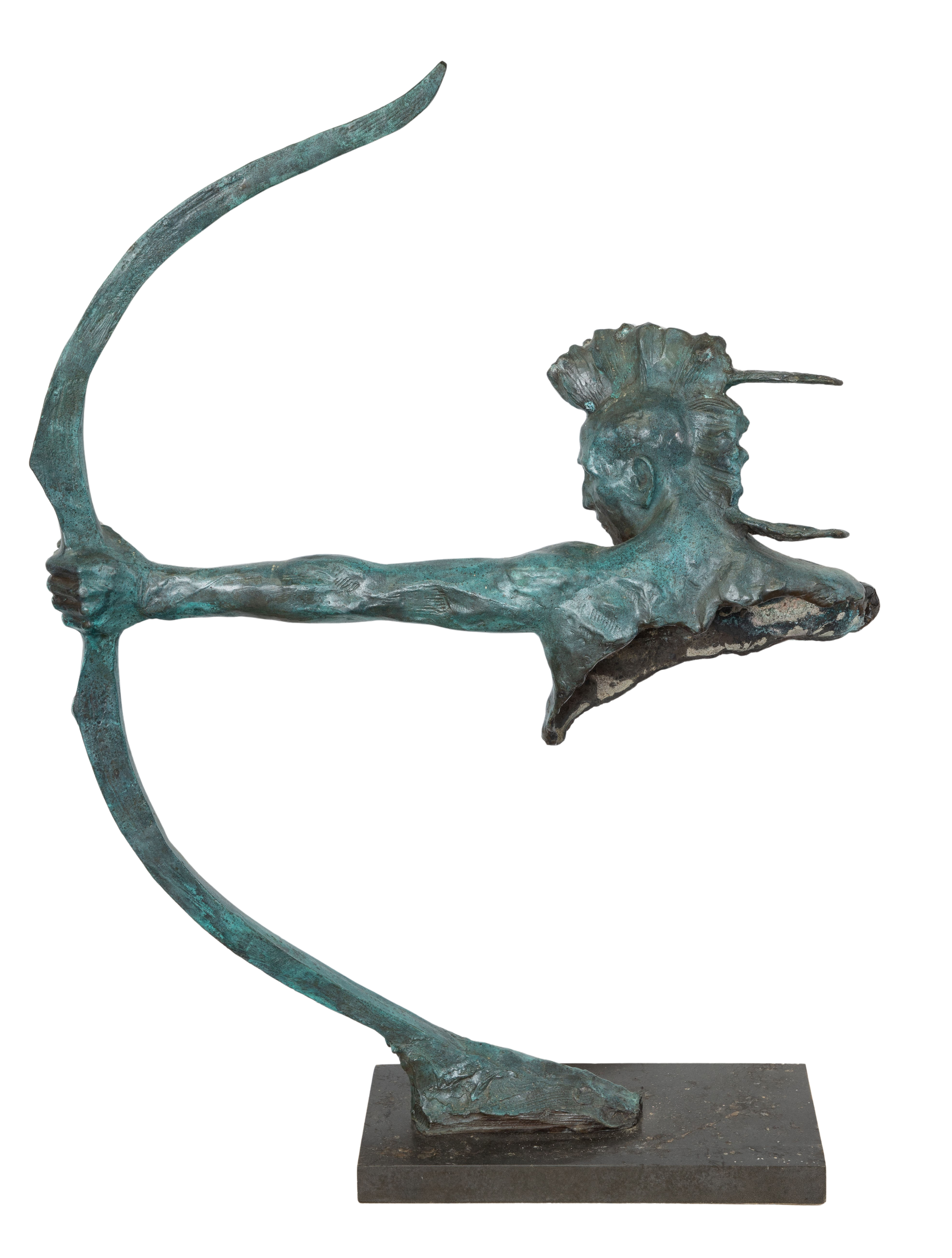 2000, signed on bottom edge of sculpture, depicting an Native American warrior holding a bow, on a marble plinth