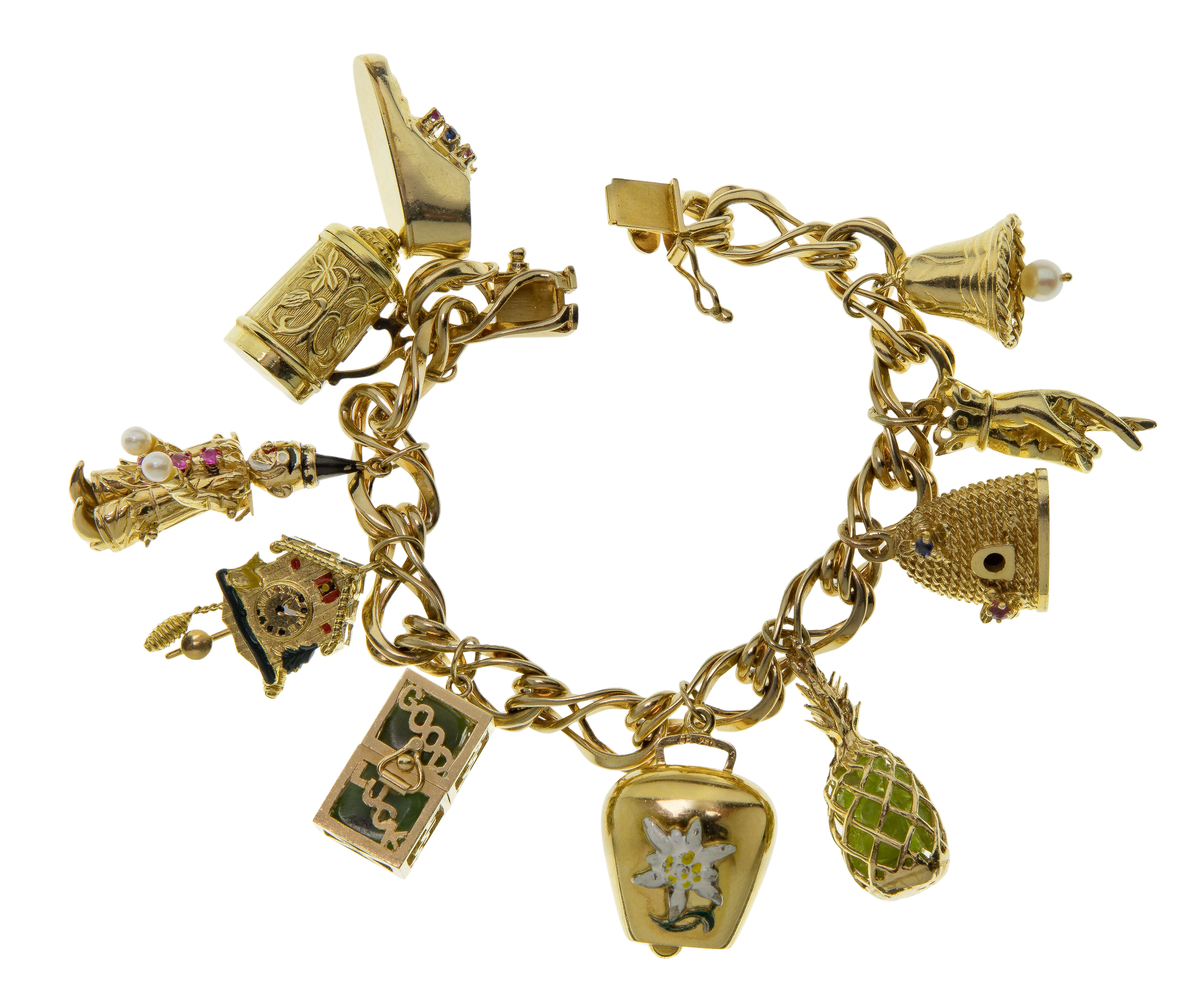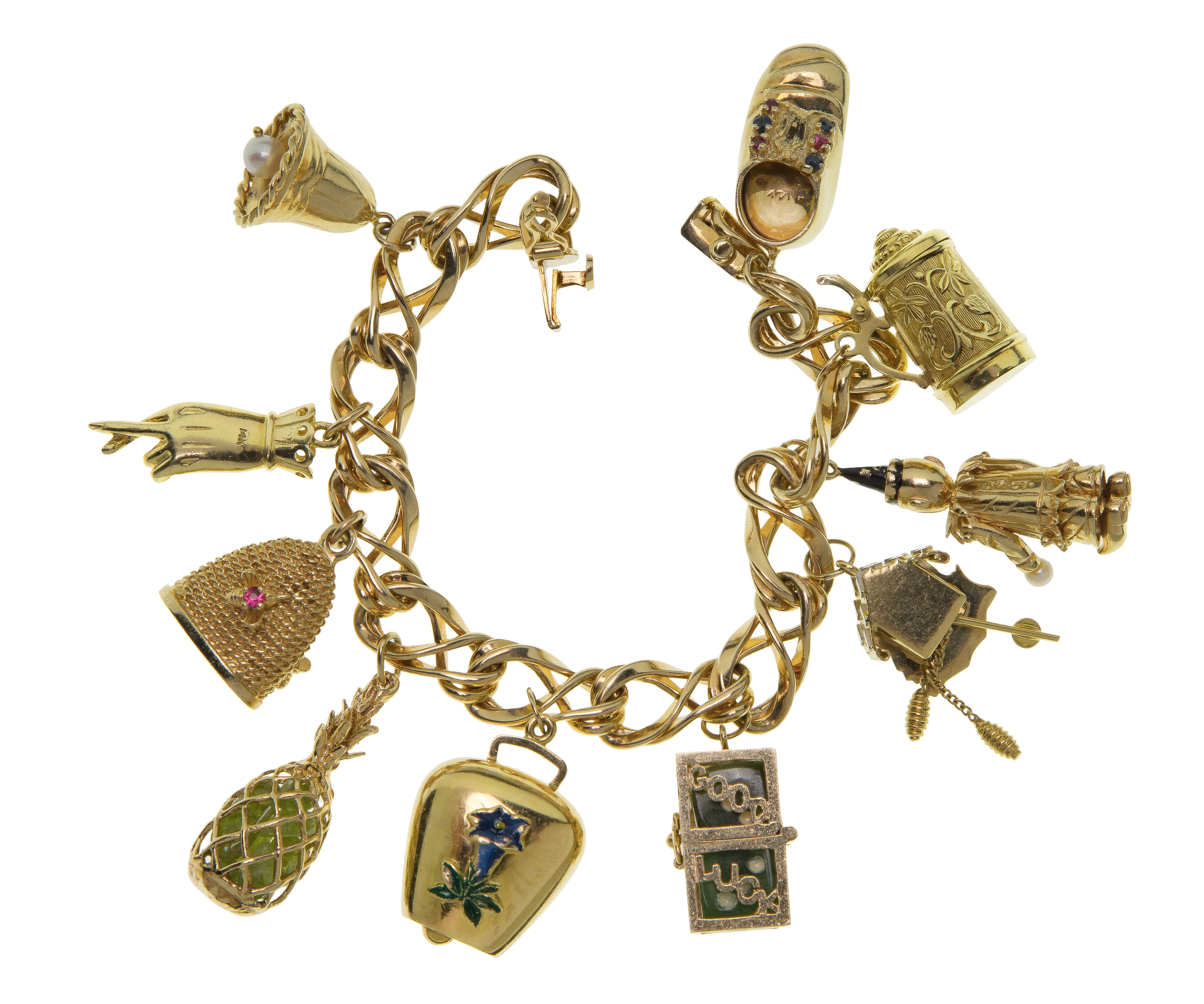A double link bracelet having (10) attached charms as well as (3) loose charms having movable parts and extra jump rings (most marked ‘750’ or ’14k’)