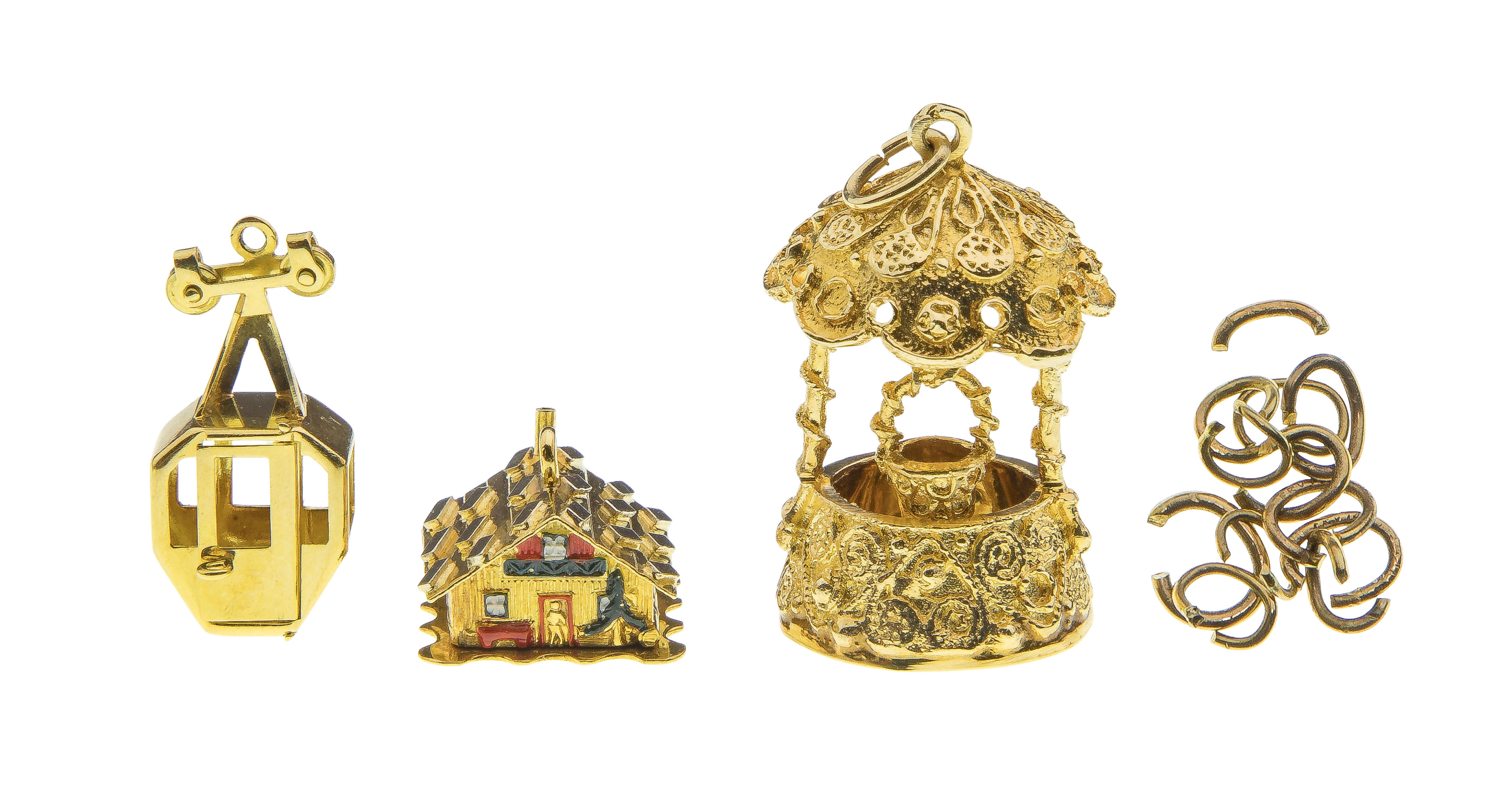 Condition: overall light wear consistent with use, some unmarked but cuckoo clock and cabin XRF tested as 18k gold, bell and well XRF tested as 14k gold
