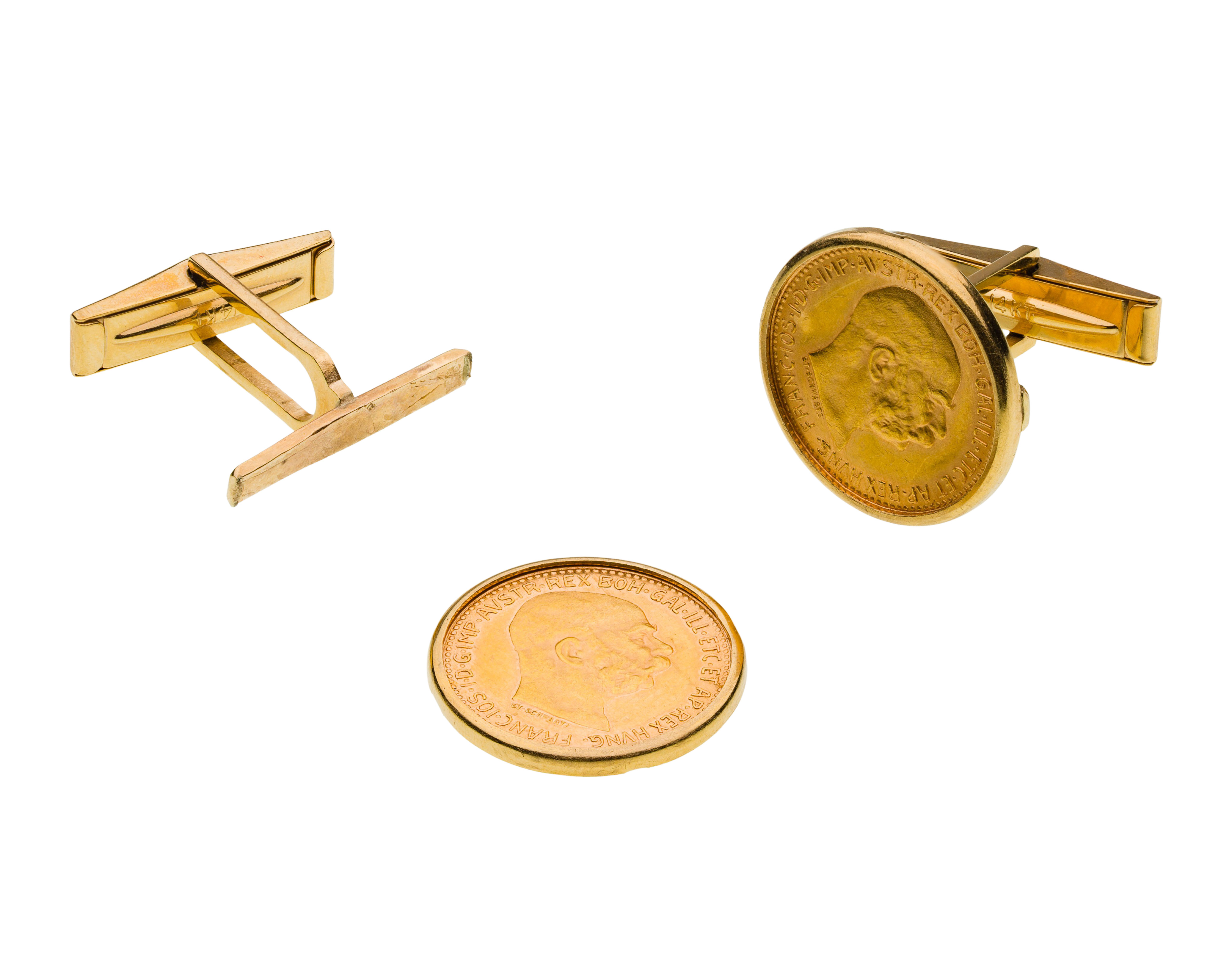 A pair of Austrian Franc cufflinks (hardware marked ’14k’, coin unmarked 22k)
