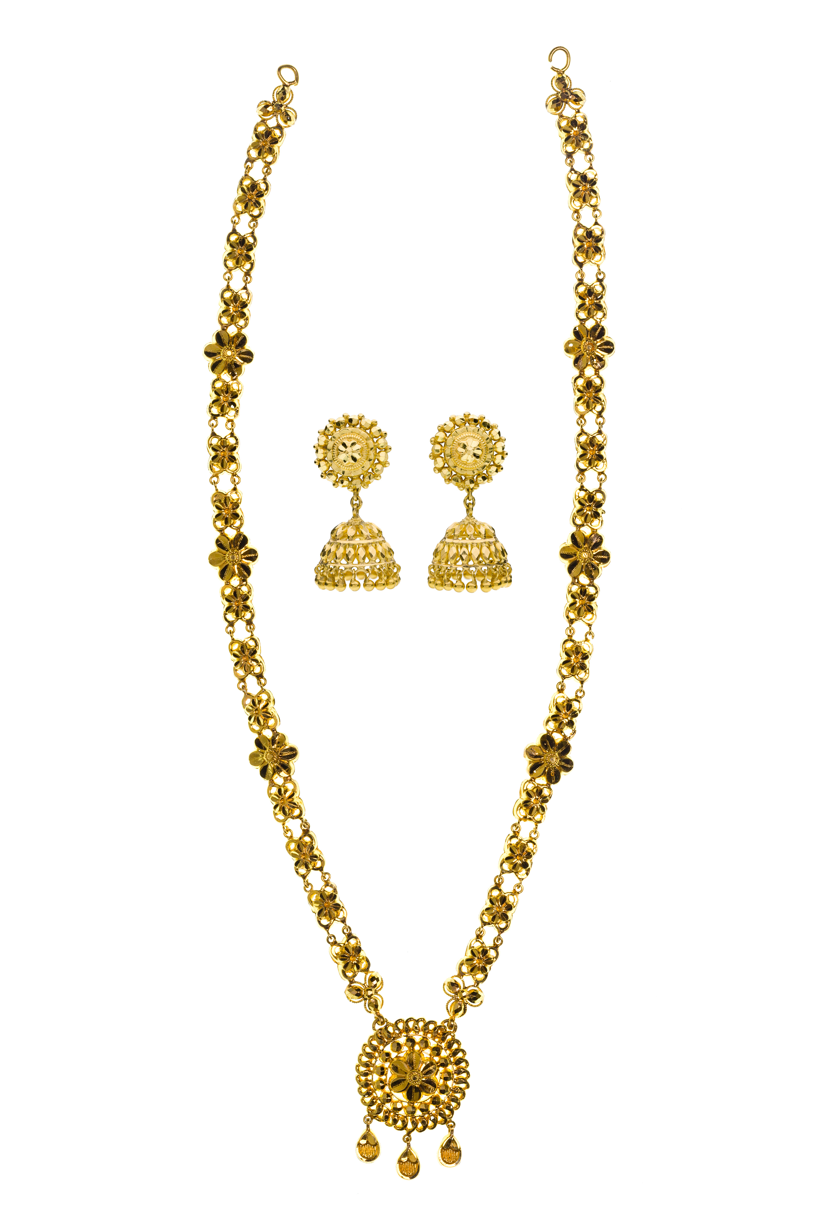 (2) items including a floral motif link necklace having center medallion (necklace marked ’23c’ and ’21c’) and a pair of Jhumki pierced earrings