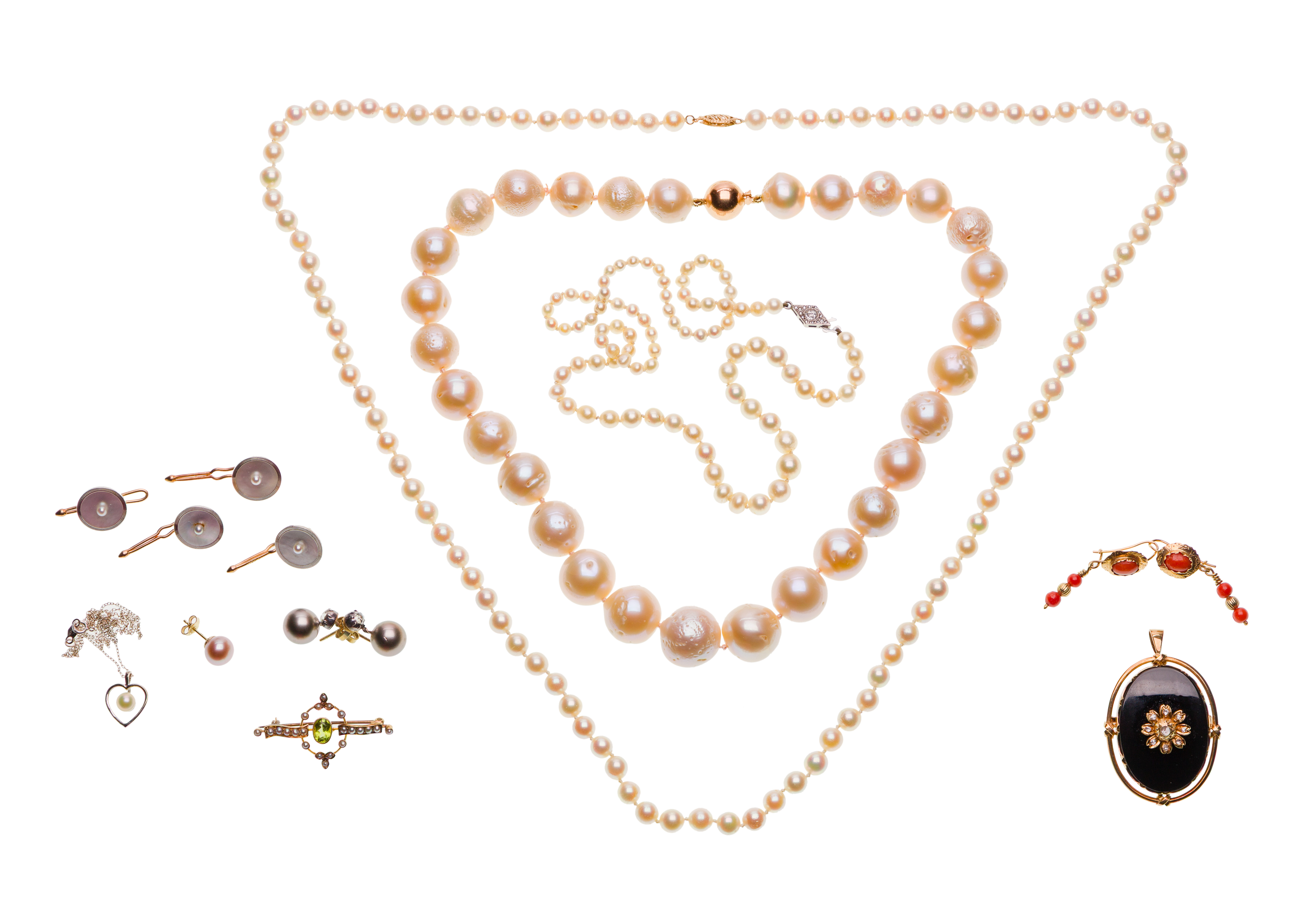 (13) items including a set of (4) tuxedo studs, (3) pearl necklaces, (2) pairs of pierced earrings, a single earring, (2) pendants and a pin (most marked ’14k’ / ‘585’)