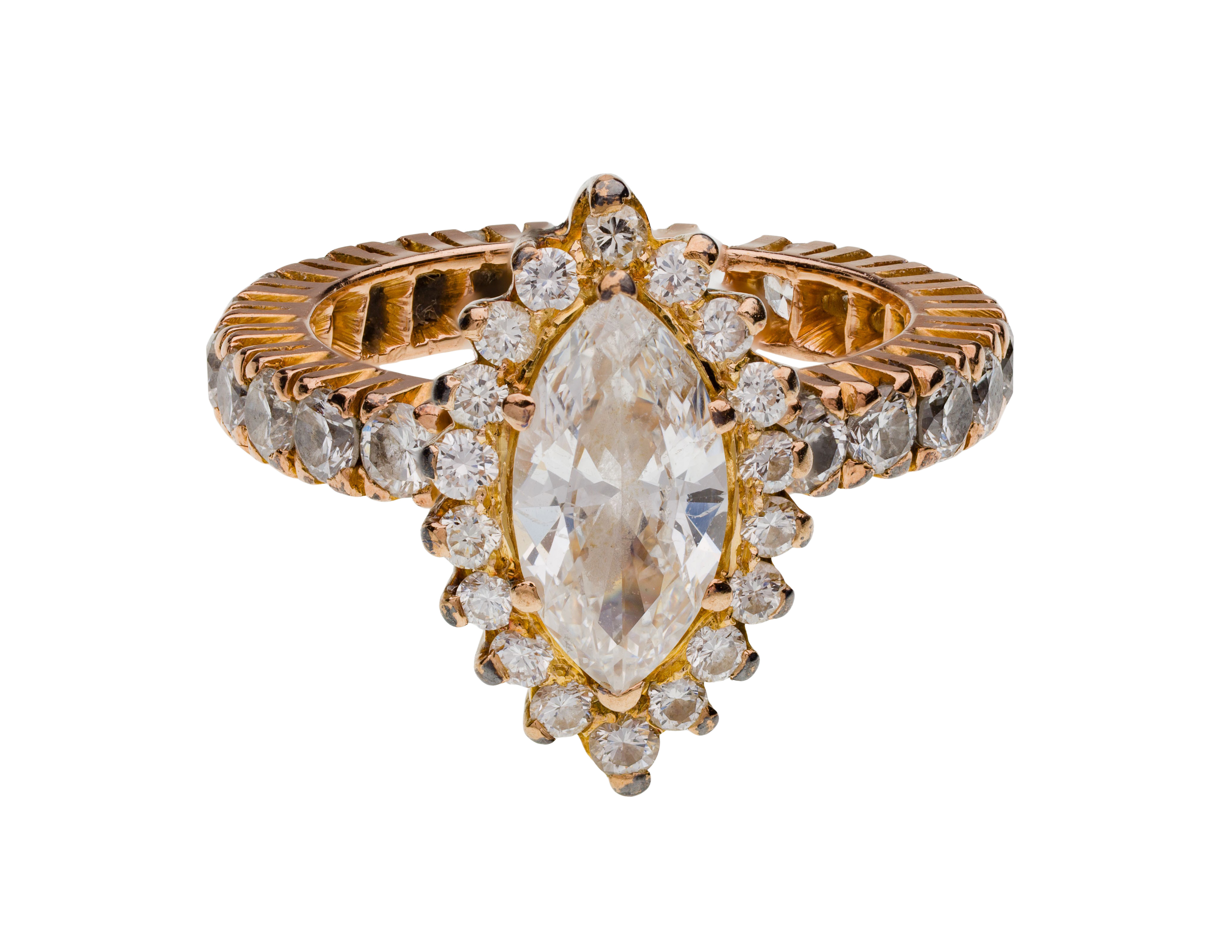 A marquise cut center diamond, approximately 0.93 carat (10.39 x 5.17 x 2.75mm), I/J color, SI clarity, surrounded by round cut diamonds on an eternity band (unmarked 12k)