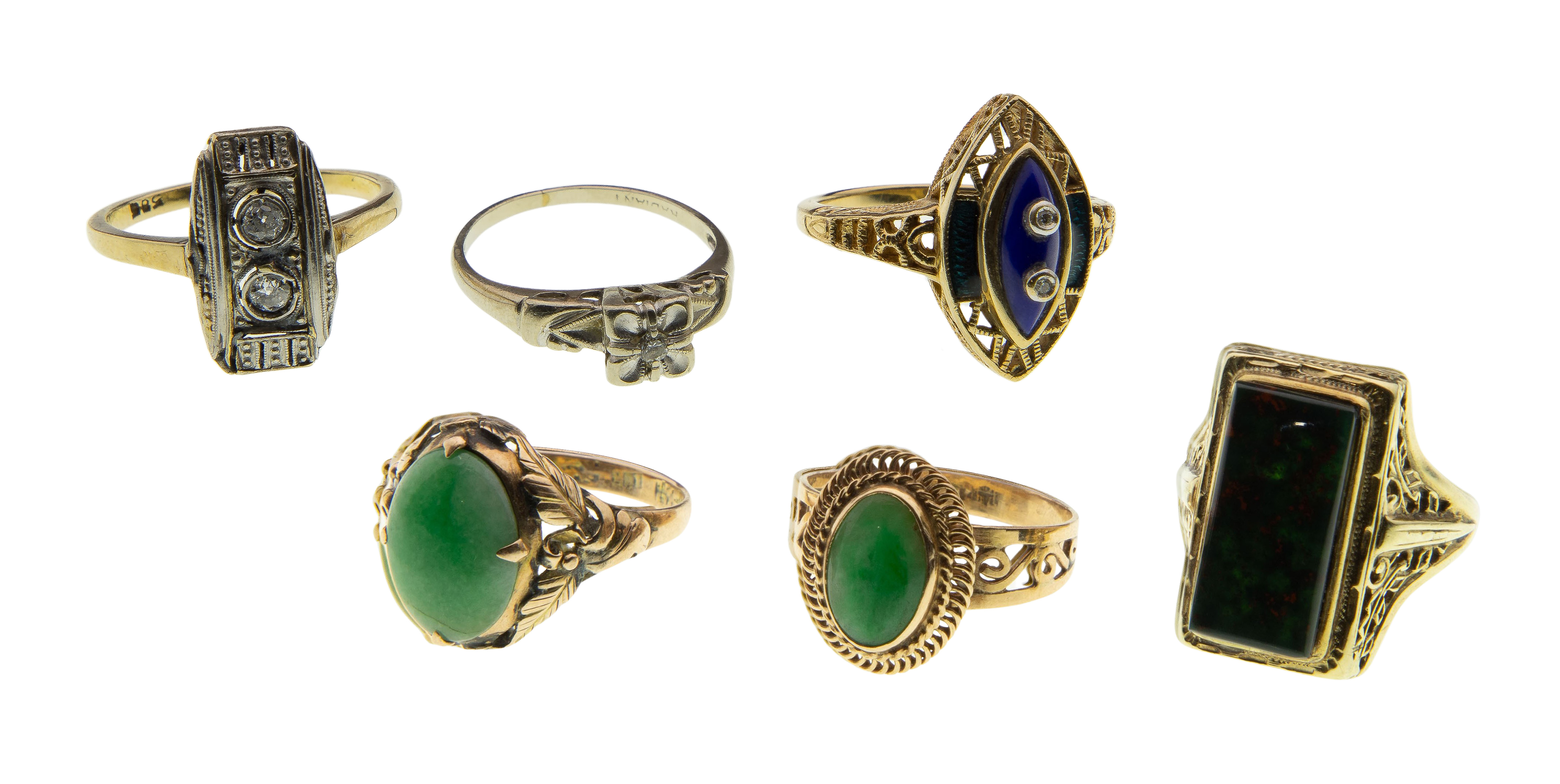 (6) rings including a diamond accented promise ring, a Victorian style having two round cut diamond, a blue stone accented by round diamonds, (2) oval jadeite jade and a rectangular gemstone (some marked ’14k’)